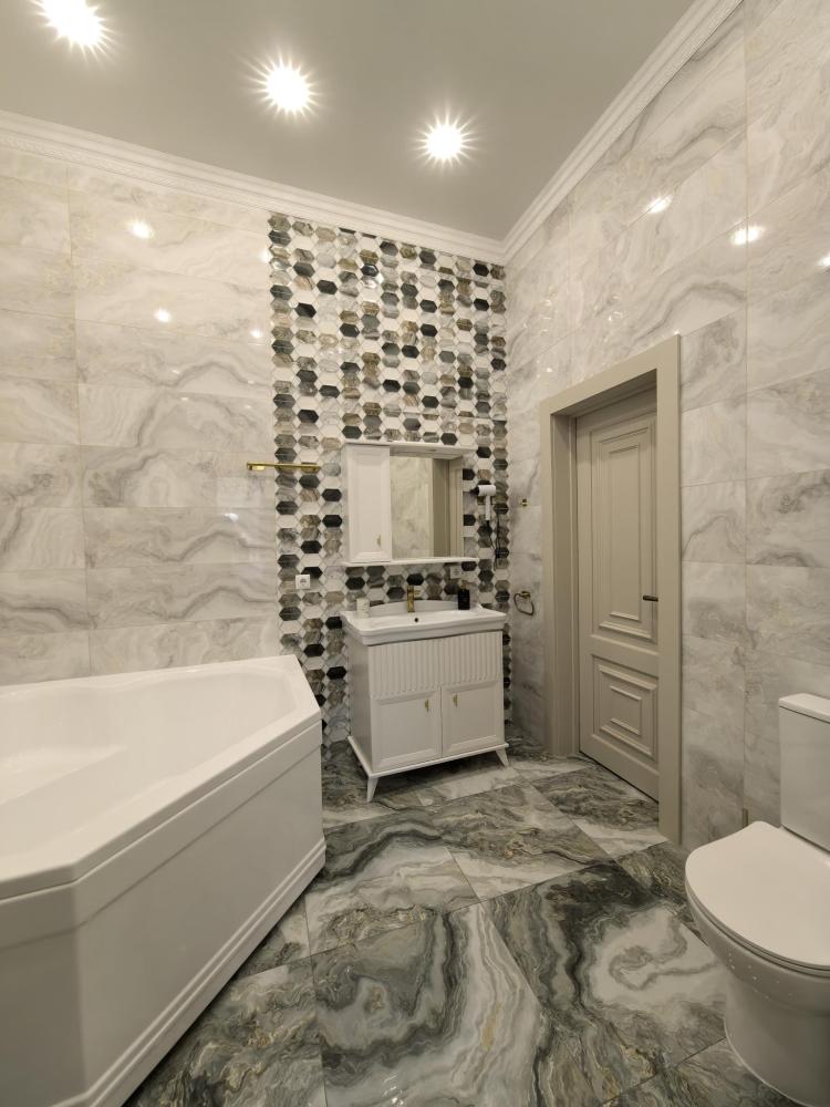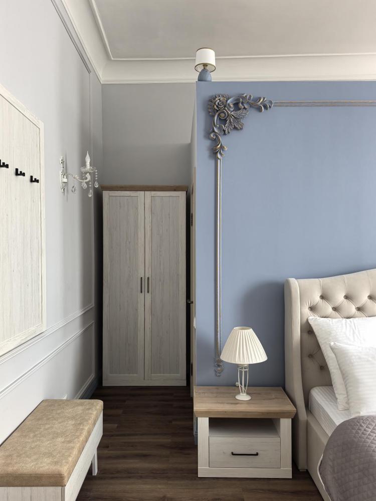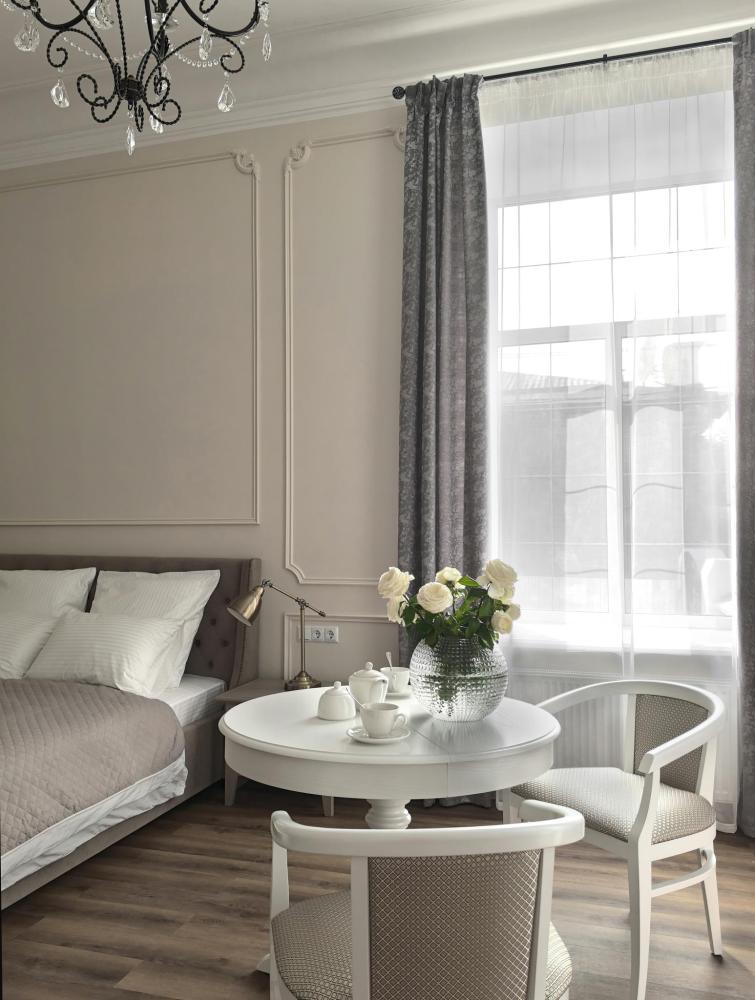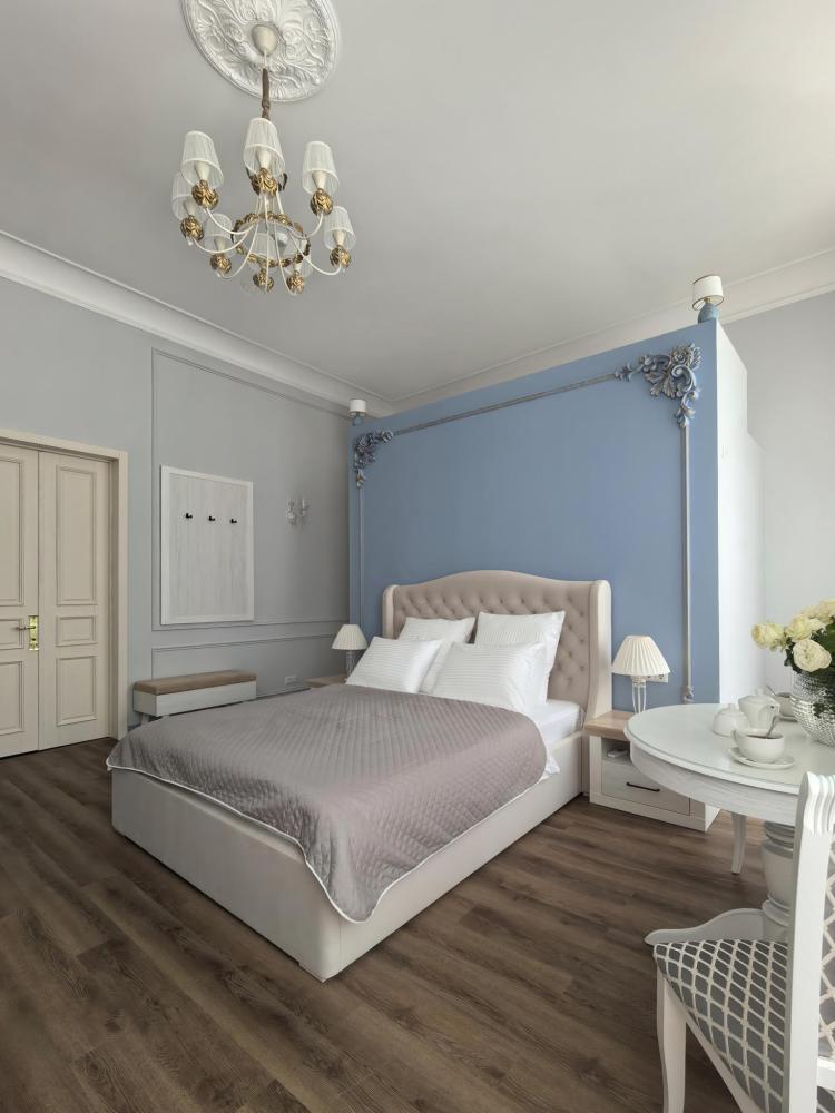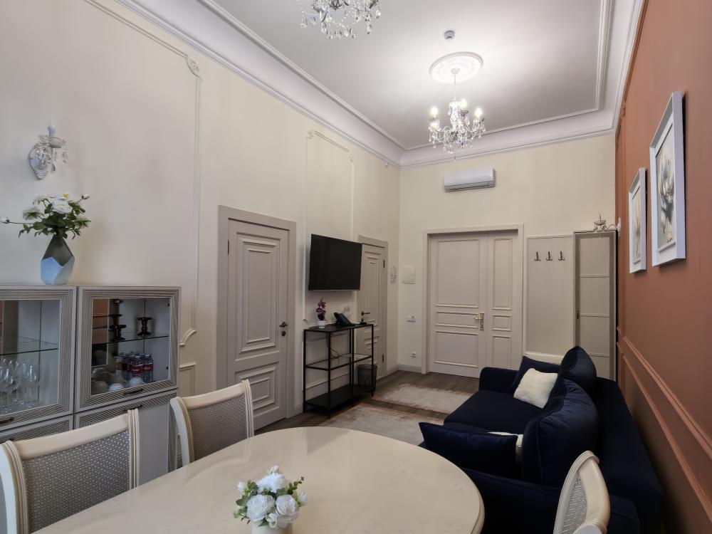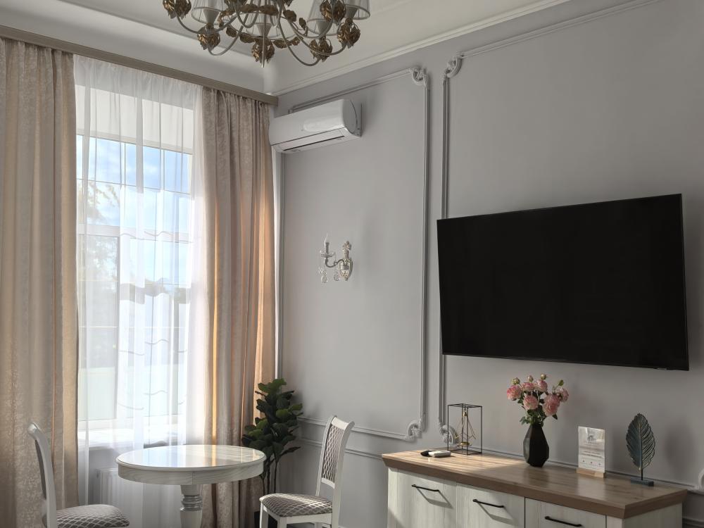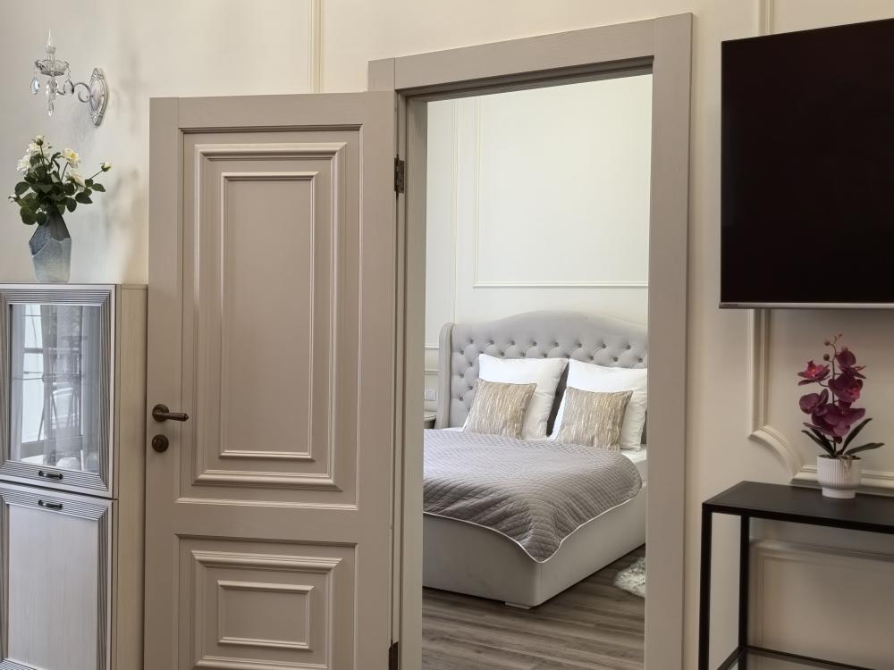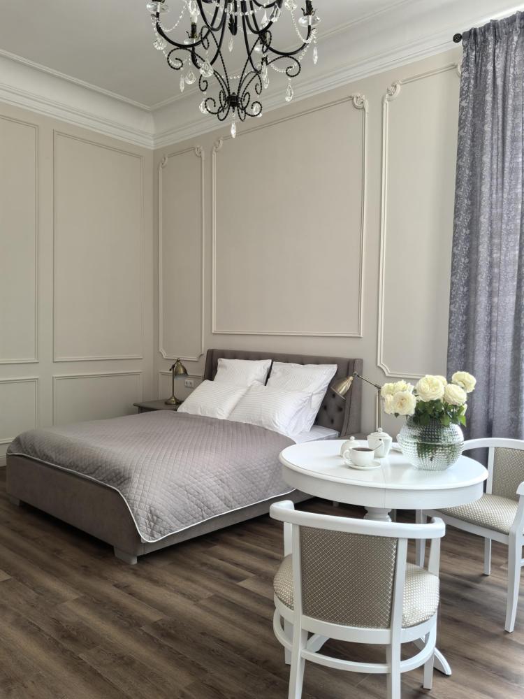 В номере двуспальная кровать и диван на два спальных места. Функциональное наполнение номера: ТВ, Wi-Fi, кондиционер, чайник, комплект чашек, стаканов и бокалов, чайный набор, бутилированная питьевая вода негазированная. Набор полотенец, халаты, тапочки, фен, основные туалетные принадлежности: гель, шампунь, зубной набор.
