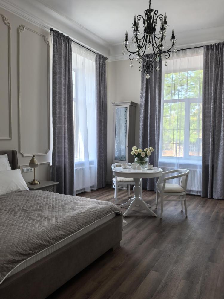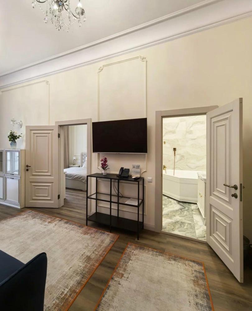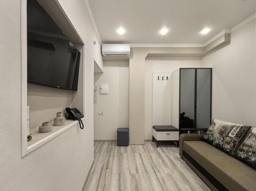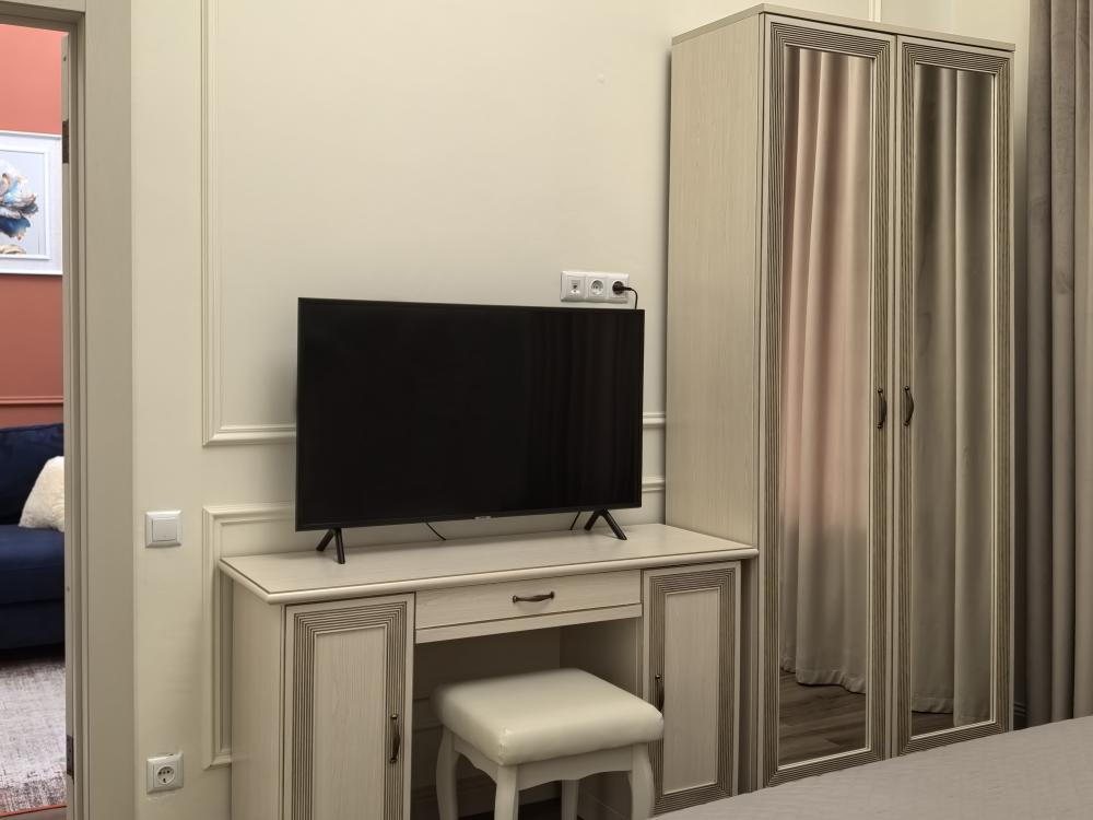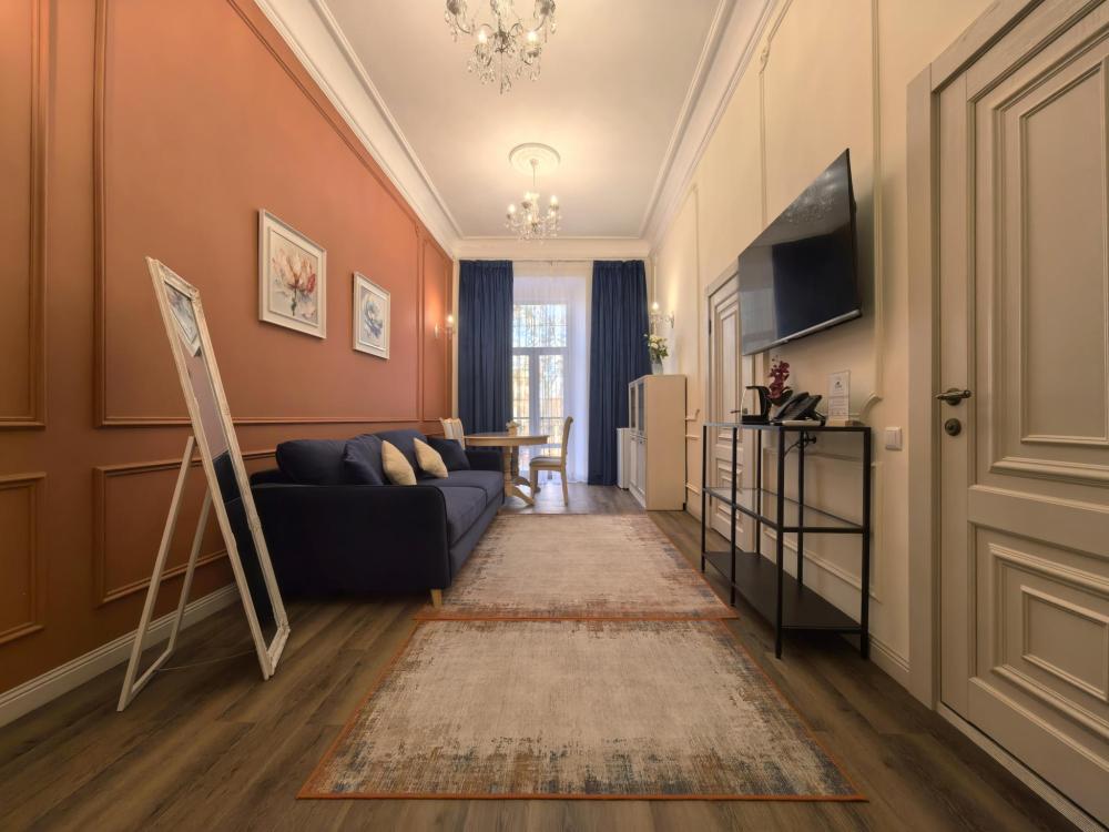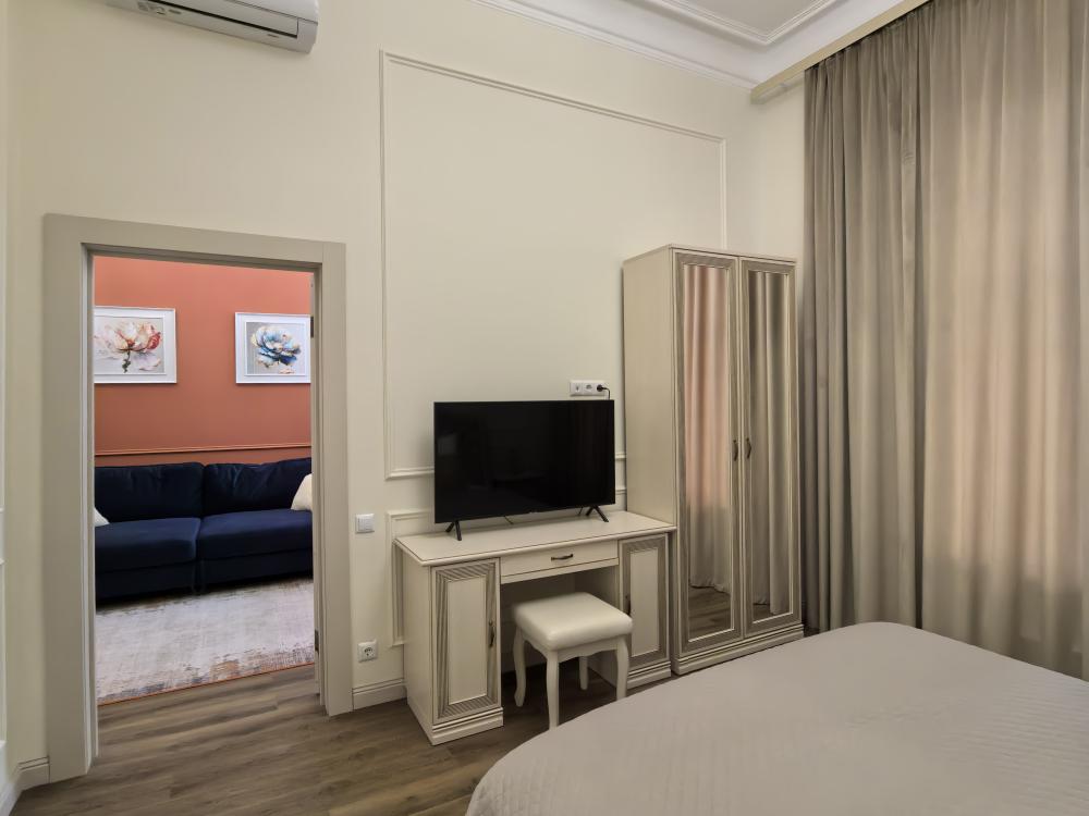Номере оборудован зоной для чаепития, рабочим местом. В номере: двуспальная кровать и диван на два спальных места. Функциональное наполнение номера: ТВ, Wi-Fi, кондиционер, чайник, комплект чашек, стаканов и бокалов, чайный набор, бутилированная питьевая вода негазированная. Душевая и ванная, набор полотенец, халаты, тапочки, фен, основные туалетные принадлежности: гель, шампунь, зубной набор.