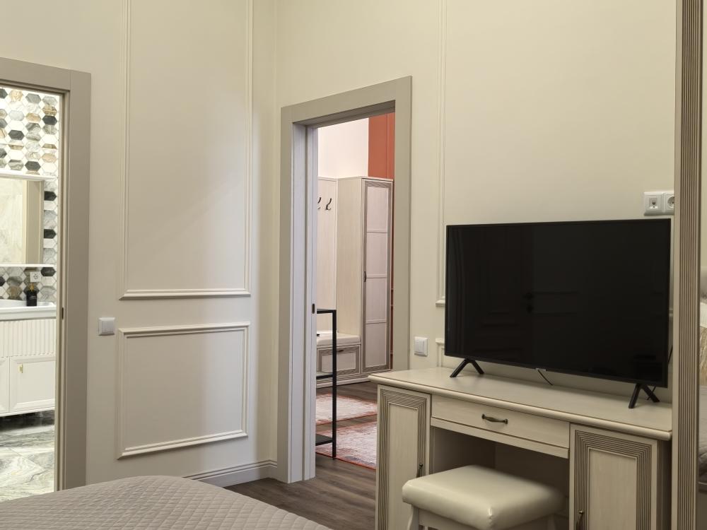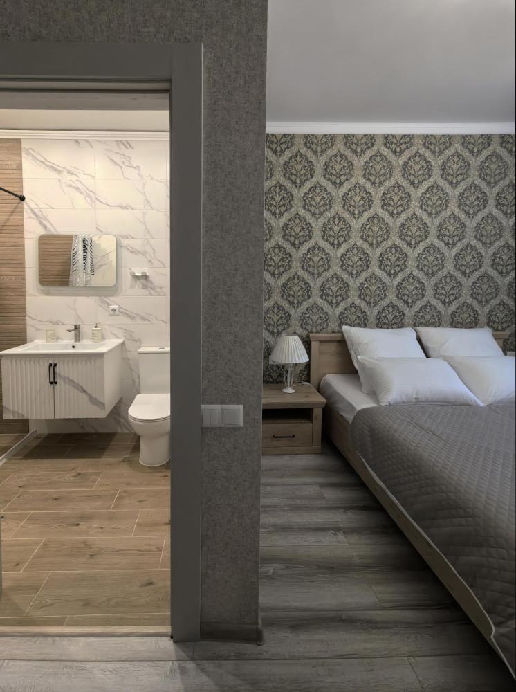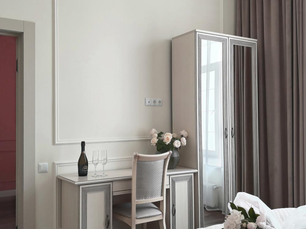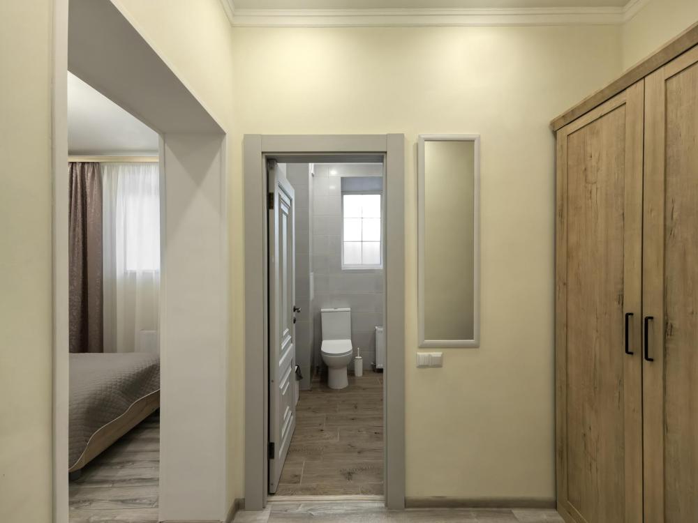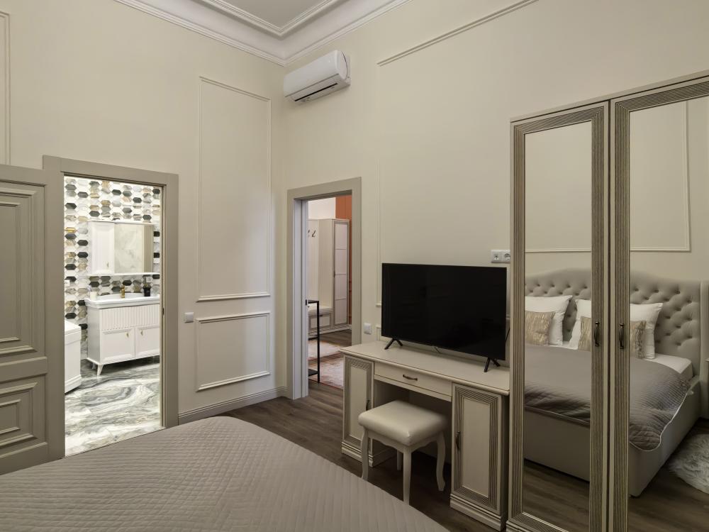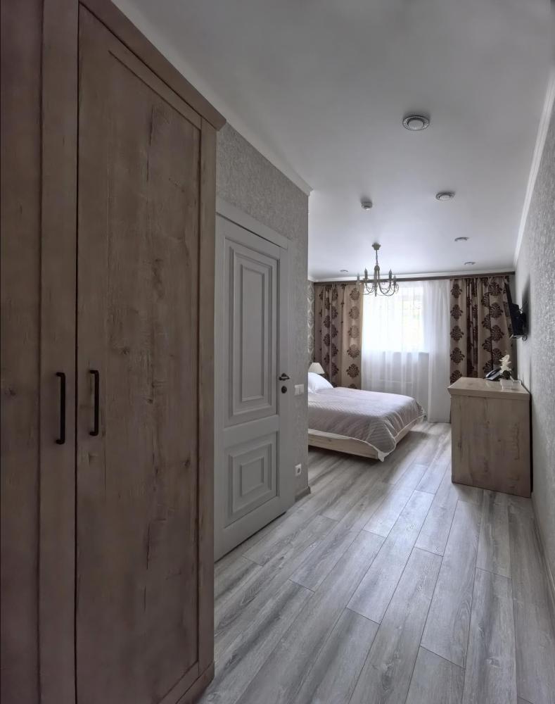 Номере оборудован зоной для чаепития, рабочим местом. В номере: двуспальная кровать и диван на два спальных места. Функциональное наполнение номера: ТВ, Wi-Fi, кондиционер, чайник, комплект чашек, стаканов и бокалов, чайный набор, бутилированная питьевая вода негазированная. Душевая и ванная, набор полотенец, халаты, тапочки, фен, основные туалетные принадлежности: гель, шампунь, зубной набор.