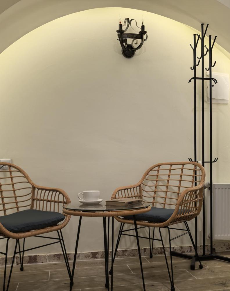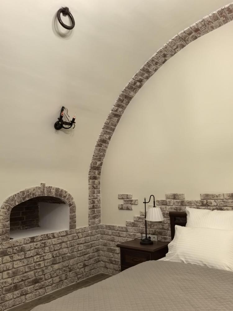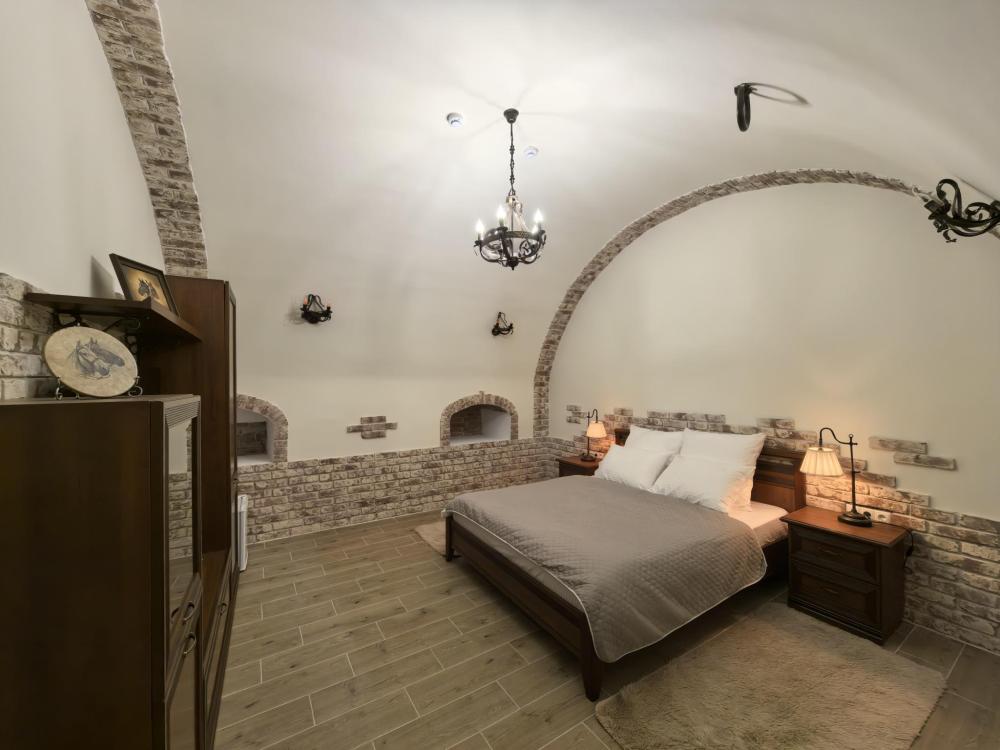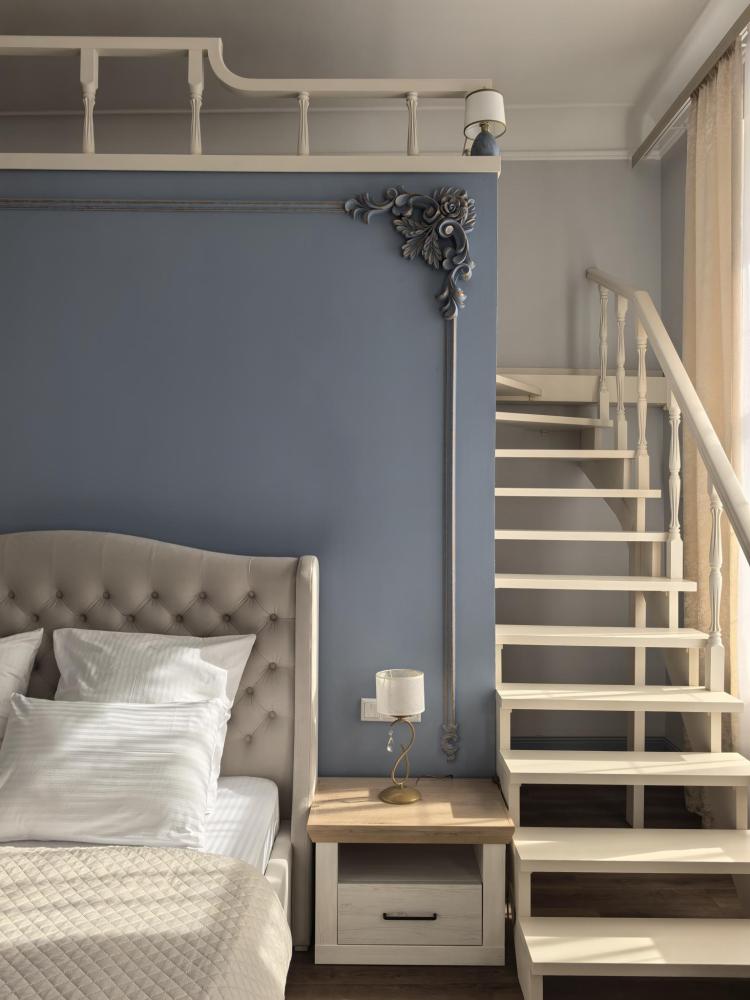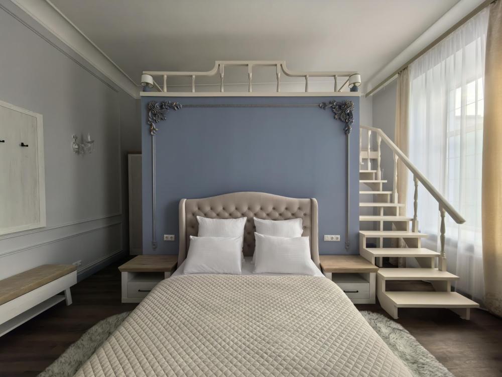 Номере оборудован зона для чаепития, рабочим местом. В номере двуспальная кровать, двуспальной нишей на 2-ом этаже. Функциональное наполнение номера: ТВ, Wi-Fi, кондиционер, чайник, комплект чашек, стаканов и бокалов, чайный набор, бутилированная питьевая вода негазированная. Набор полотенец, халаты, тапочки, фен, основные туалетные принадлежности: гель, шампунь, зубной набор.