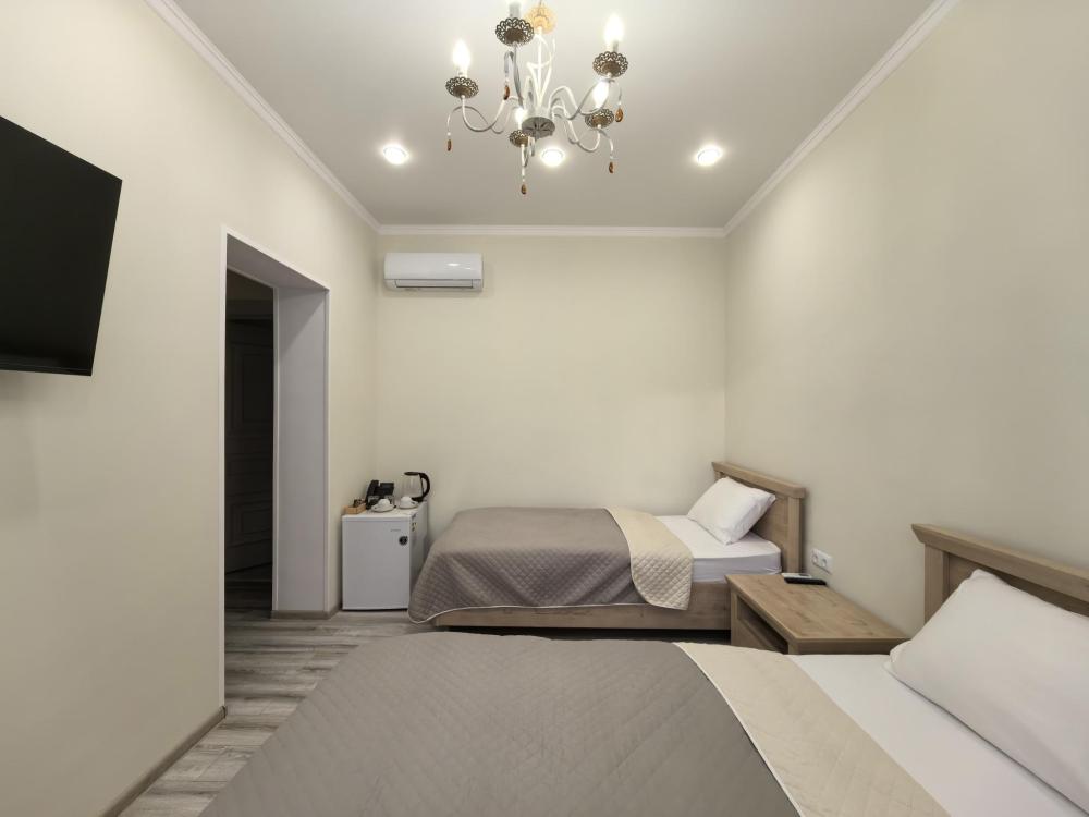 В номере два вида спального места: одна двуспальная кровать и одна односпальная кровать. Функциональное наполнение номера: ТВ, Wi-Fi, кондиционер, чайник, комплект чашек и стаканов, чайный набор, бутилированная питьевая вода негазированная. Ванная комната: набор полотенец, халаты, тапочки, фен, основные туалетные принадлежности: гель, шампунь, зубной набор.