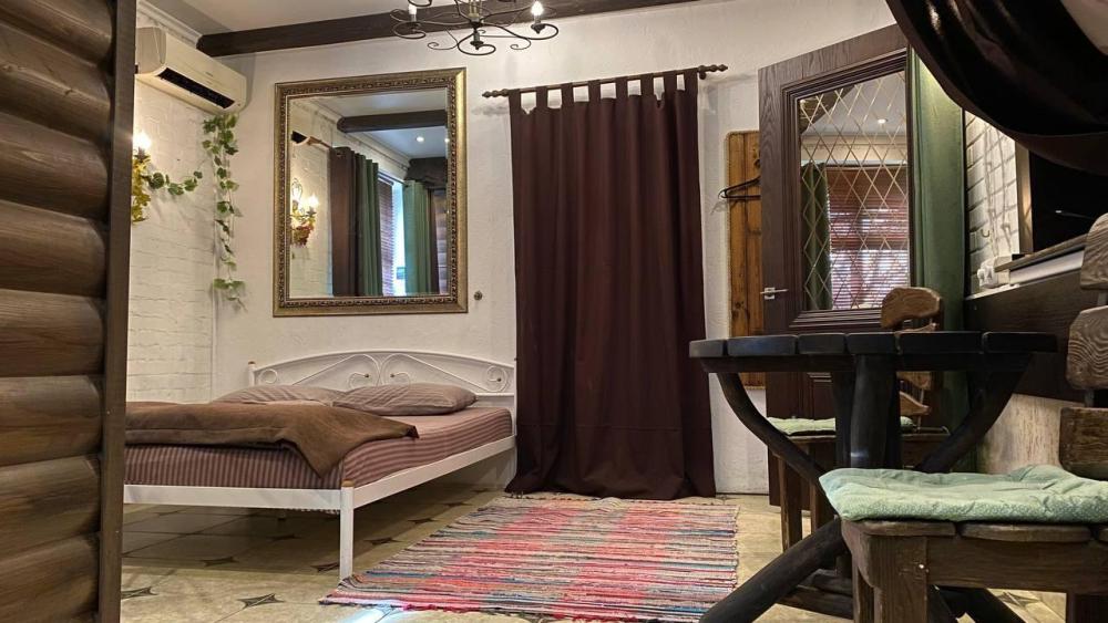 Отдельный двухкомнатный номер с комнатой отдыха и собственной баней. Оснащен: комната отдыха с диваном и столом, баня с душевой, спальня с двуспальной кроватью и раскладным полуторным диваном, ТВ, холодильник, кондиционер, доп. с/у с душем, собственная кухонная зона. Свежее постельное белье и полотенца. Дополнительно отдельный выход во двор.