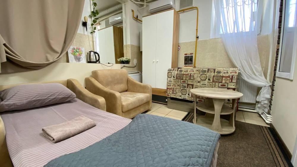 Отдельный номер с полуторным диваном и креслом. Оснащен: ТВ, кондиционер, с/у с душем, свежее постельное белье и полотенца.