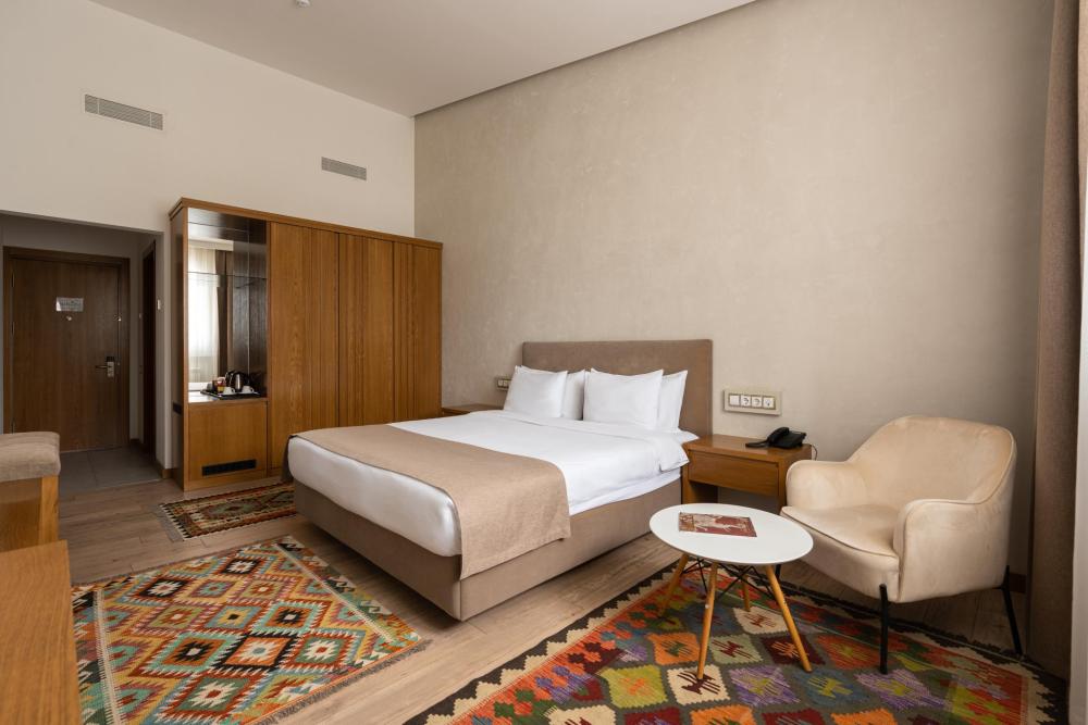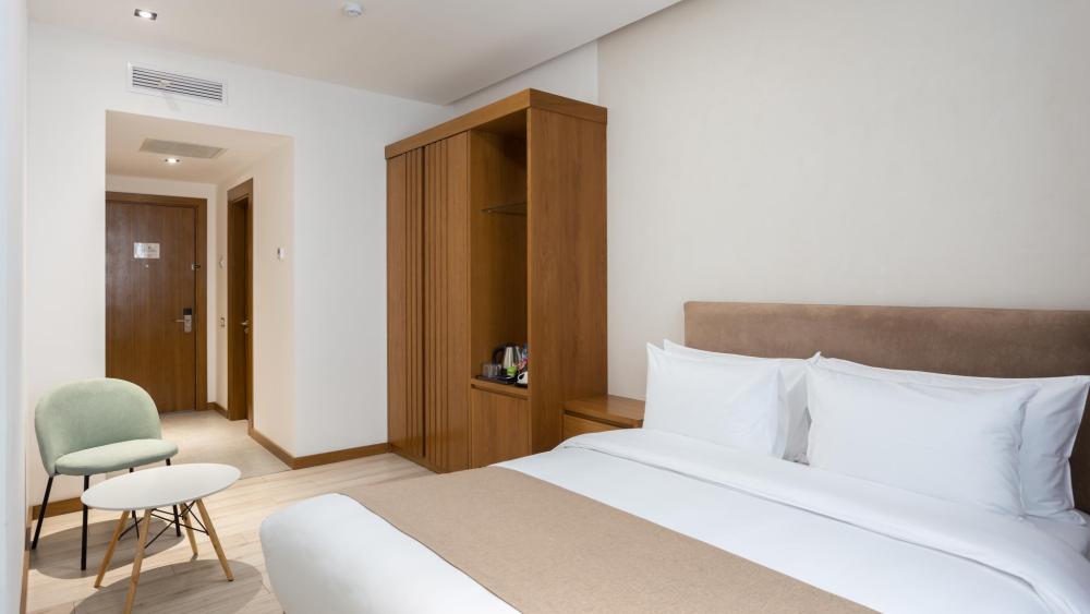 Двухместный номер с двуспальной кроватью и балконом. Номер оснащен телевизором, местом для хранения одежды, рабочим местом, ванной комнатой, предоставляются туалетно-косметические принадлежности.