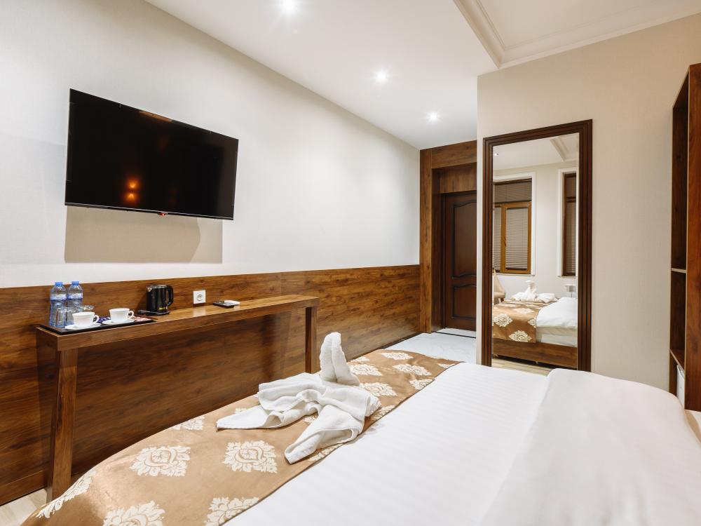 Трехместные номера имеют следующее оснащение: дизайнерская мебель; WI-FI; телевизор; кондиционеры; электронныйчайник; фен; комплект полотенец; набор для приготовления чай, кофе и сахар.