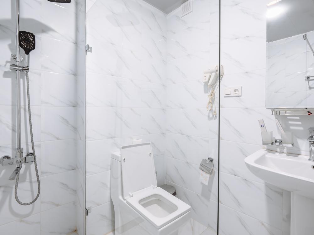 В номере: двуспальная кровать, кондиционер, телевизор, ванная комната с феном.