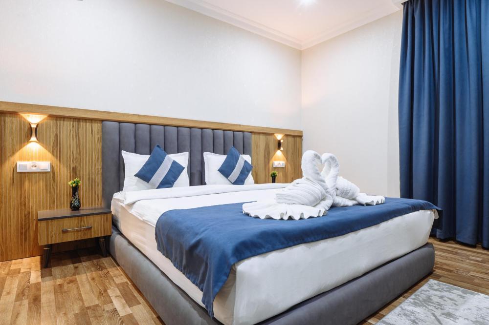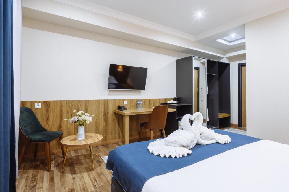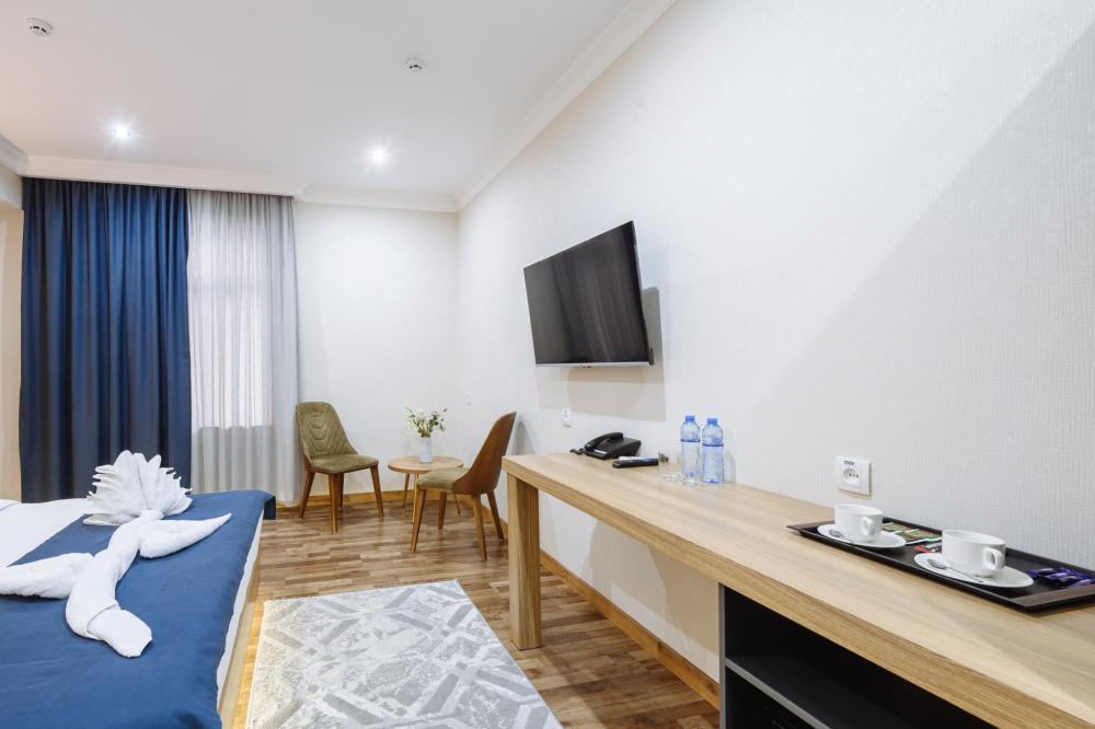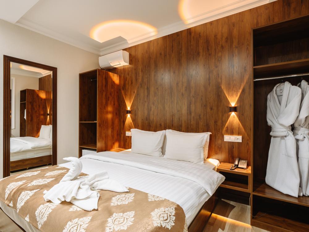 Люкс номера имеют следующее оснащение: дизайнерская мебель; WI-FI; телевизор; кондиционеры; электрочайник; фен; комплект полотенец; набор для приготовления чай, кофе и сахар.