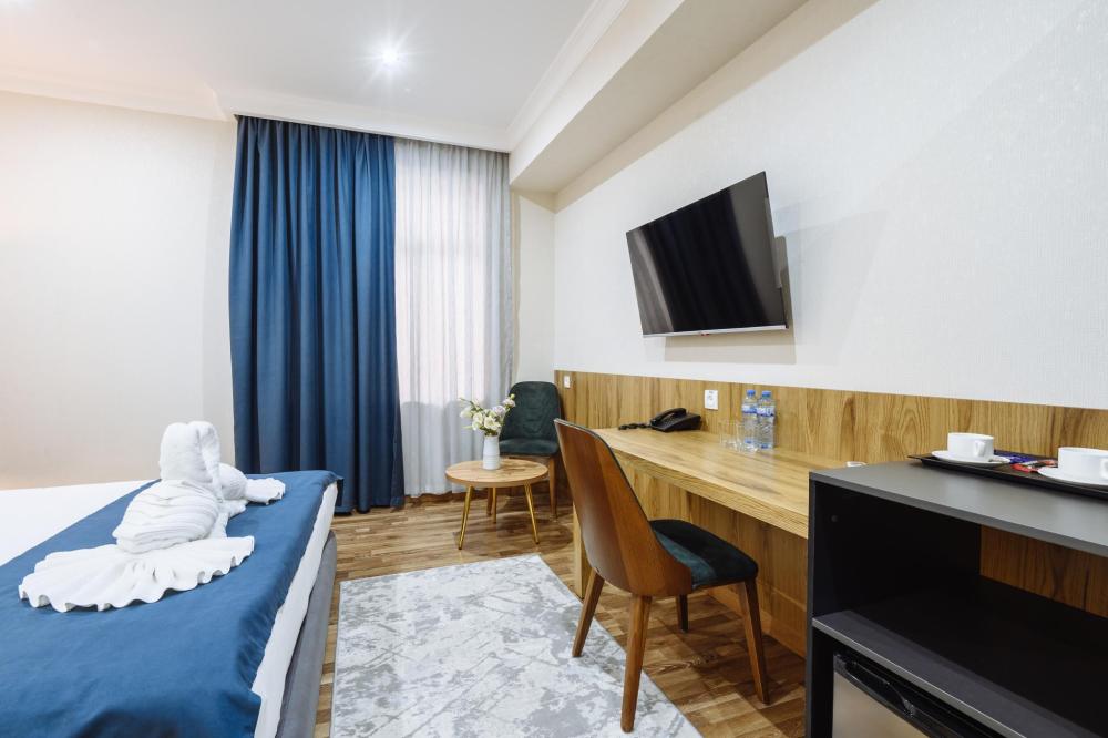 В номере двуспальная кровать или две односпальные, телевизор, кондиционер, рабочий стол, шкаф, ванная комната, фен.