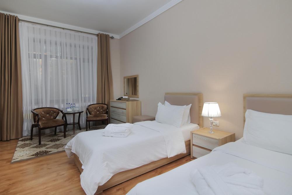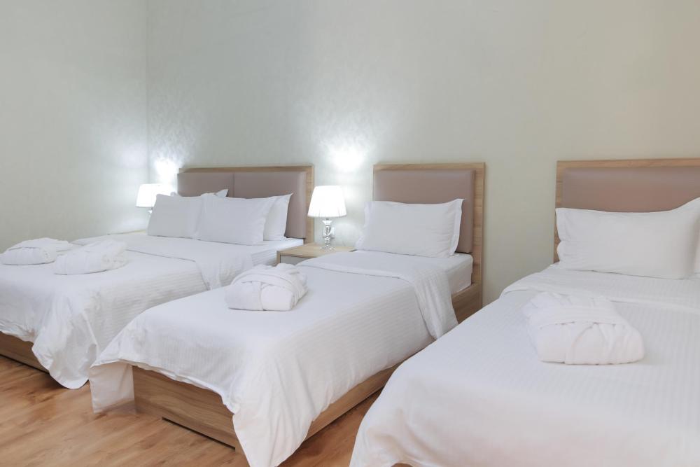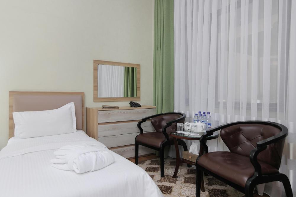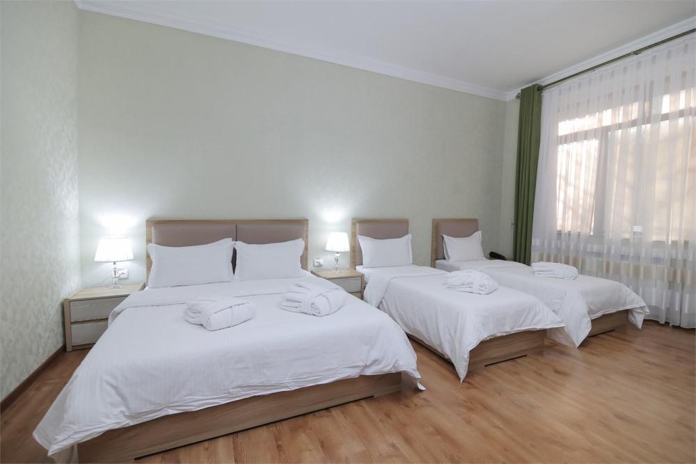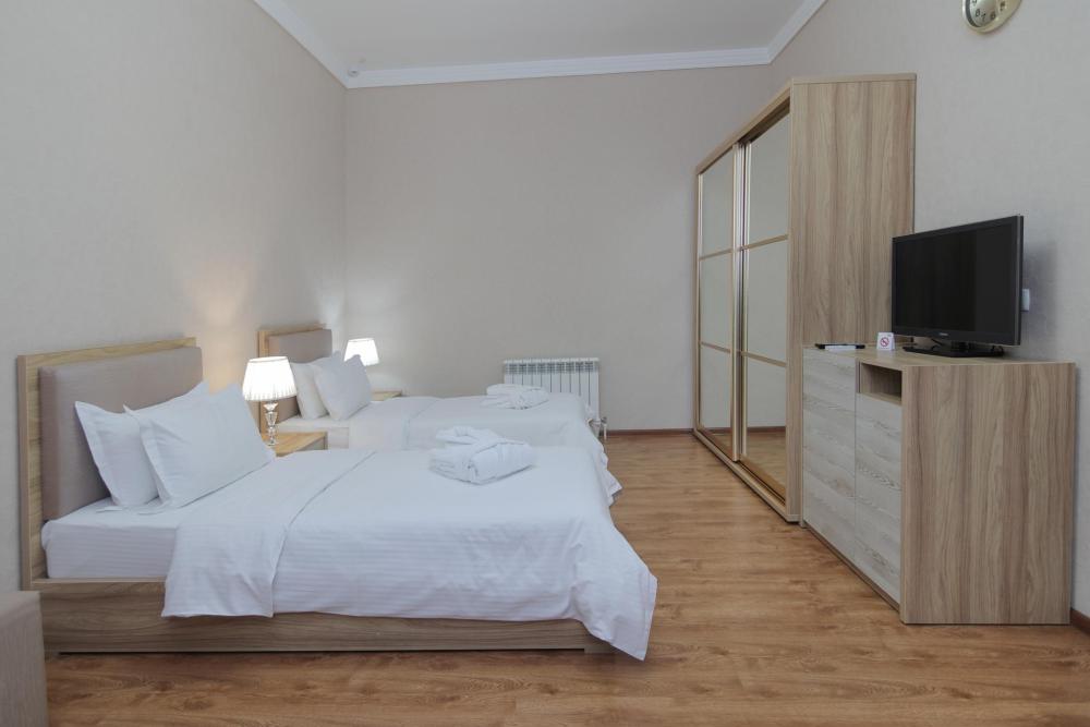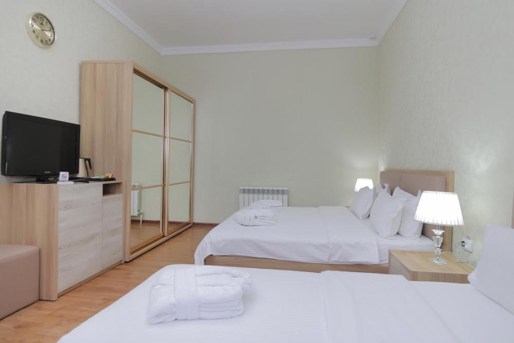 Номер категории «Стандарт» площадью от 60 кв.м. В номере две односпальные кровати и одна двуспальная кровать. В номере бесплатный Wi-Fi, кондиционер, холодильник, LCD телевизор диагональю 42", бутилированная вода, набор для приготовления чая и кофе. В ванной комнате - душевая кабина, комплект полотенец, набор для личной гигиены (шампунь, мыло, гель для душа), фен.