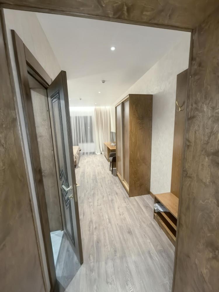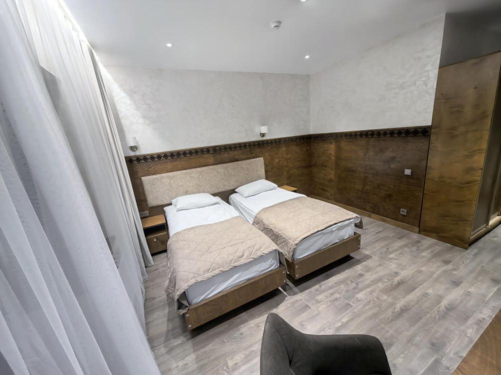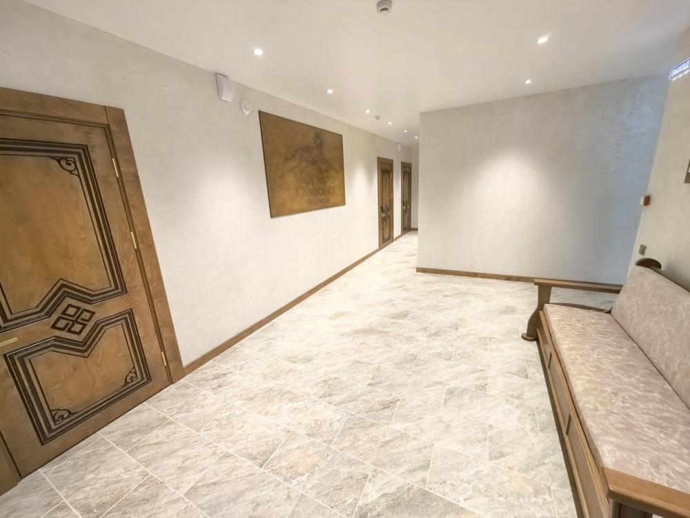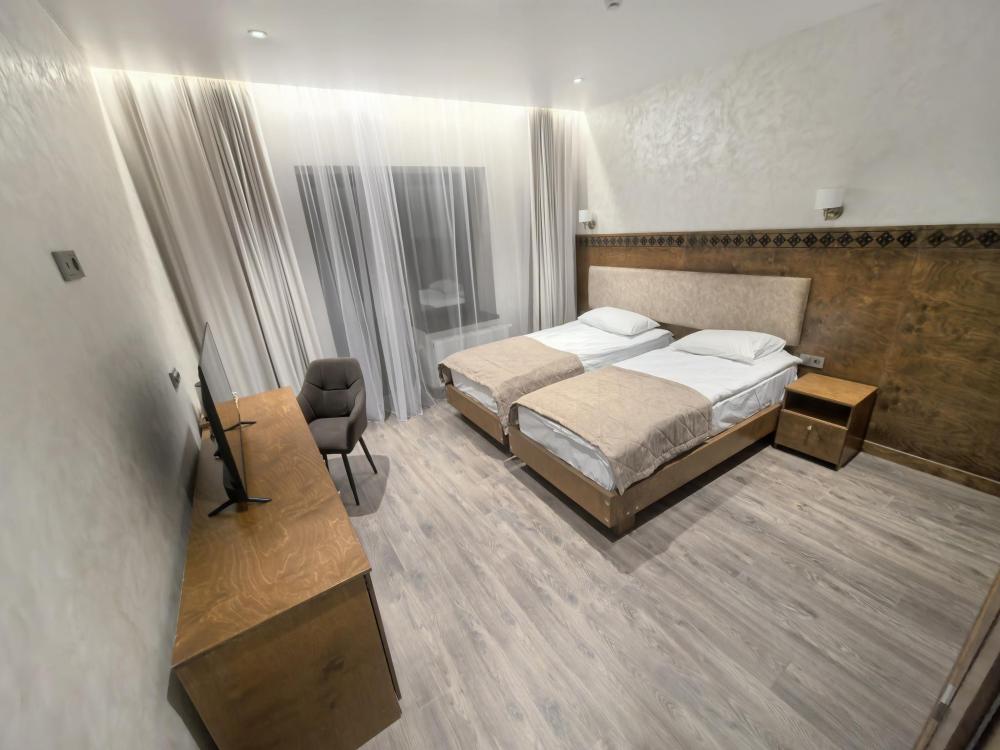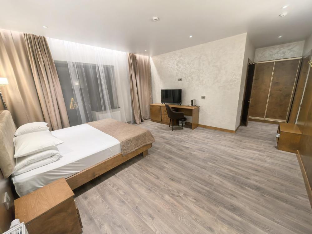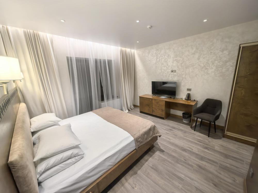 Полулюкс без балкона площадью 32 кв.м с видом на горы и двор. Подходит для размещения 2 человек. Имеет спальню с приятным интерьером. В номере: 1 двуспальная кровать, телевизор, отопление, шкаф, вешалка, зеркало, рабочий стол, чайник, холодильник, стулья, фен, индивидуальная ванная комната (душ, раковина, туалет). Гостям предоставляется постельное бельё, полотенца, ванные принадлежности (шампунь, гель для душа, мыло, зубной набор).