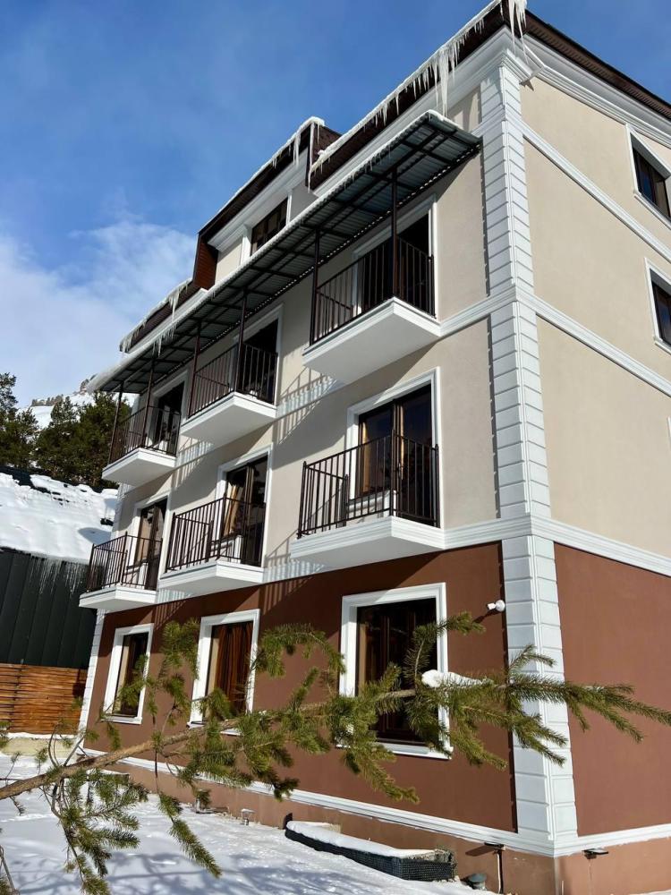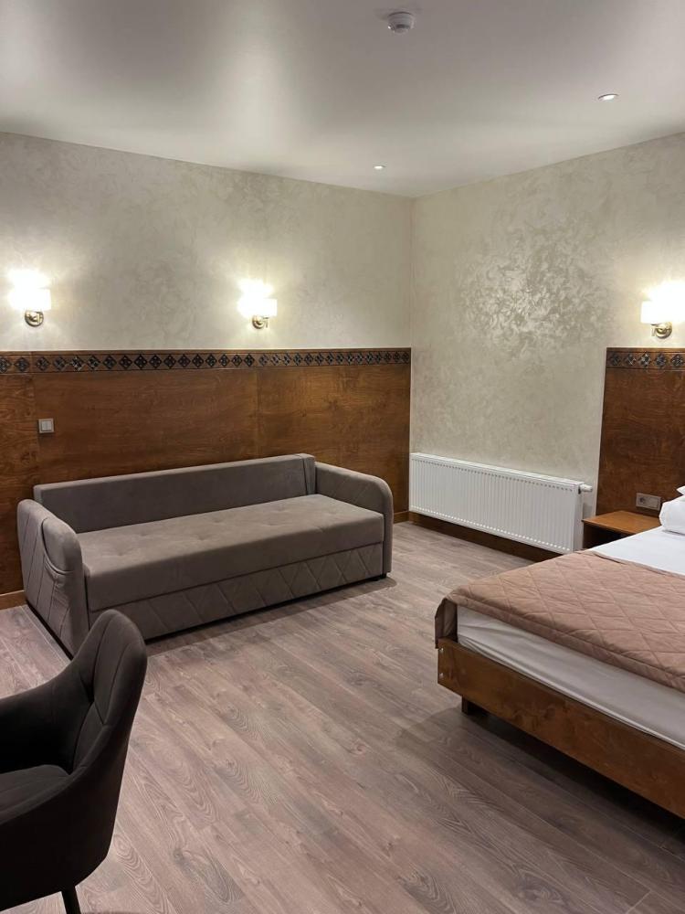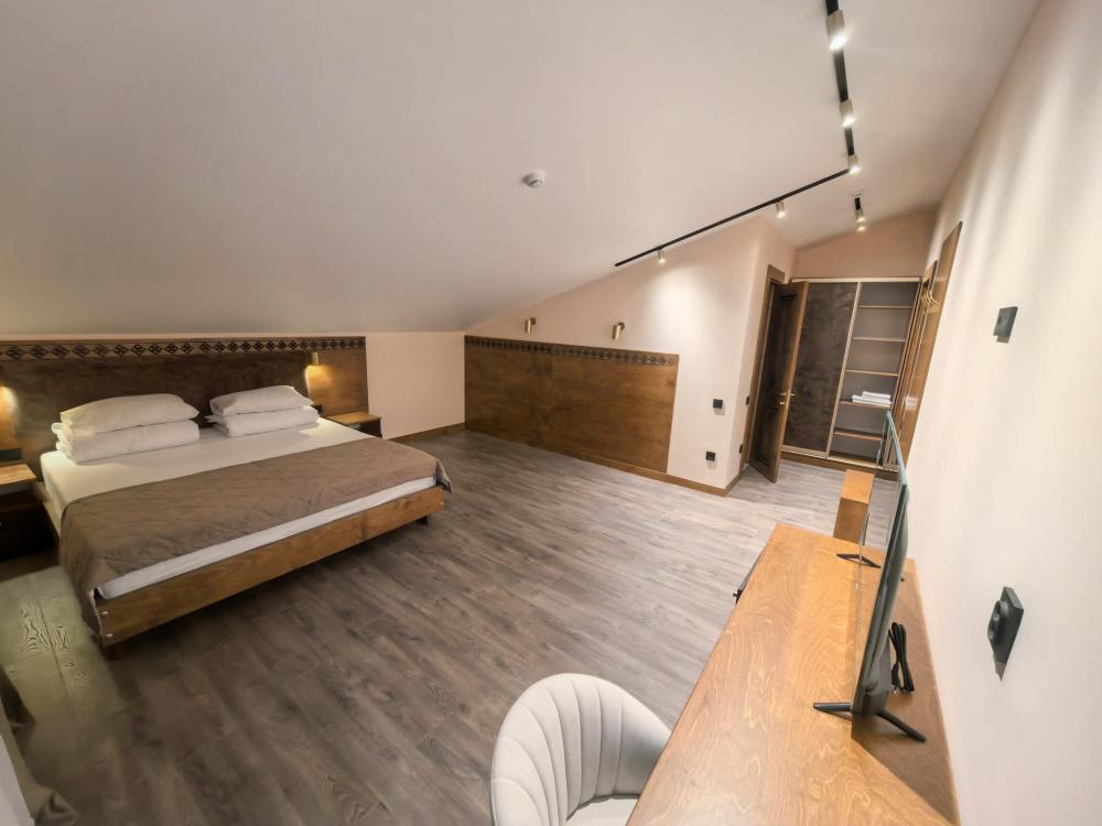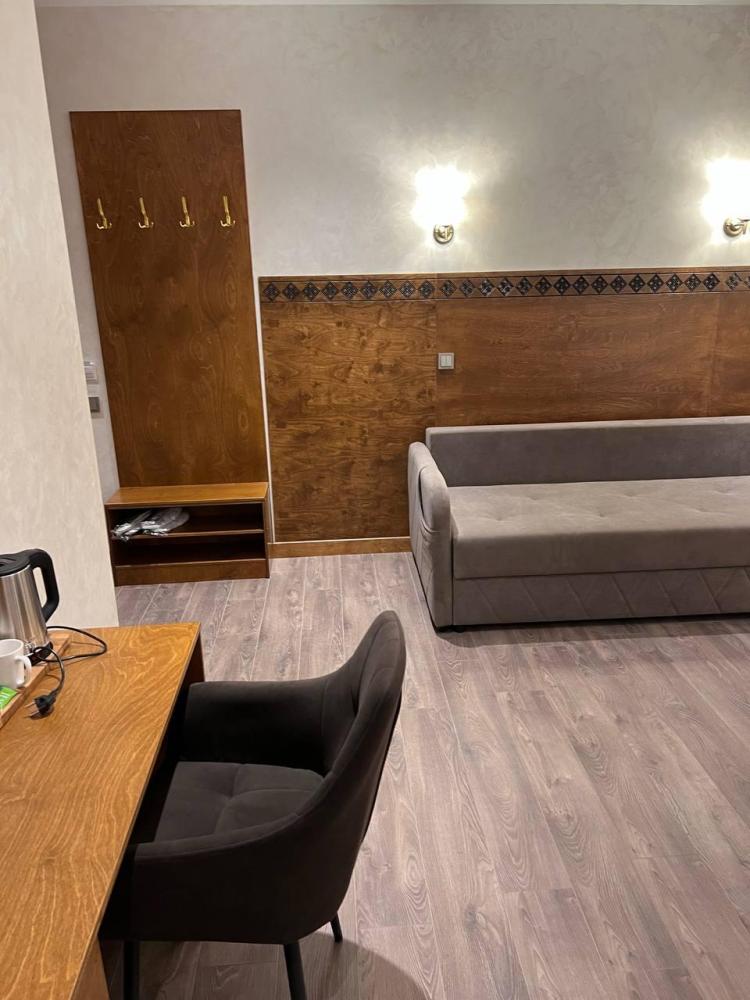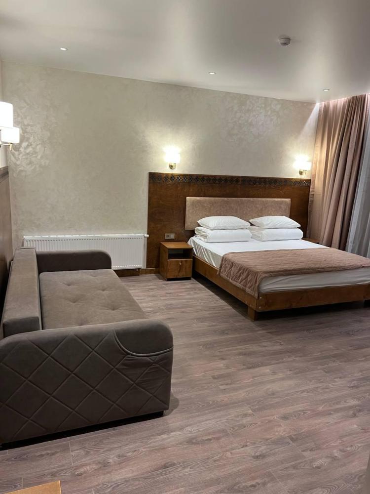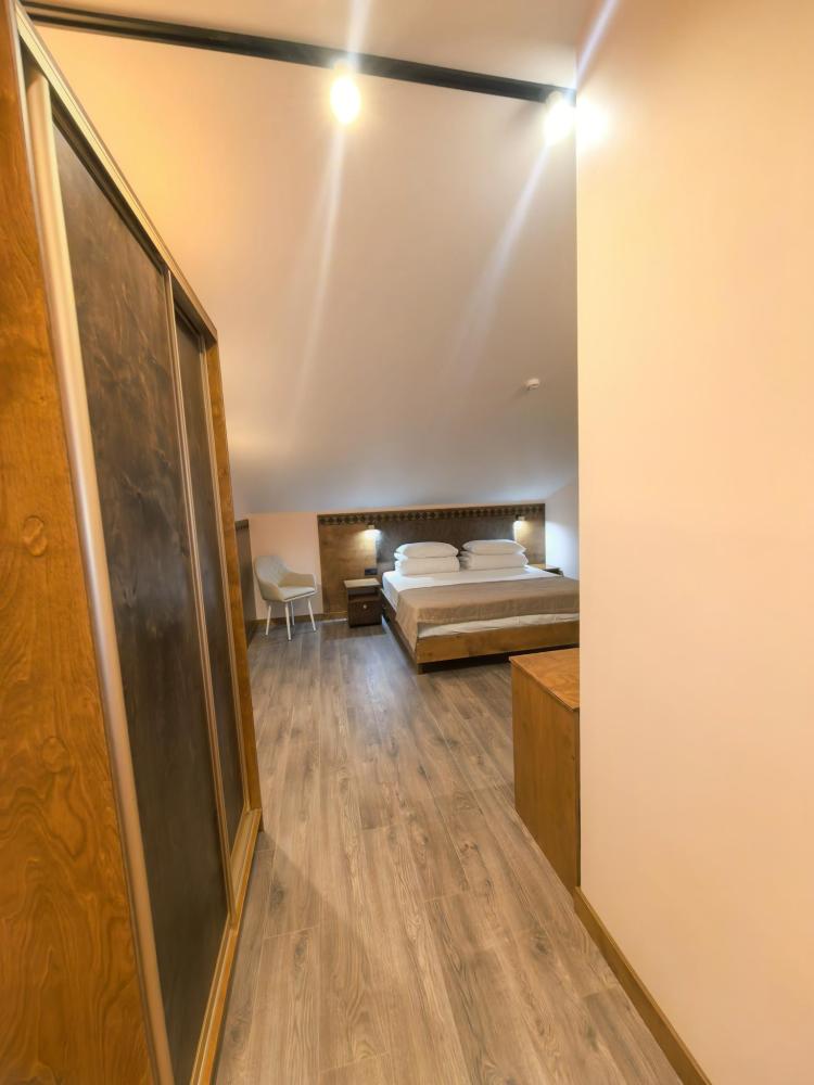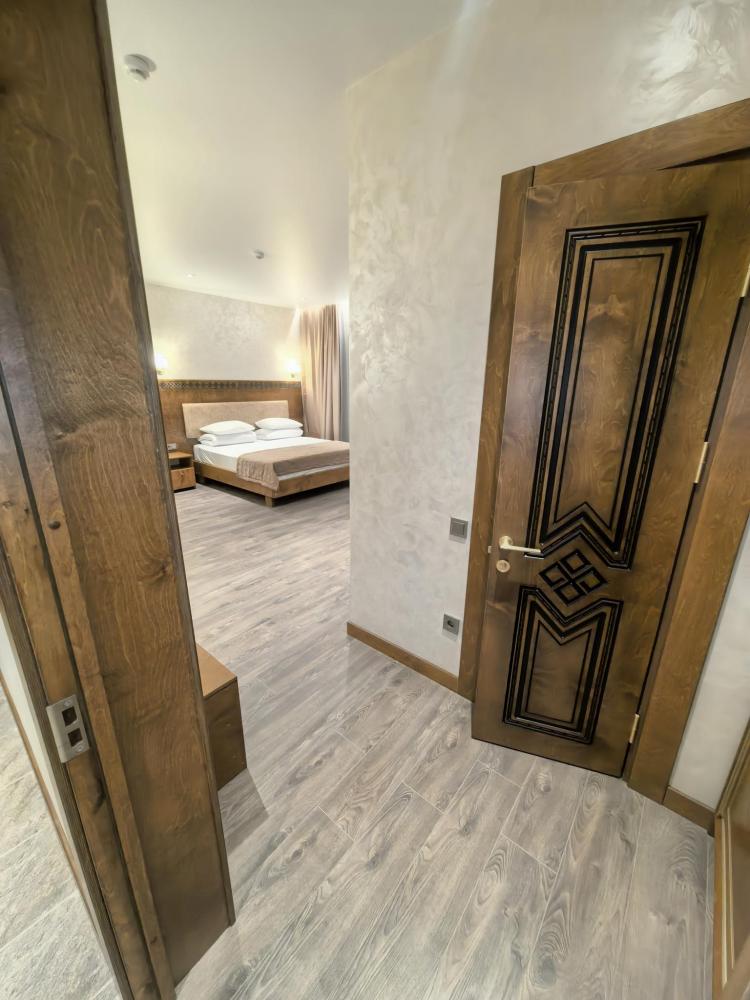 Полулюкс с балконом площадью 32 кв.м с видом на горы и двор. Подходит для размещения 4 человек. Имеет спальню с приятным интерьером и балкон. В номере: 1 двуспальная кровать, 1 диван двуспальный, телевизор, отопление, шкаф, вешалка, зеркало, рабочий стол, чайник, холодильник, стулья, фен, индивидуальная ванная комната (душ, раковина, туалет). Гостям предоставляется постельное бельё, полотенца, ванные принадлежности (шампунь, гель для душа, мыло, зубной набор).