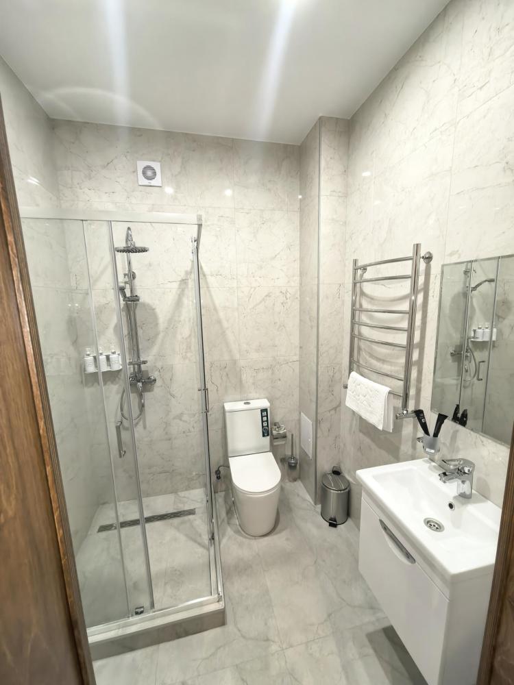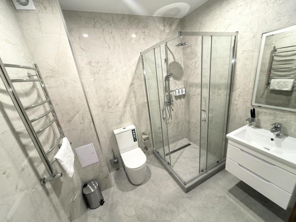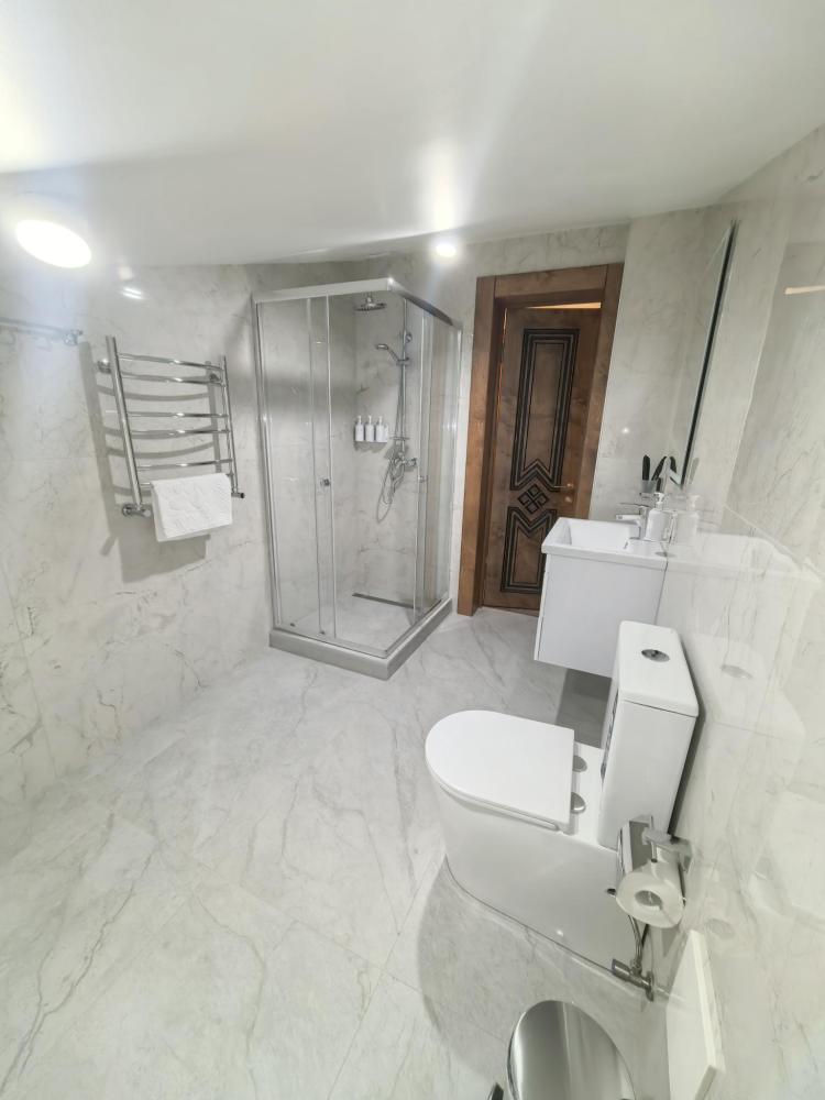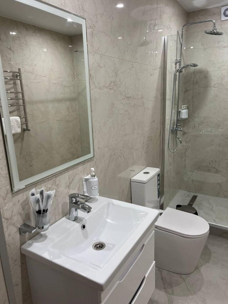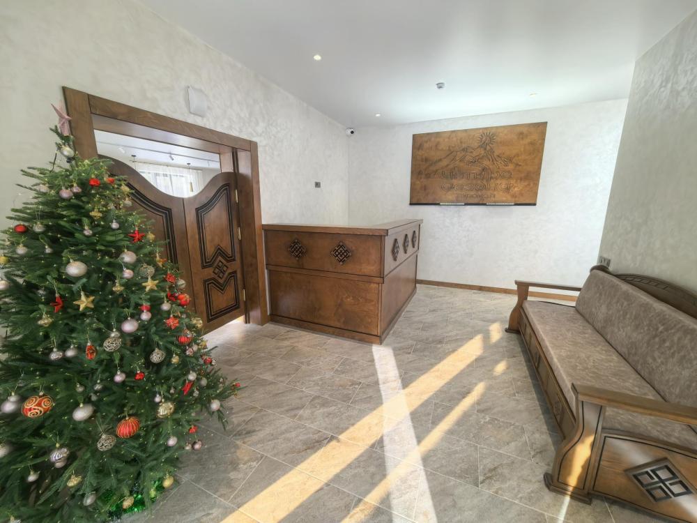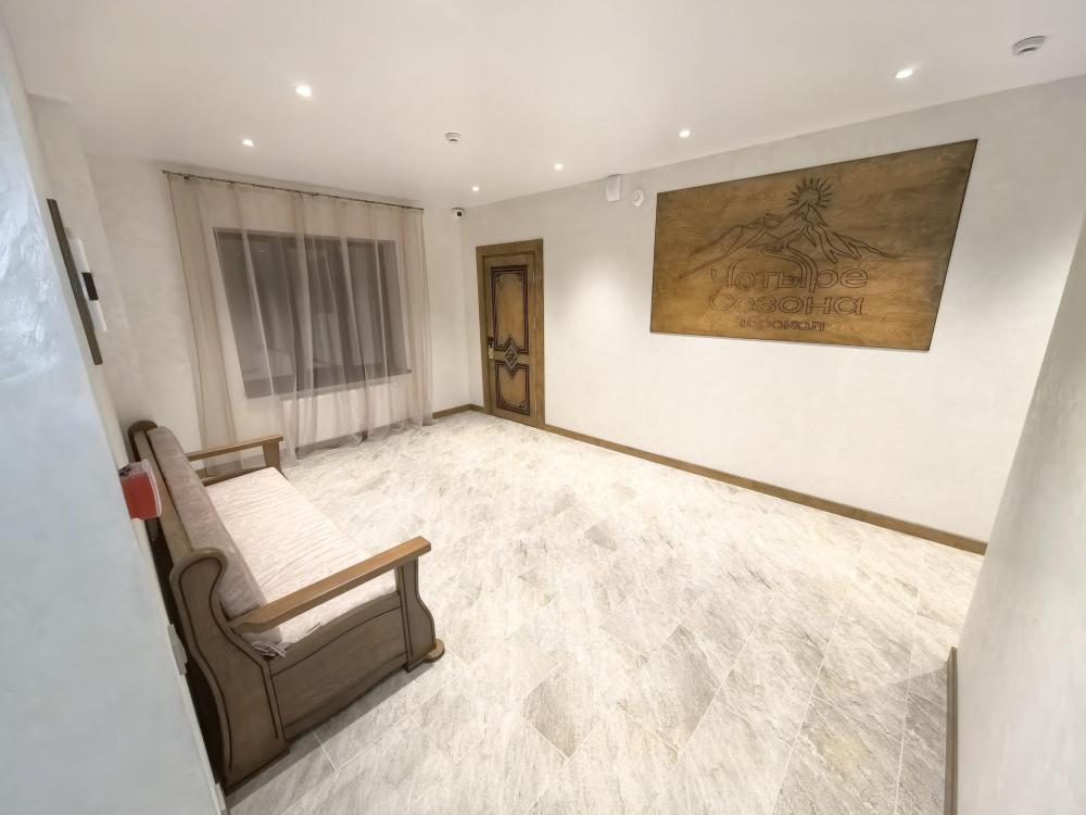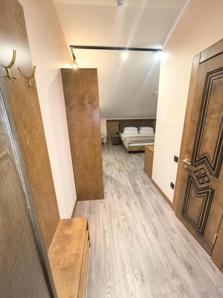 Полулюкс с балконом площадью 32 кв.м с видом на горы и двор. Подходит для размещения 4 человек. Имеет спальню с приятным интерьером и балкон. В номере: 1 двуспальная кровать, 1 диван двуспальный, телевизор, отопление, шкаф, вешалка, зеркало, рабочий стол, чайник, холодильник, стулья, фен, индивидуальная ванная комната (душ, раковина, туалет). Гостям предоставляется постельное бельё, полотенца, ванные принадлежности (шампунь, гель для душа, мыло, зубной набор).