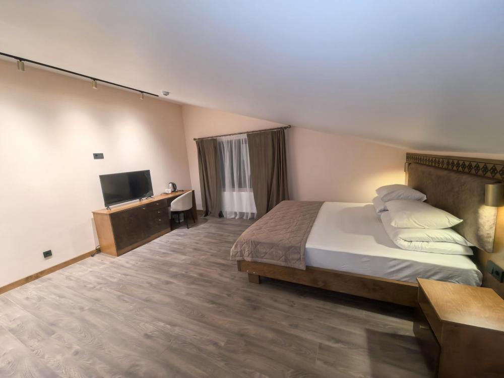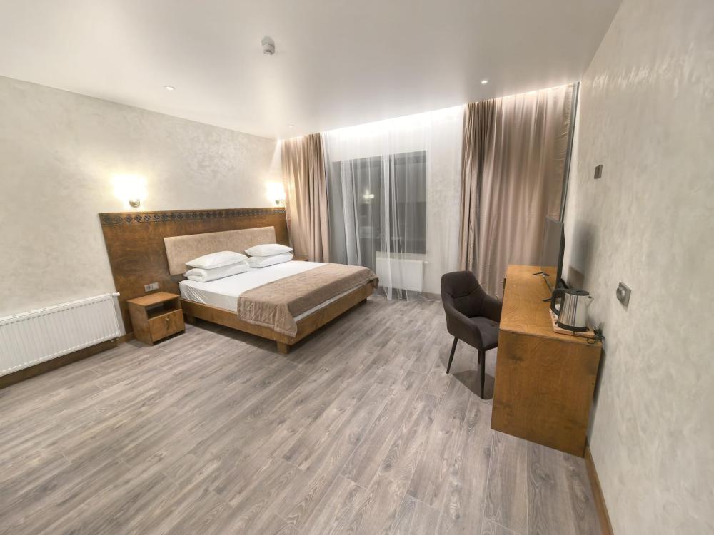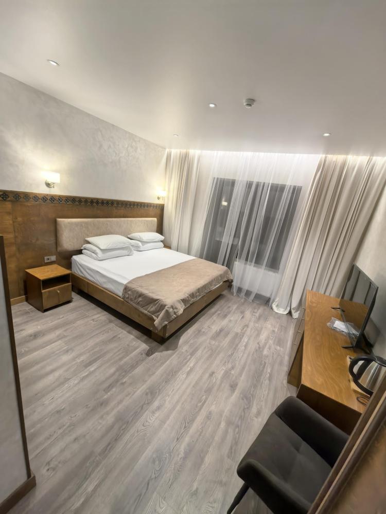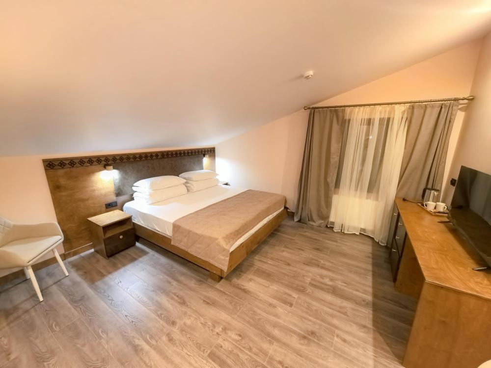 Полулюкс с балконом площадью 25 кв.м с видом на горы и двор. Подходит для размещения 2 человек. Имеет спальню с приятным интерьером и балкон. В номере: 1 двуспальная кровать, телевизор, отопление, шкаф, вешалка, зеркало, рабочий стол, чайник, холодильник, стулья, фен, индивидуальная ванная комната (душ, раковина, туалет). Гостям предоставляется постельное бельё, полотенца, ванные принадлежности (шампунь, гель для душа, мыло, зубной набор).