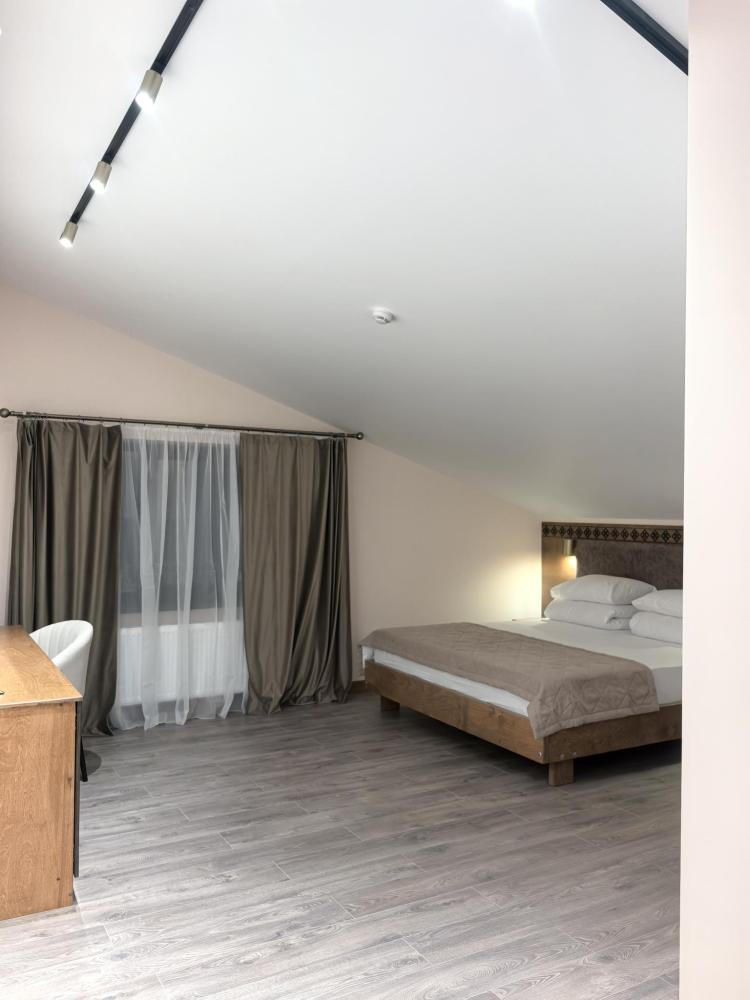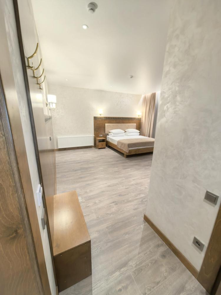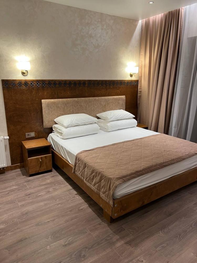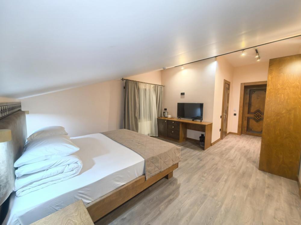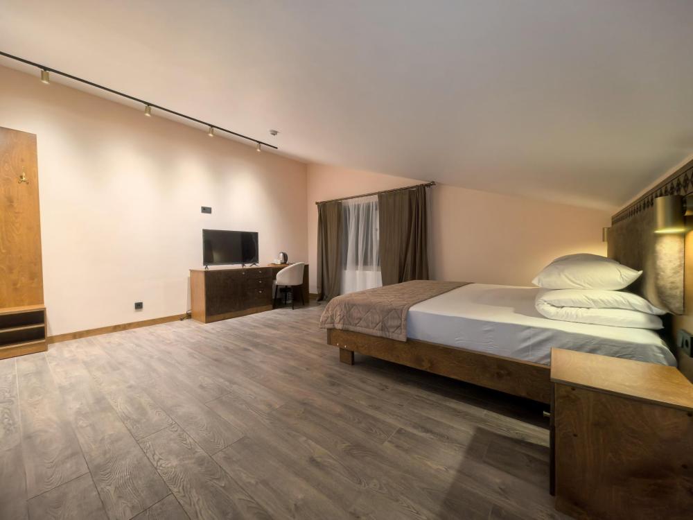 Полулюкс с балконом площадью 25 кв.м с видом на горы и двор. Подходит для размещения 2 человек. Имеет спальню с приятным интерьером и балкон. В номере: 1 двуспальная кровать, телевизор, отопление, шкаф, вешалка, зеркало, рабочий стол, чайник, холодильник, стулья, фен, индивидуальная ванная комната (душ, раковина, туалет). Гостям предоставляется постельное бельё, полотенца, ванные принадлежности (шампунь, гель для душа, мыло, зубной набор).