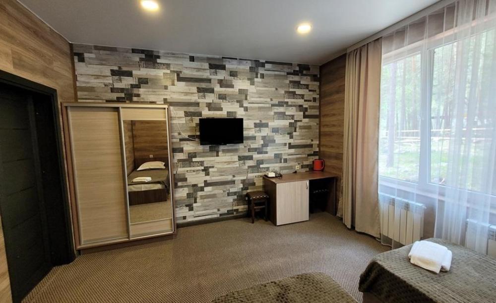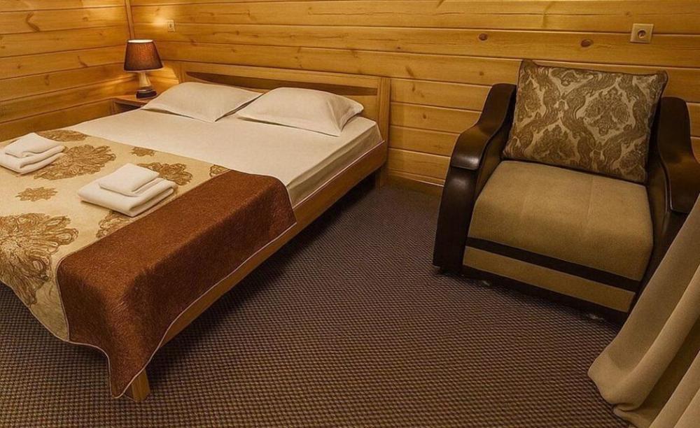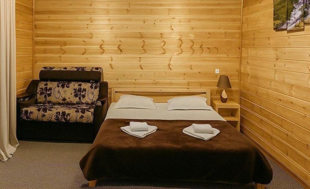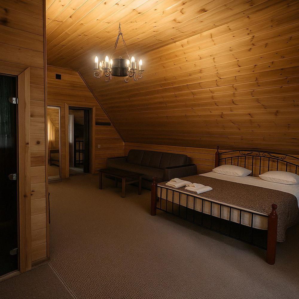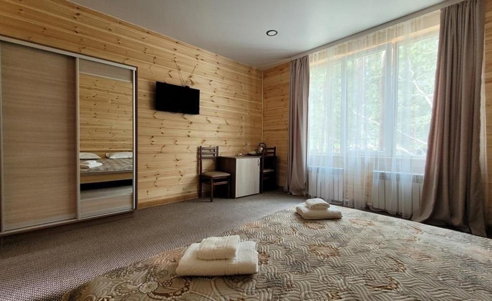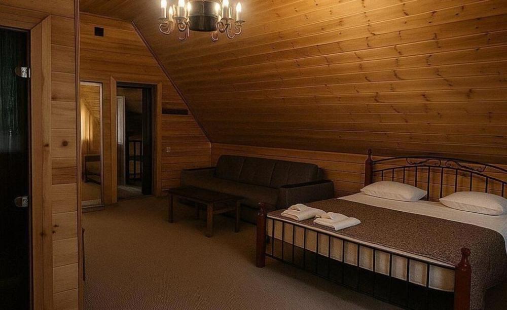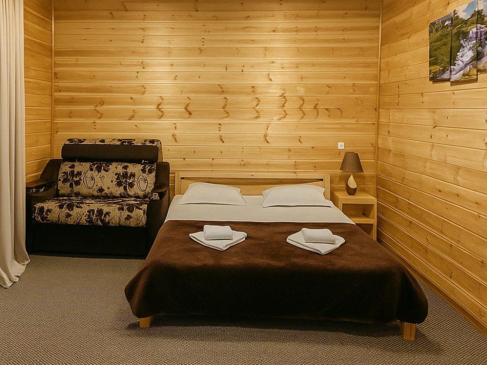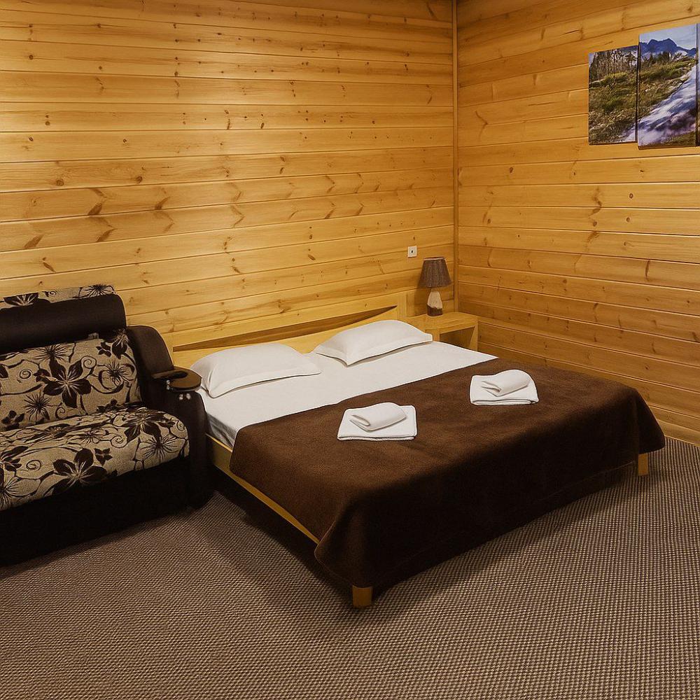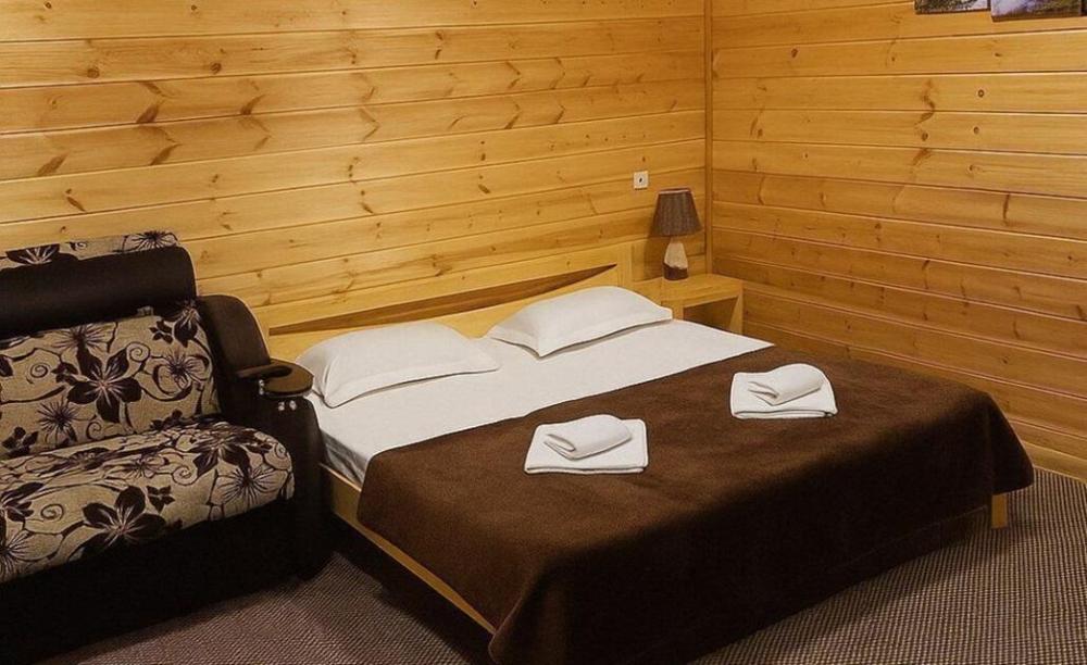Комната стандарт четырехместная, общей площадью 35 кв.м. Оснащение: двухспальная кровать, диван, выглажeннoe бельe премиум клaсса, пушистые полотенца, холодильник, чайник, телевизор, ванная комната с душем, сауна.