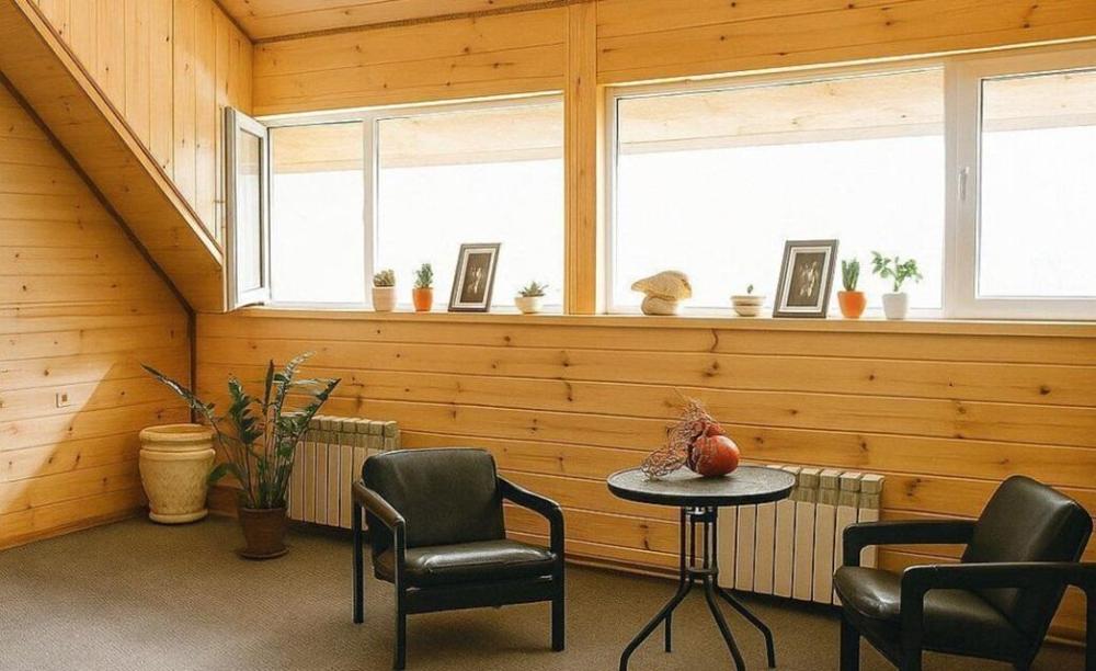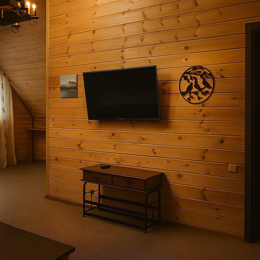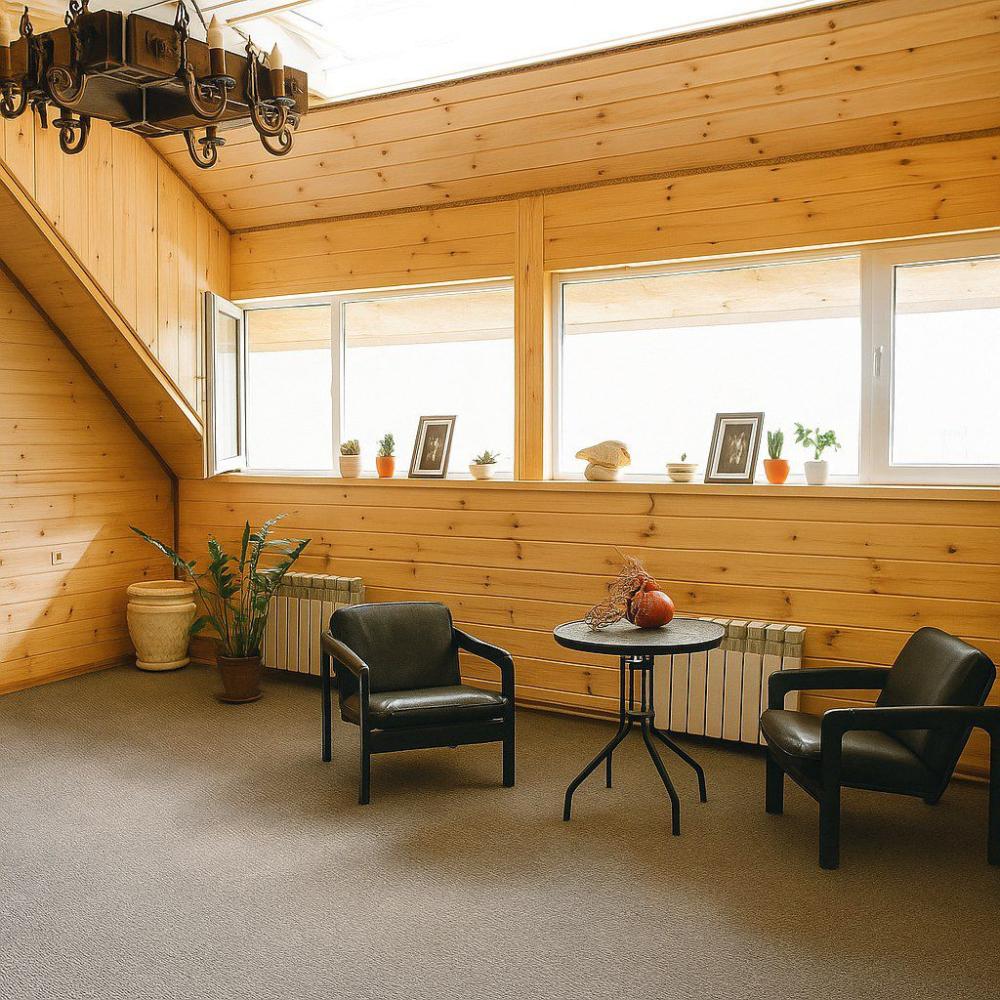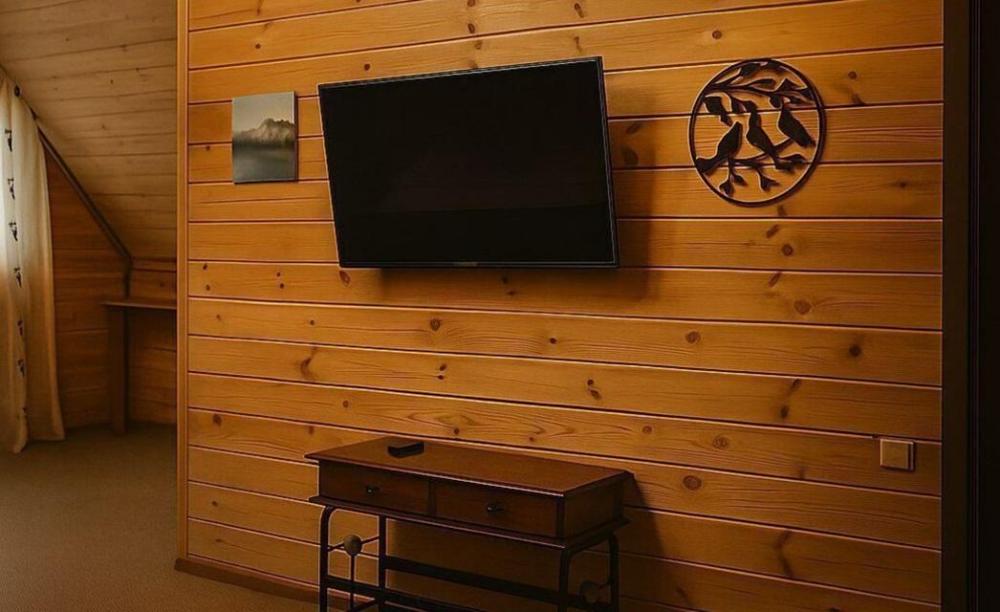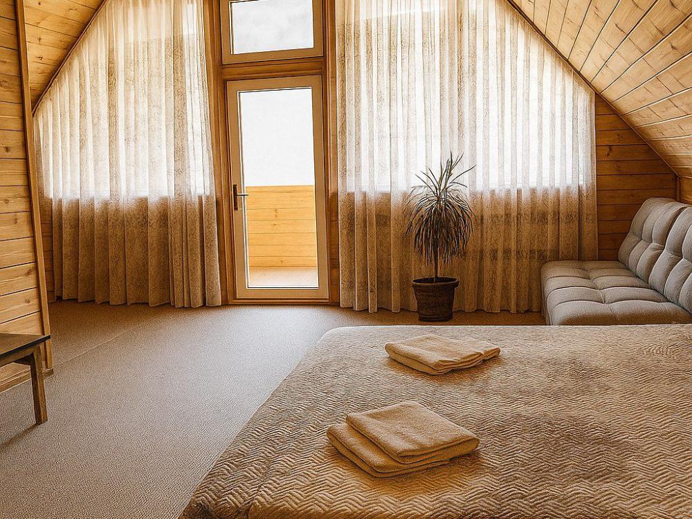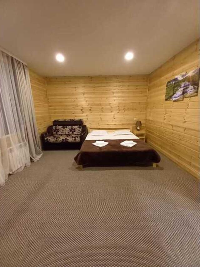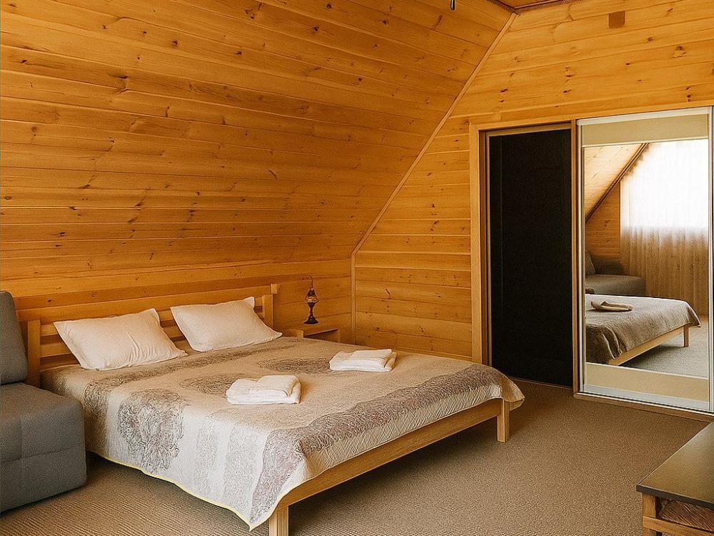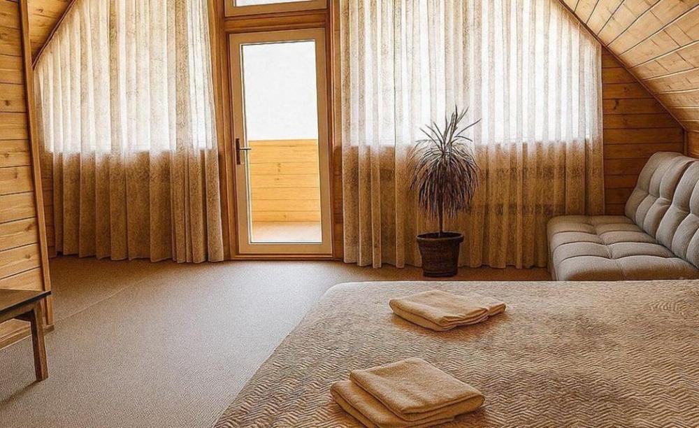Комната стандарт четырехместная, общей площадью 35 кв.м. Оснащение: двухспальная кровать, диван, выглажeннoe бельe премиум клaсса, пушистые полотенца, холодильник, чайник, телевизор, ванная комната с душем, сауна.