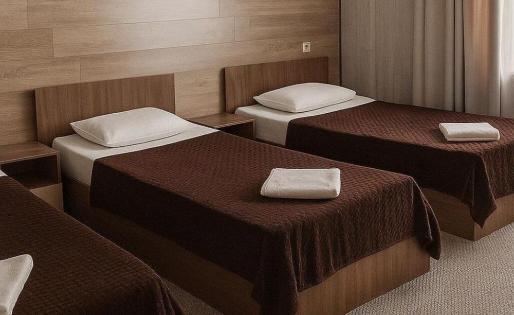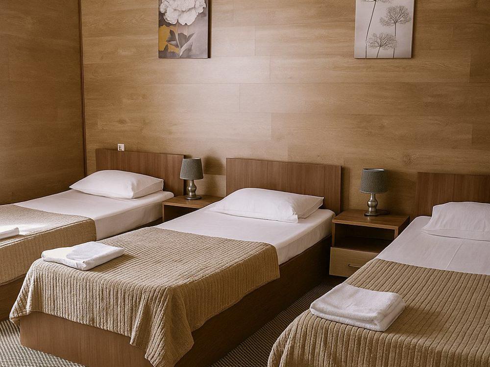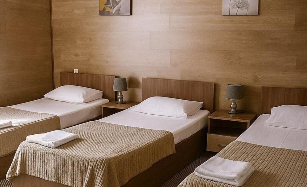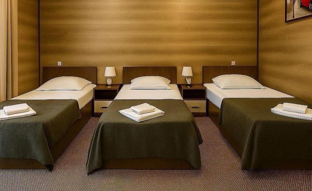 Комната стандарт с тремя односпальными кроватями, общей площадью 25 кв.м. Оснащение: три односпальные кровати, выглажeннoe бельe премиум клaсса, пушистые полотенца, холодильник, чайник, телевизор, ванная комната с душем.