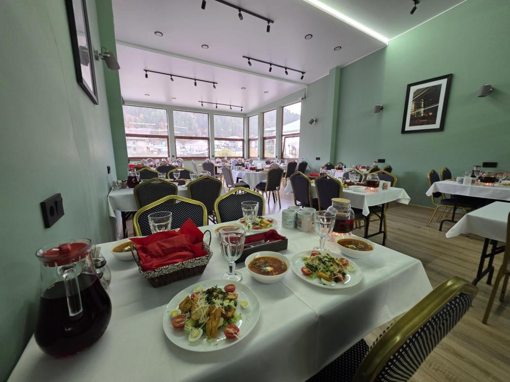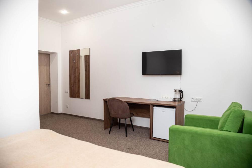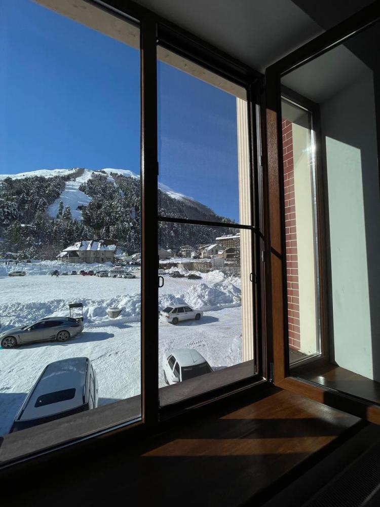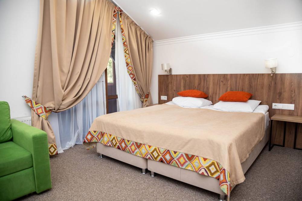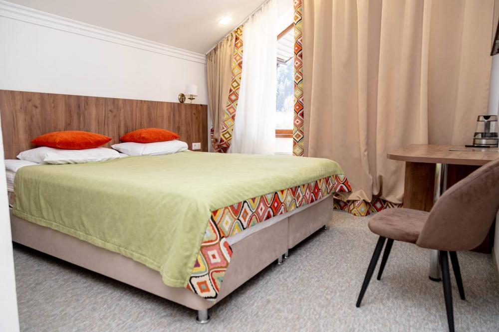 Номера категории “Стандарт плюс” (24 кв.м) оборудованы: двумя раздельными кроватями с удобными матрасами + 1 креслом-кроватью; прикроватными тумбочками; розетки/выключатели рядом с кроватями; бра; мини-холодильником; чайной станцией (принадлежности на две персоны); рабочим столиком, обувницей и гардеробом; SMART-телевизором с подпиской на онлайн кинотеатры; подогревом пола с ковролиновым покрытием; ванной комнатой (душевая кабинка с банными принадлежностями, приточный рекуператор воздуха, фен, змеевик для сушки полотенец); имеется остеклённый балкон с видом на ущелье.