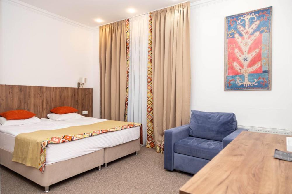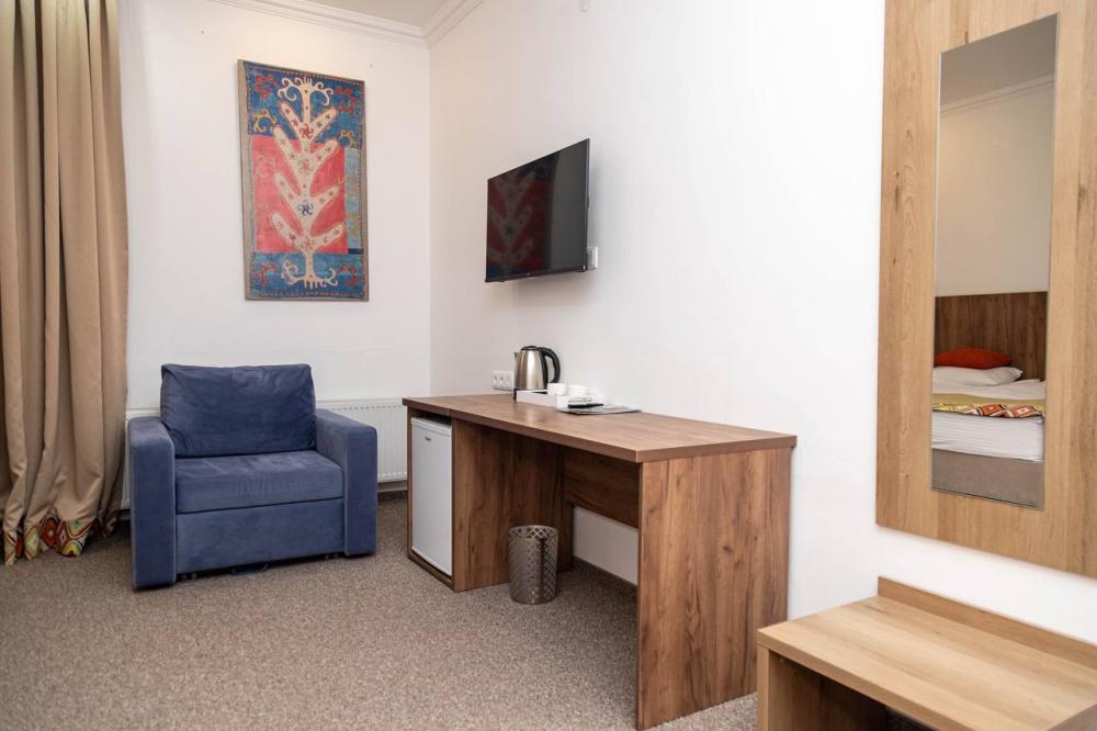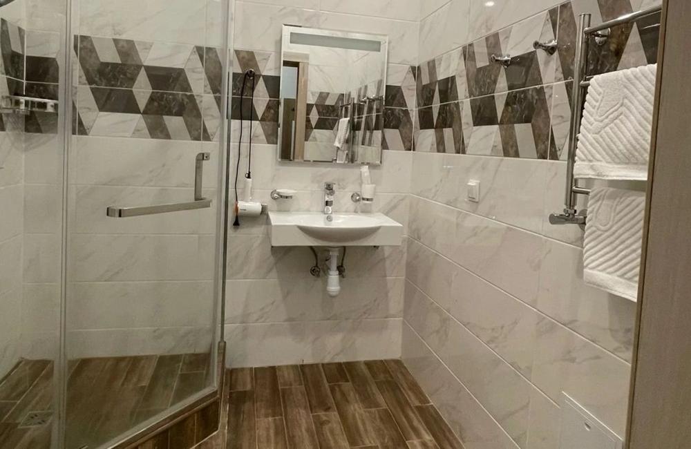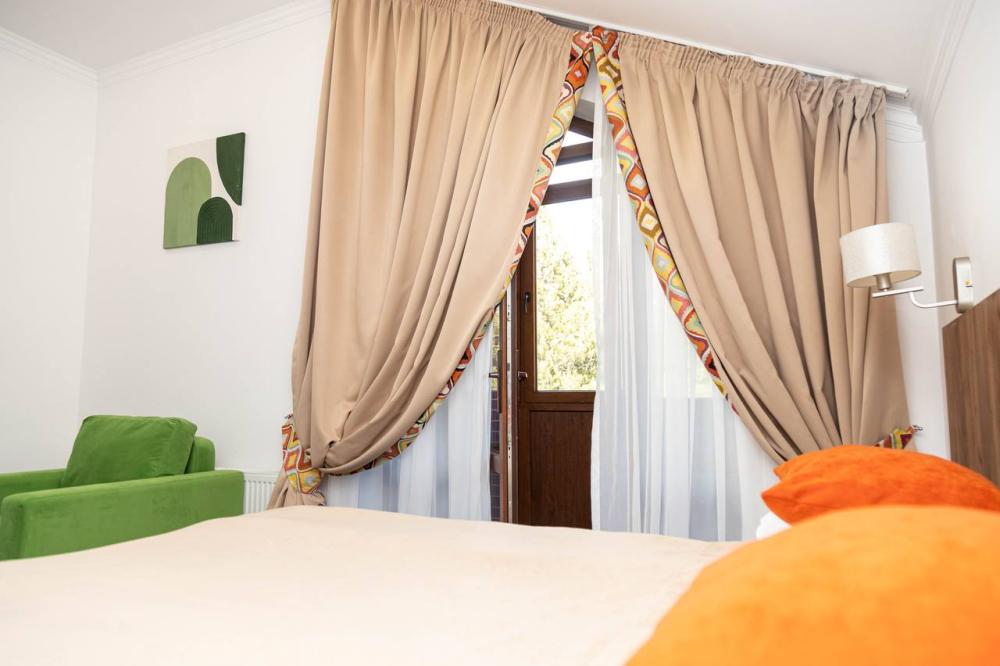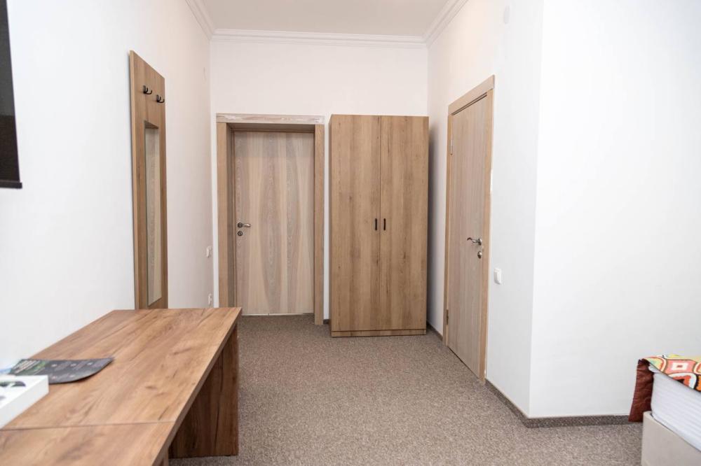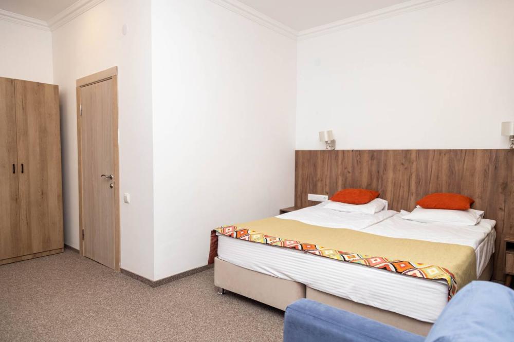 Номера категории “Стандарт” (17 кв.м) оборудованы: двумя раздельными кроватями с удобными матрасами; прикроватными столиками; розетки/выключатели рядом с кроватями; бра; мини-холодильником; чайной станцией (принадлежности на две персоны); рабочим столиком, обувницей и гардеробом; SMART-телевизором с подпиской на онлайн кинотеатры; подогревом пола с ковролиновым покрытием; ванной комнатой (душевая кабинка с банными принадлежностями, приточный рекуператор воздуха, фен, змеевик для сушки полотенец).