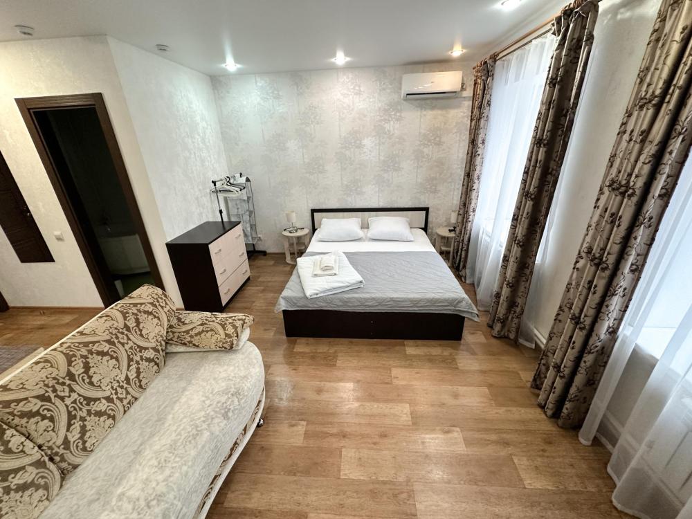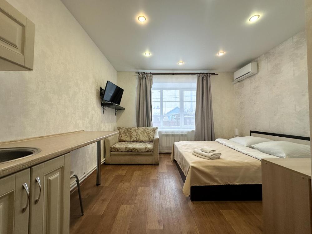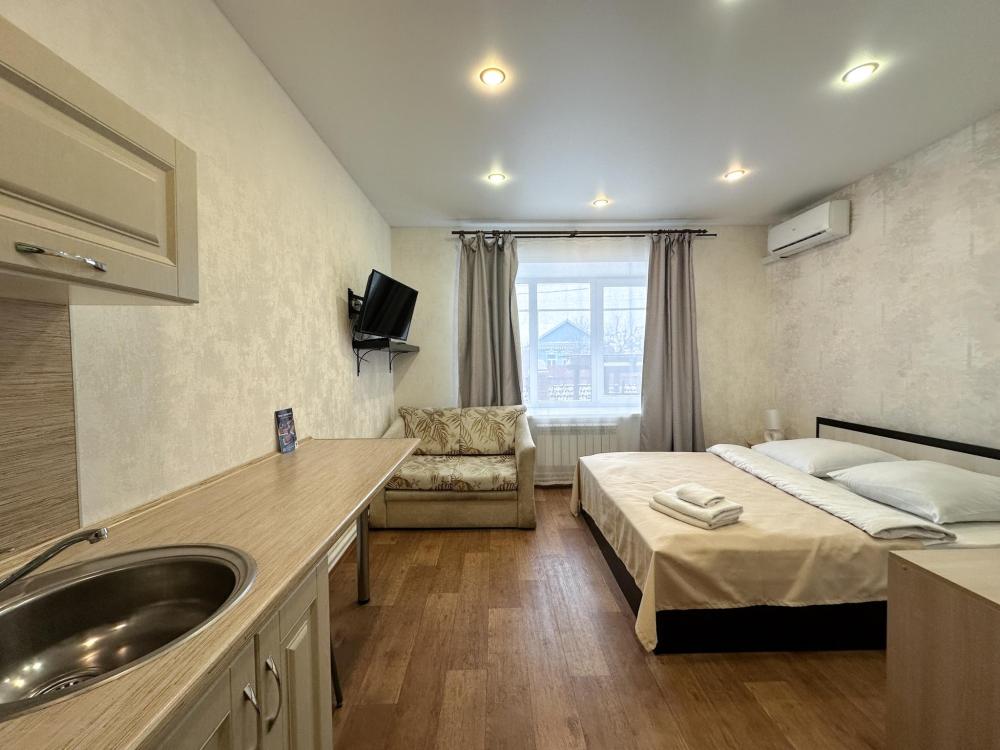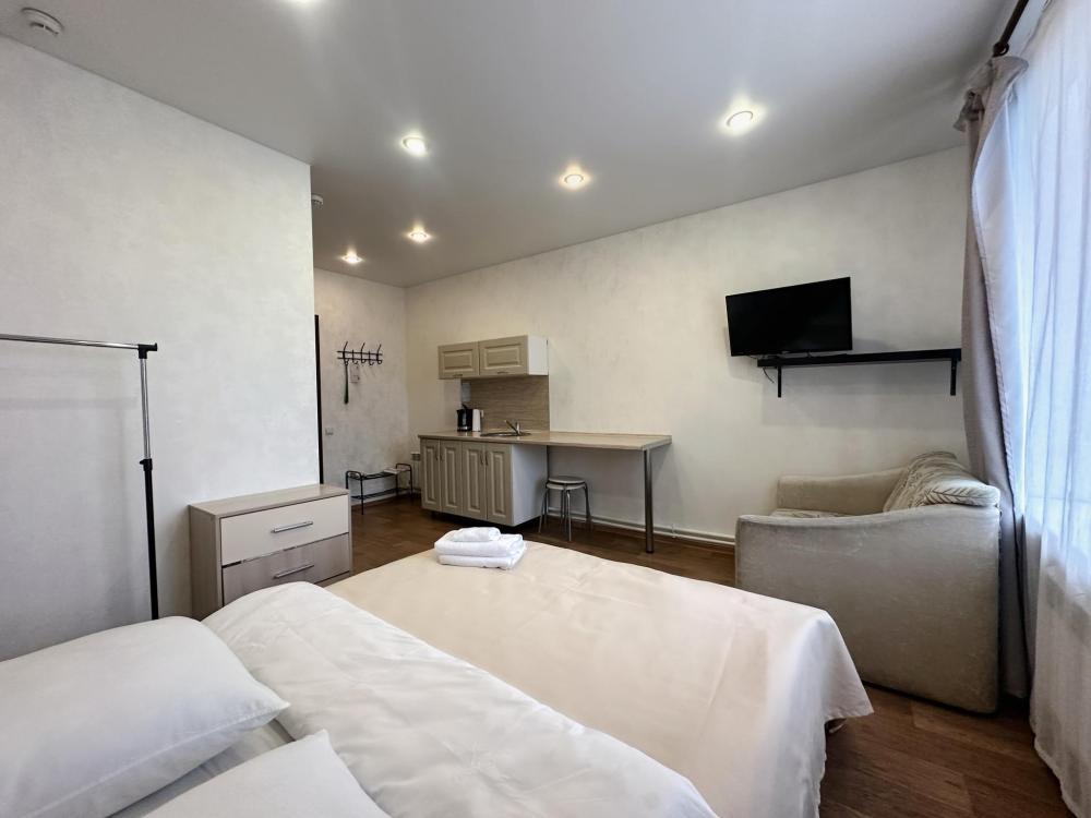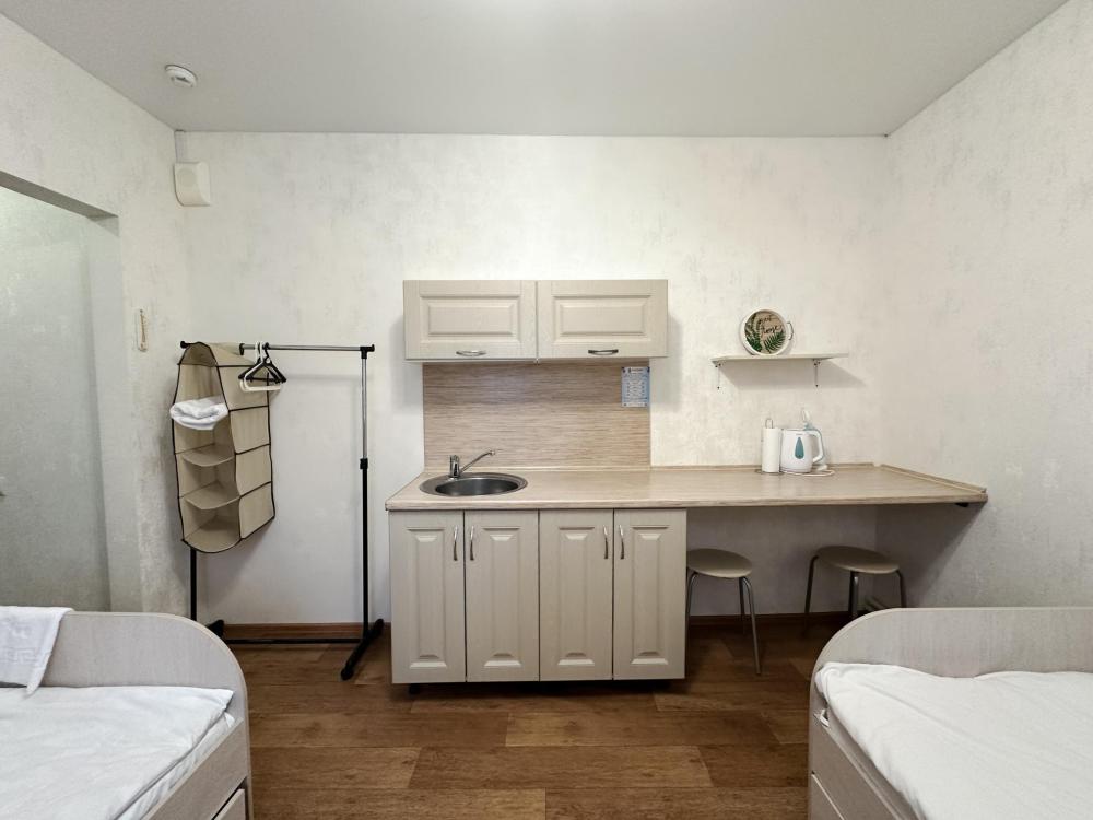 Семейный номер с двуспальной кроватью и двуспальным диваном Номер комфорт, 22м2, оснащен мини-кухней: плита, чайник, стол со стульями, вся необходимая посуда. Приятный бонус в виде чая и конфет. Собственная ванная комната с душем. Комплект полотенец. Кондиционер, телевизор и бесплатный wi-fi. Услуги по доставки еды, трансферу, прачечной.