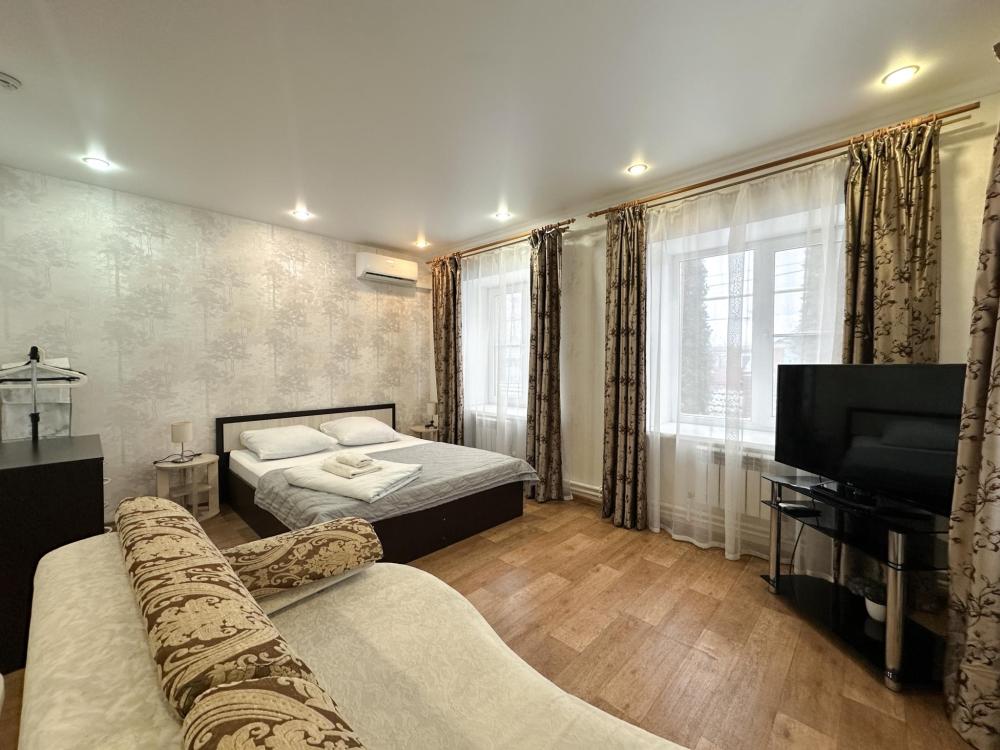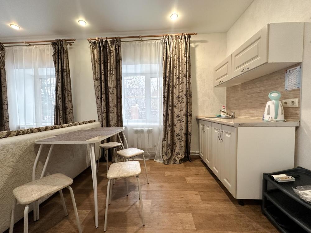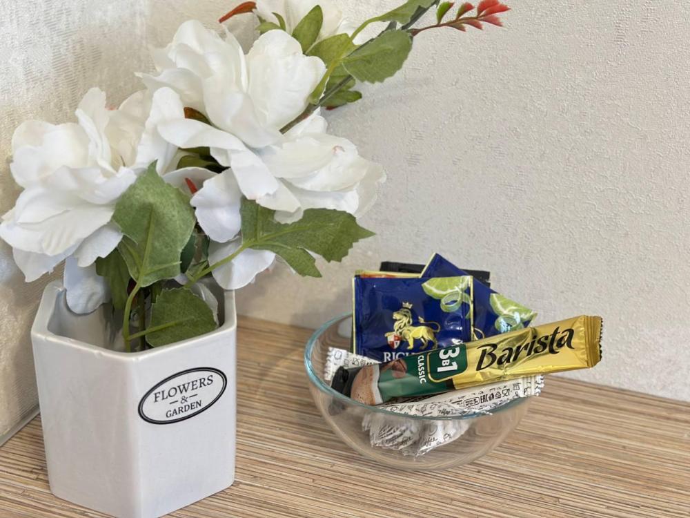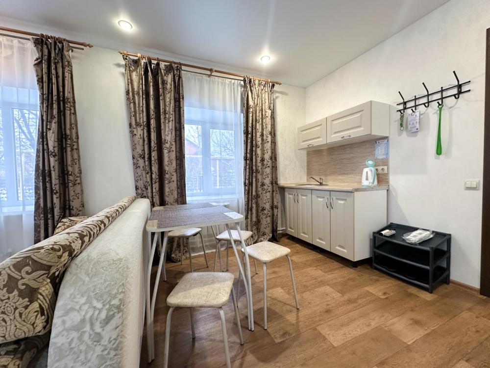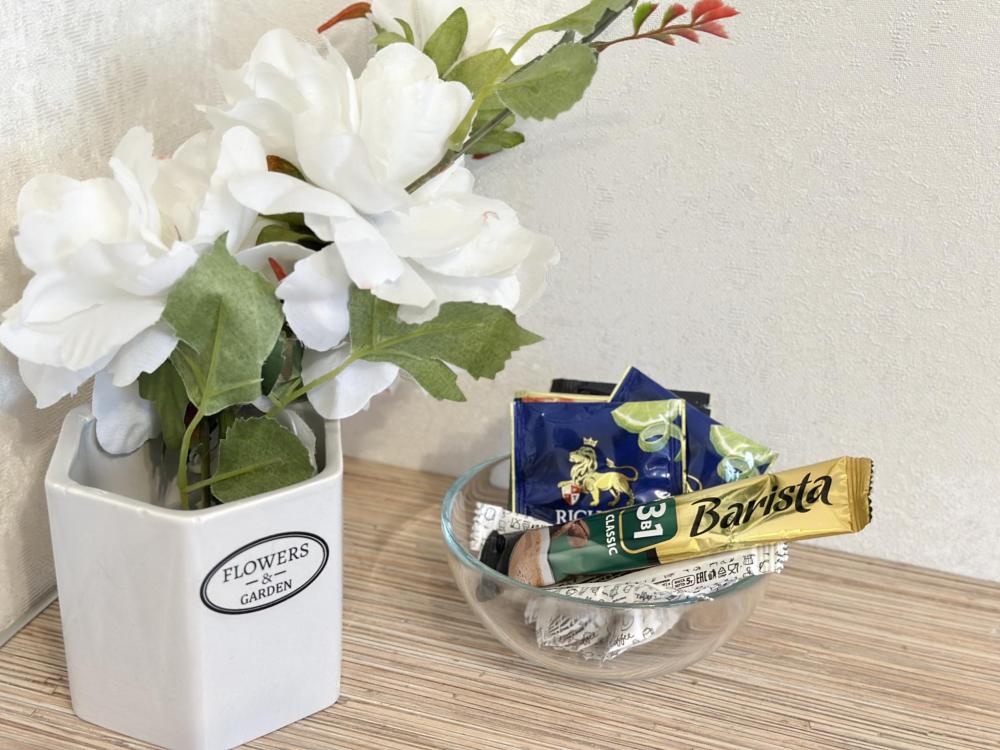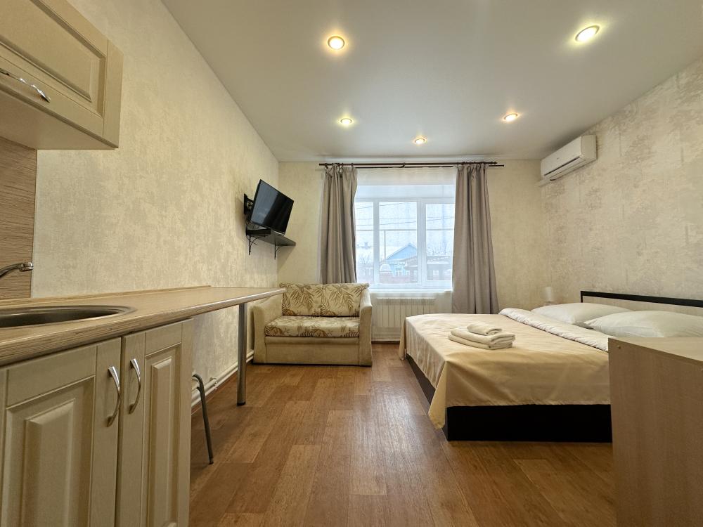 Семейный номер с двуспальной кроватью и двуспальным диваном Номер комфорт, 22м2, оснащен мини-кухней: плита, чайник, стол со стульями, вся необходимая посуда. Приятный бонус в виде чая и конфет. Собственная ванная комната с душем. Комплект полотенец. Кондиционер, телевизор и бесплатный wi-fi. Услуги по доставки еды, трансферу, прачечной.