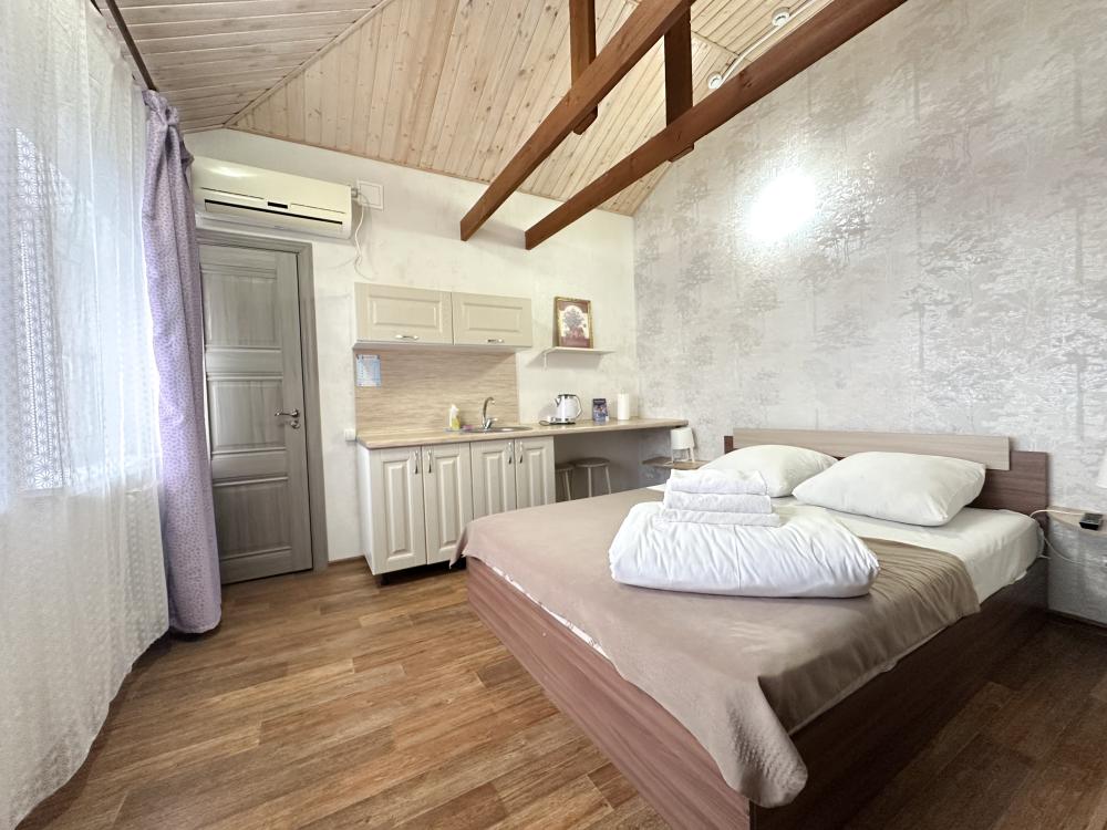 Двухместный номер с 1 кроватью: Номер стандарт, 16м2, оснащен мини-кухней: плита, чайник, вся необходимая посуда. Приятный бонус в виде чая и конфет. Собственная ванная комната с душем. Комплект полотенец. Телевизор и бесплатный wi-fi. Услуги по доставки еды, трансферу, прачечной. Номера представлены стандартного и мансардного типа, предоставляется по наличию.