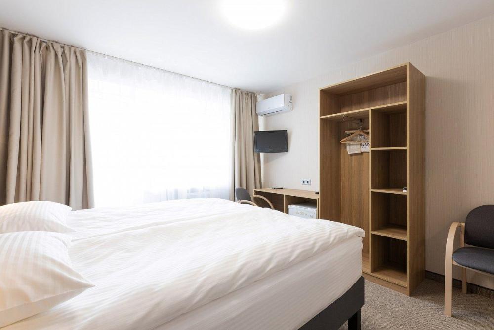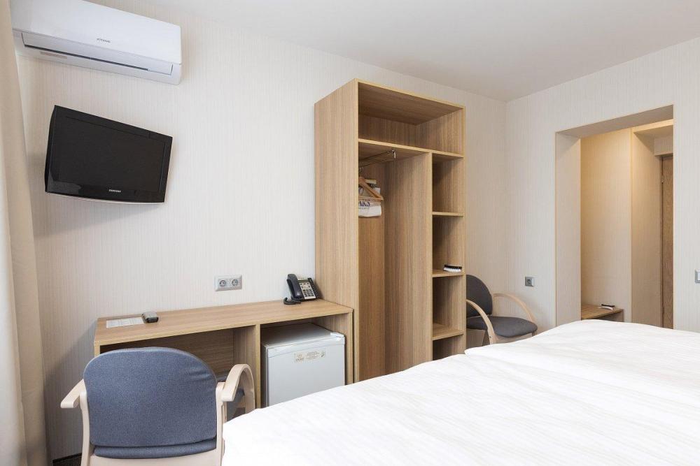 Однокомнатный номер площадью 19 кв.м. В номере: двуспальная или две односпальные кровати, прикроватные тумбочки, рабочая зона, шкаф, телевизор, холодильник, кондиционер, душевая кабина или ванна, туалетные принадлежности, тапочки, фен.