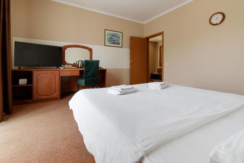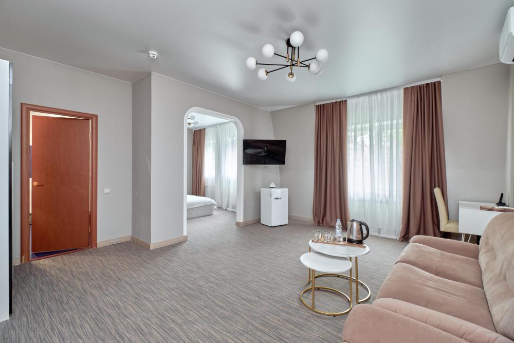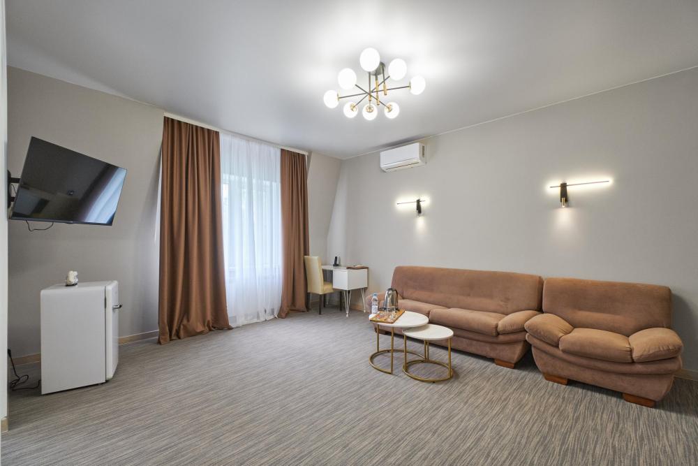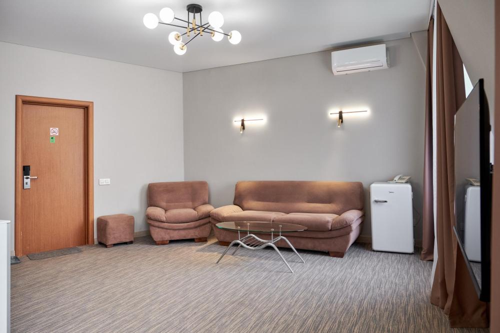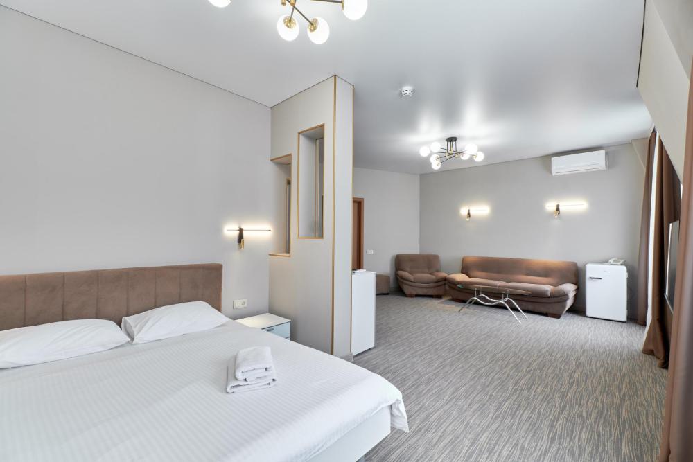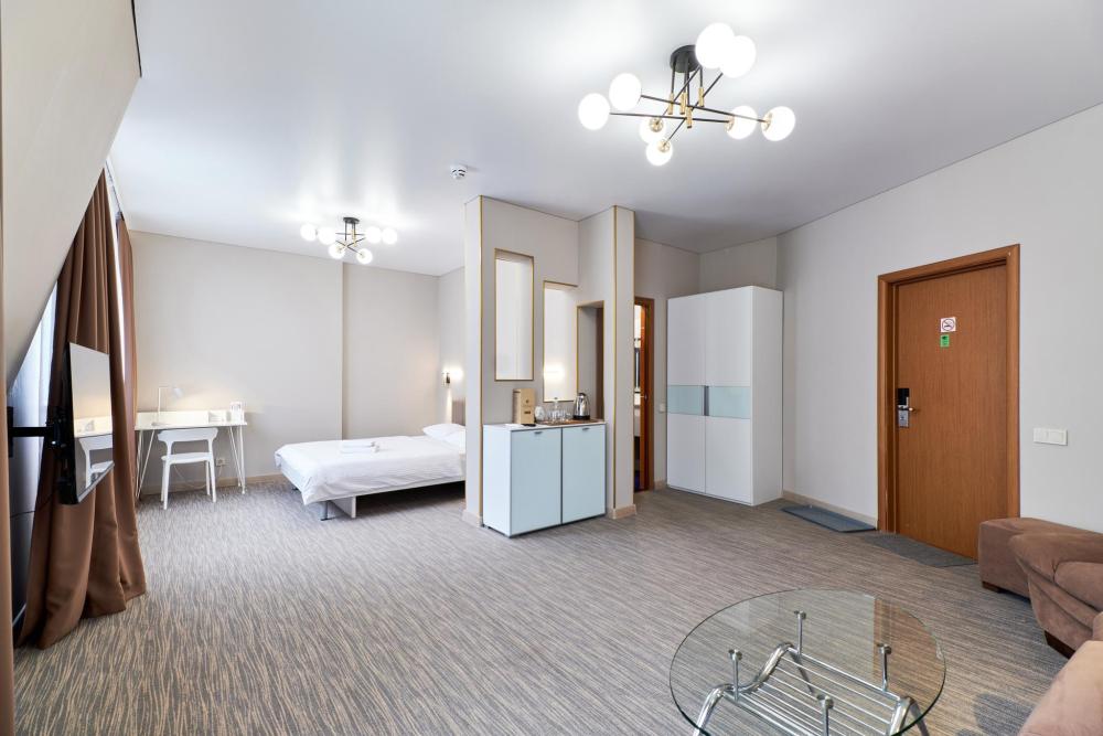 - Площадь номера 35 м2 - Вместимость до 3 человек - Двуспальная кровать, диван - Телевизор с плоским экраном - Ковровое покрытие Шкаф для одежды Рабочая и/или мягкая зона - Безлимитный Wi-Fi интернет - Телефон - Кондиционер - Сейф - Холодильник - Фен - Персональный санузел с душевой кабиной - Полотенца, халат, тапочки - Индивидуальные туалетно-косметические средства