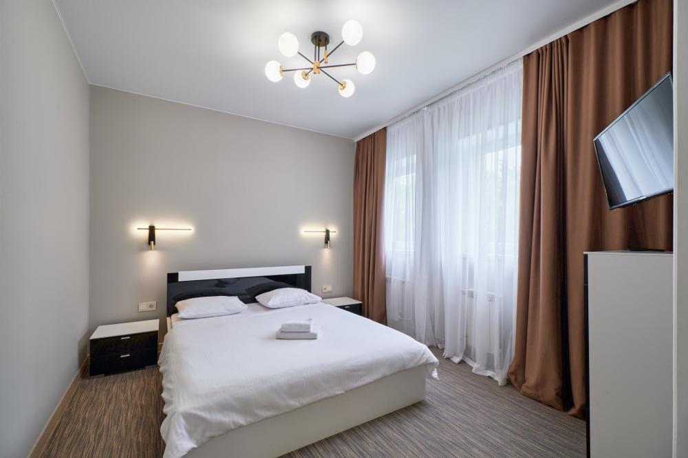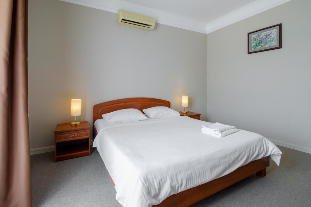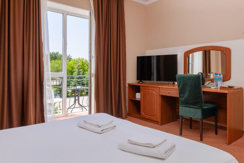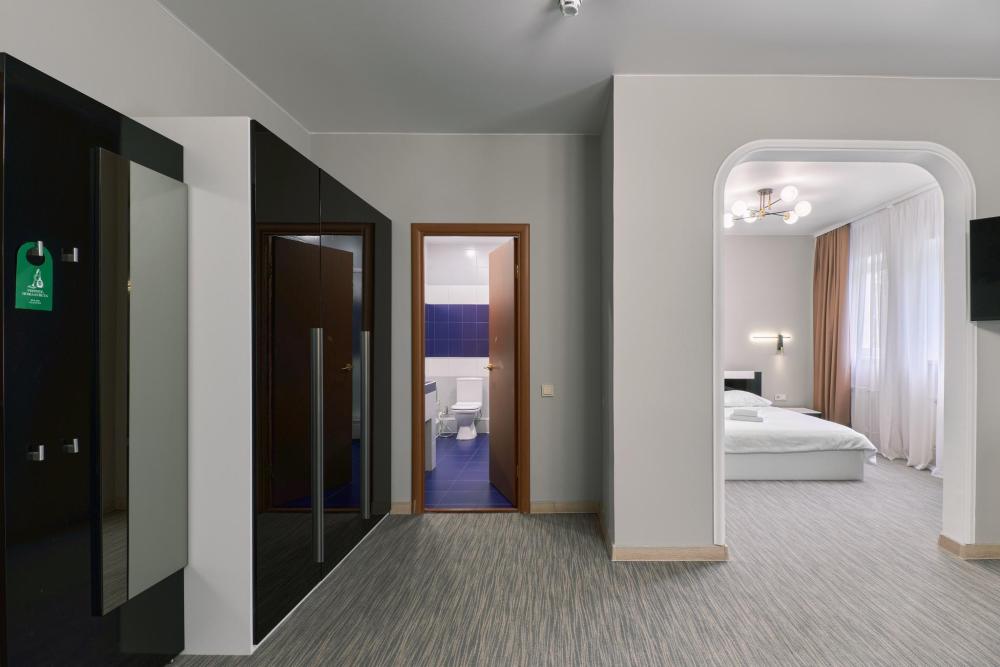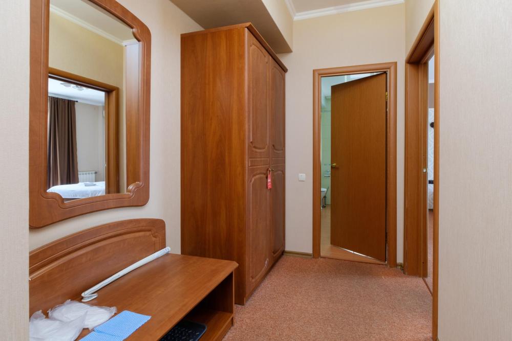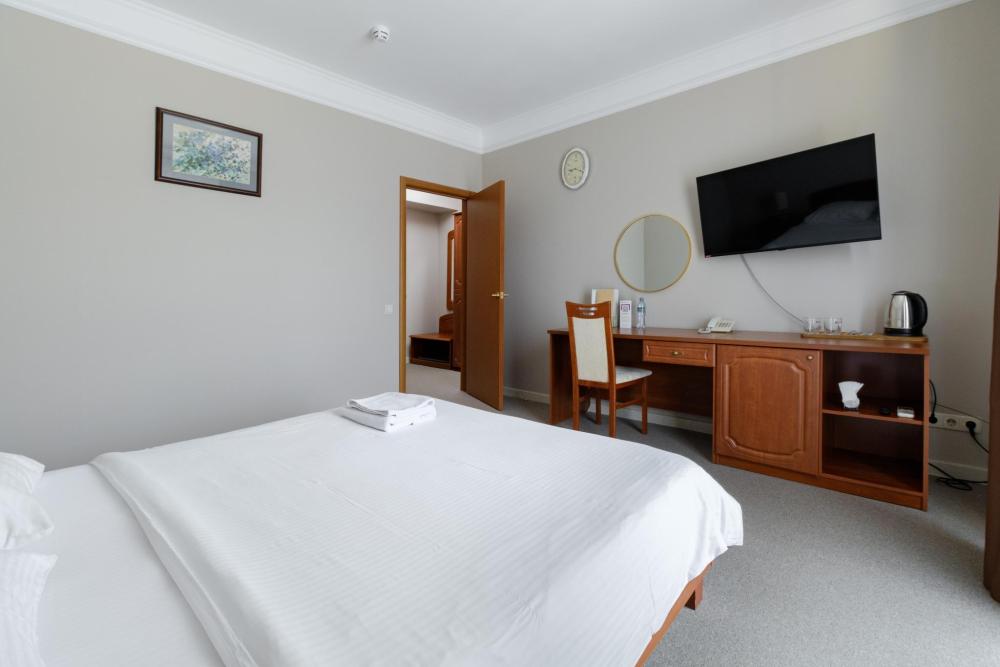 - Площадь номера 35 м2 - Вместимость до 3 человек - Двуспальная кровать, диван - Телевизор с плоским экраном - Ковровое покрытие Шкаф для одежды Рабочая и/или мягкая зона - Безлимитный Wi-Fi интернет - Телефон - Кондиционер - Сейф - Холодильник - Фен - Персональный санузел с душевой кабиной - Полотенца, халат, тапочки - Индивидуальные туалетно-косметические средства