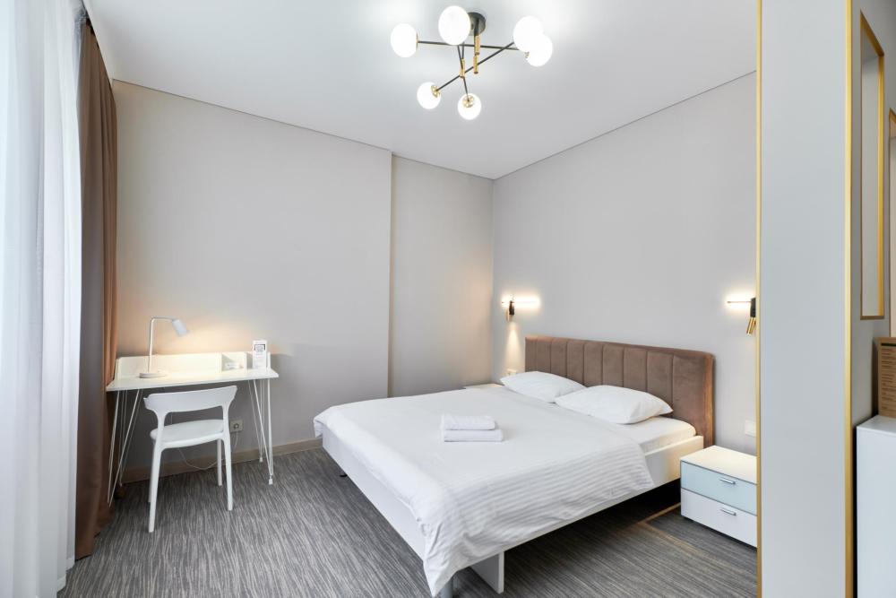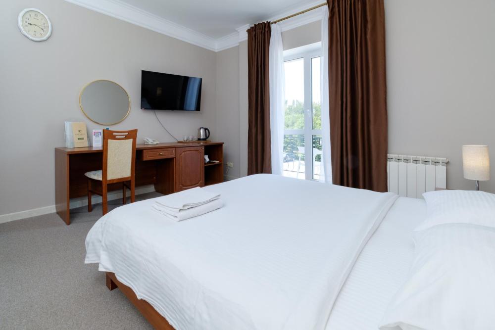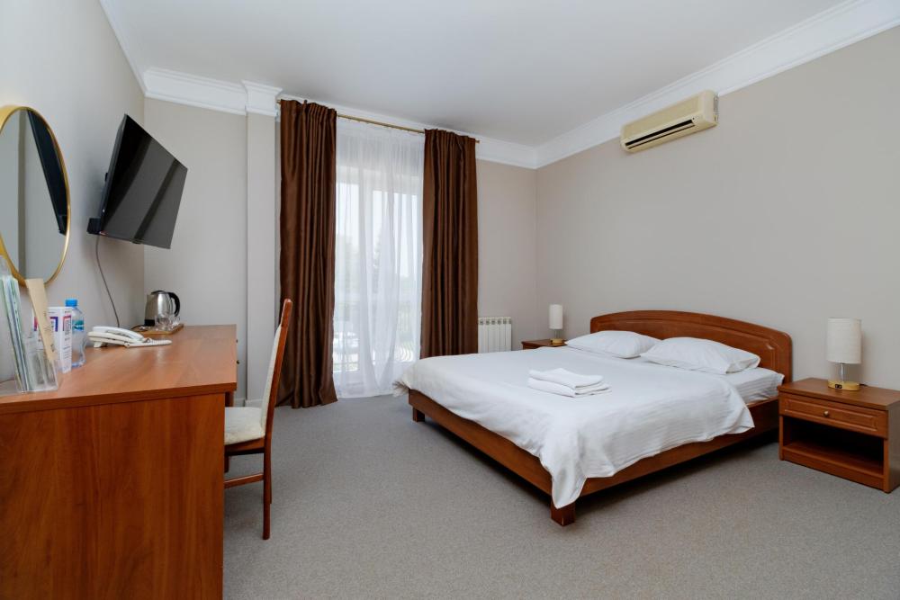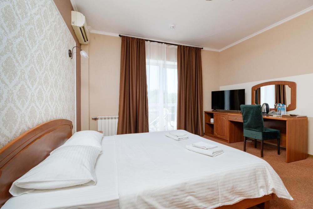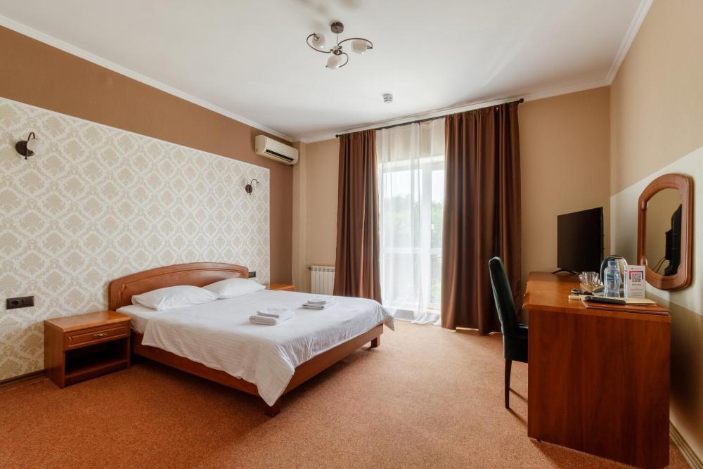 Площадь номера 28 м2 - Двуспальная кровать - Телевизор с плоским экраном - Ковровое покрытие Шкаф для одежды Рабочая зона (стол, стул) - Безлимитный Wi-Fi интернет - Телефон - Кондиционер - Сейф - Холодильник - Фен - Персональный санузел с душевой кабиной - Полотенца, халат, тапочки - Индивидуальные туалетно-косметические средства