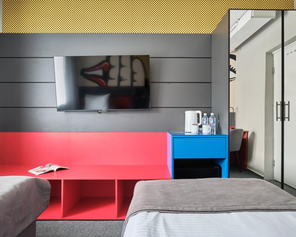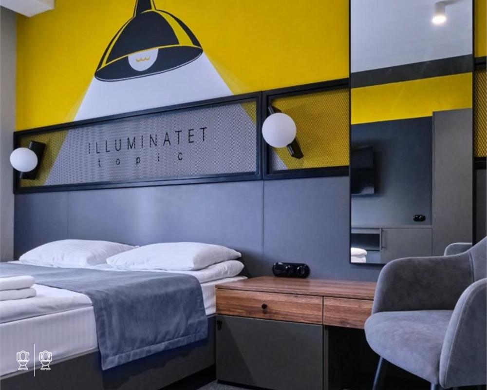 - размер кровати 180х200 см с удобной прикроватной тумбой и эргономичным освещением - анатомический матрас и сатиновое постельное белье; - гипоаллергенные подушки и одеяло; - ЖК телевизор с функцией SMART; - бесплатный высокоскоростной WI-FI; - легкодоступные точки для зарядки электронных устройств; - Шкаф - Рабочее место - Зеркало в полный рост - Тапочки