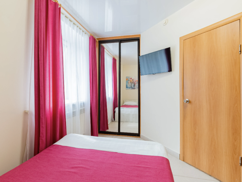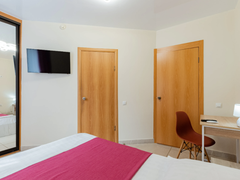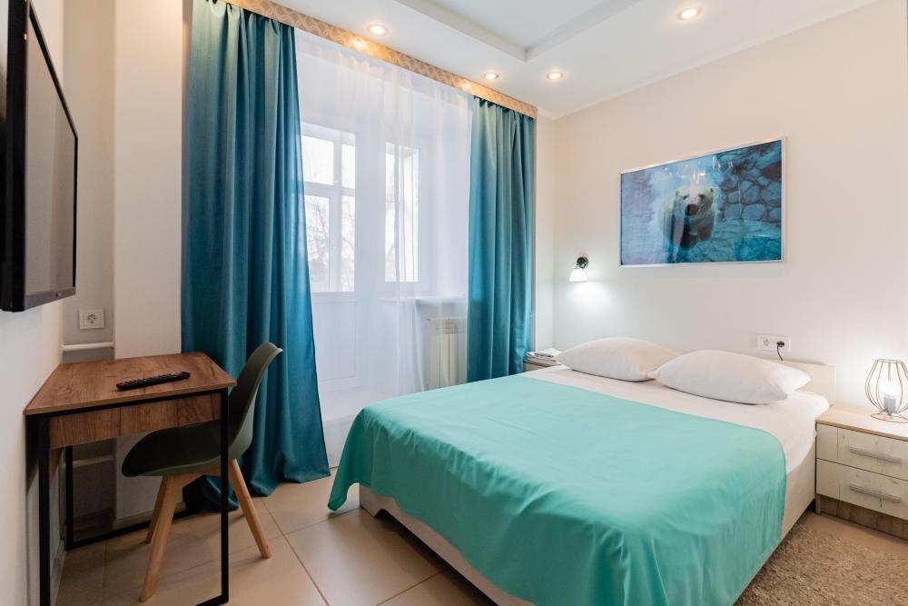 Номер площадью 14 кв.м. В номере есть: двуспальная кровать, телевизор, кабельное телевидение, Wi-Fi, фен, сан.узел