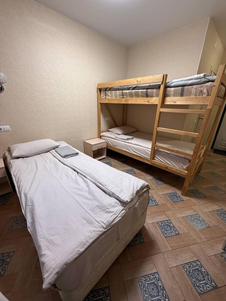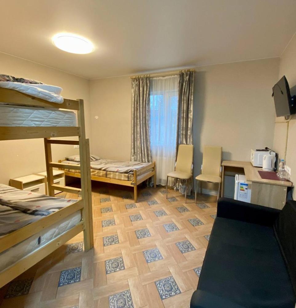 Пространство выполнено в элегантном стиле, сочетающем современный дизайн и функциональность. Светлые тона интерьера создают приятную атмосферу отдыха и релаксации. Номер оснащен удобной односпальной и двухъярусной кроватями с качественным постельным бельем, обеспечивающим максимальный комфорт сна. Для удобства размещения багажа имеется просторный гардероб с зеркалом. Современная бытовая техника включает телевизор с плоским экраном, подключенный к кабельному телевидению, холодильник для напитков и продуктов питания, электрический чайник . Санузел оборудован душевой кабинкой, феном, косметическими средствами и мягкими полотенцами.