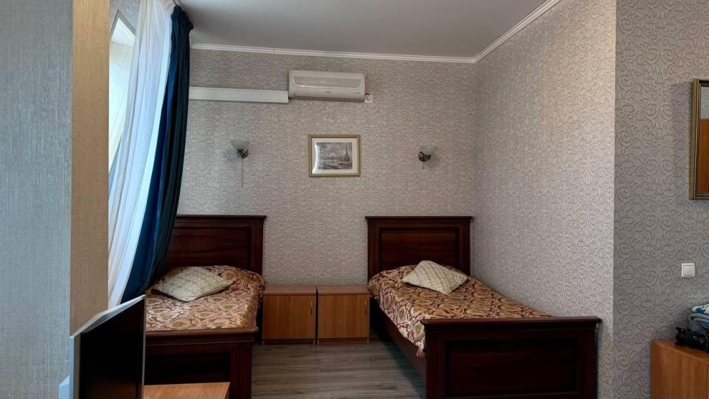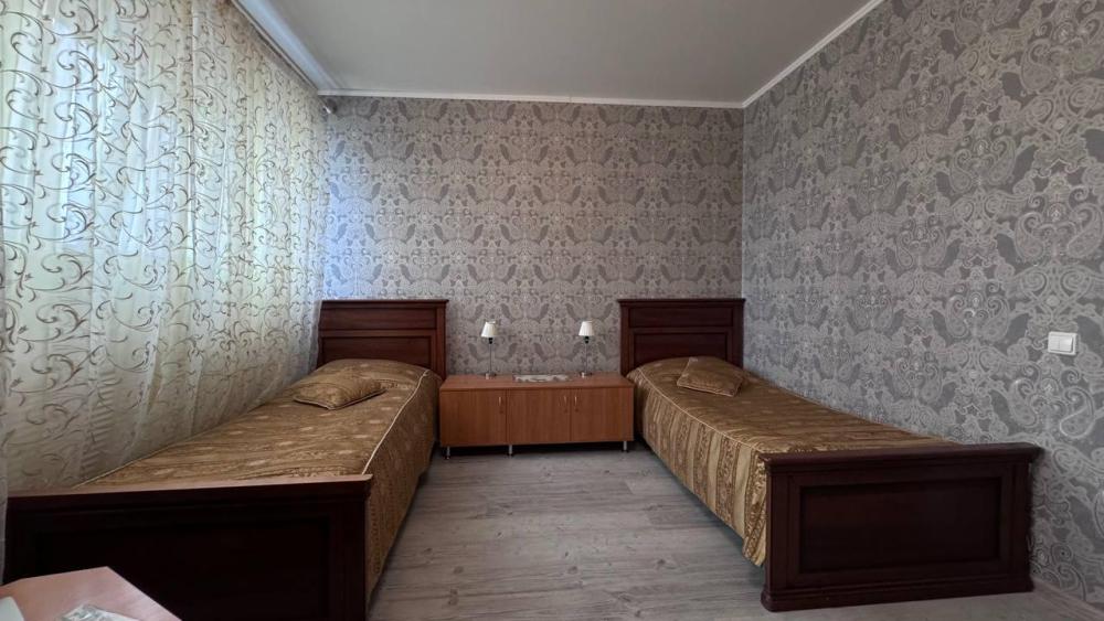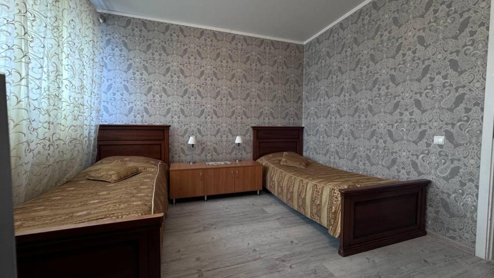 Номер с двумя односпальными кроватями общей площадью 20 кв.м., санузел в номере. В номере имеется электрический чайник, телевизор, холодильник