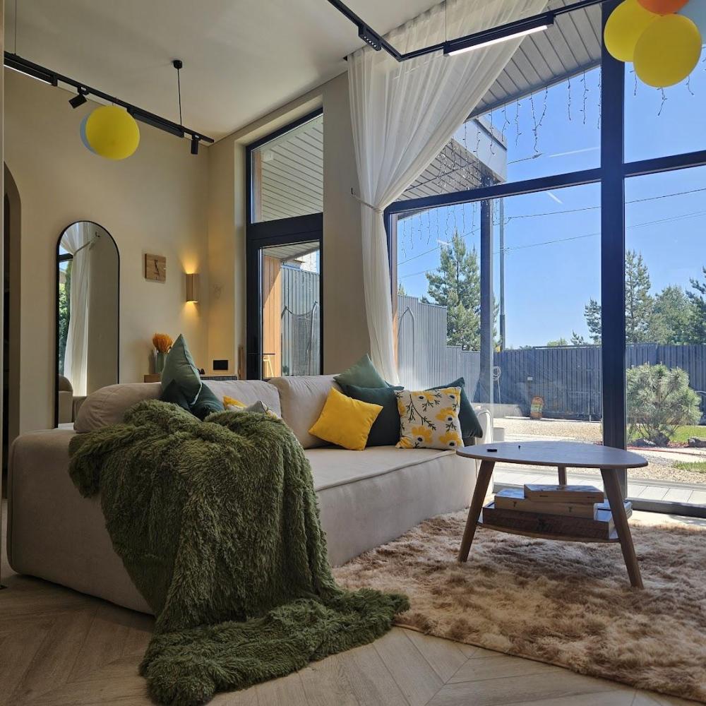 В коттедже: комфортный диван, функциональная кухня, уютные кресла. Две комфортные спальни: графитовая панорамная и белоснежная. Кровать 160 см с матрасом 22 см, тумбочка, шкаф для одежды, комод, рабочая зона, шторы блэкаут, беспроводная зарядка, выглаженное постельное белье. Все удобства в дизайнерском санузле.Гигиенический и тропический душ, одноразовые щетки, гель для душа и шампунь, фен, чистые полотенца.
