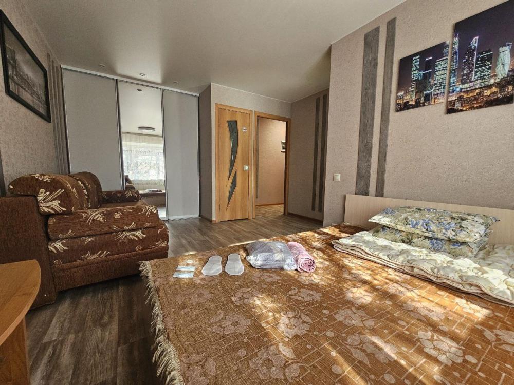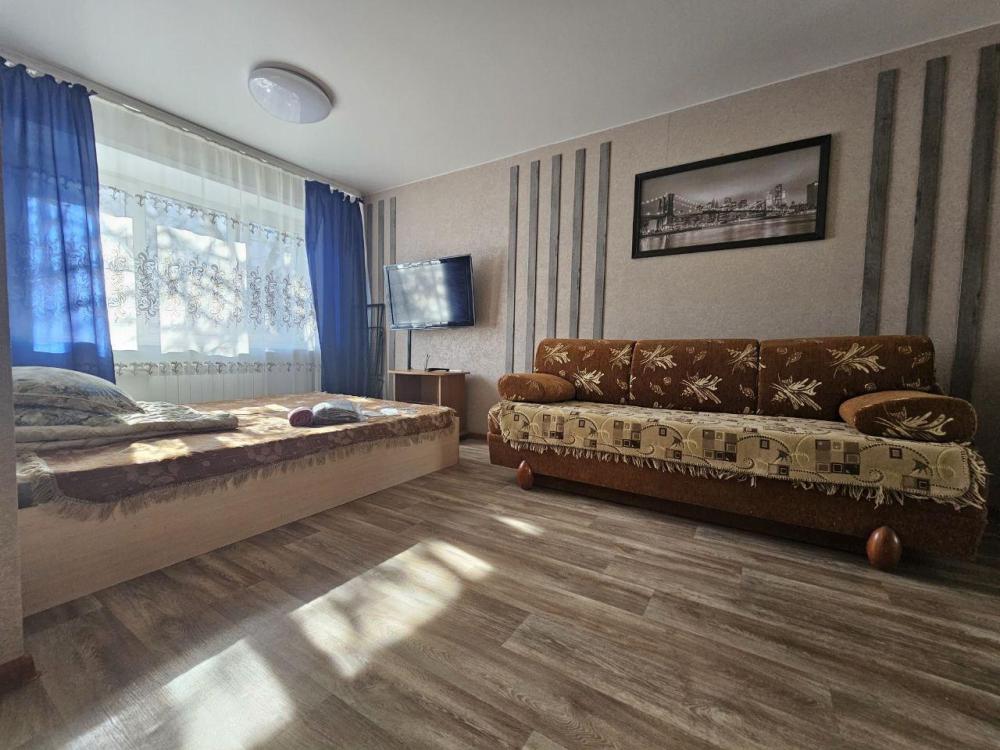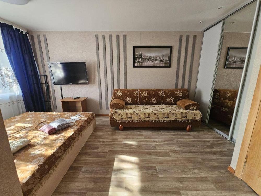 Однокомнатные апартаменты, оборудованные всем необходимым для комфортного проживания. В апартаментах: двуспальная кровать, диван, кухня, оборудованная необходимой техникой и посудой, стиральная машина, санузел с ванной.
