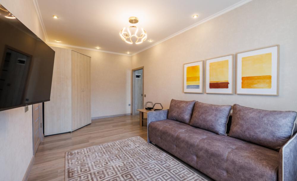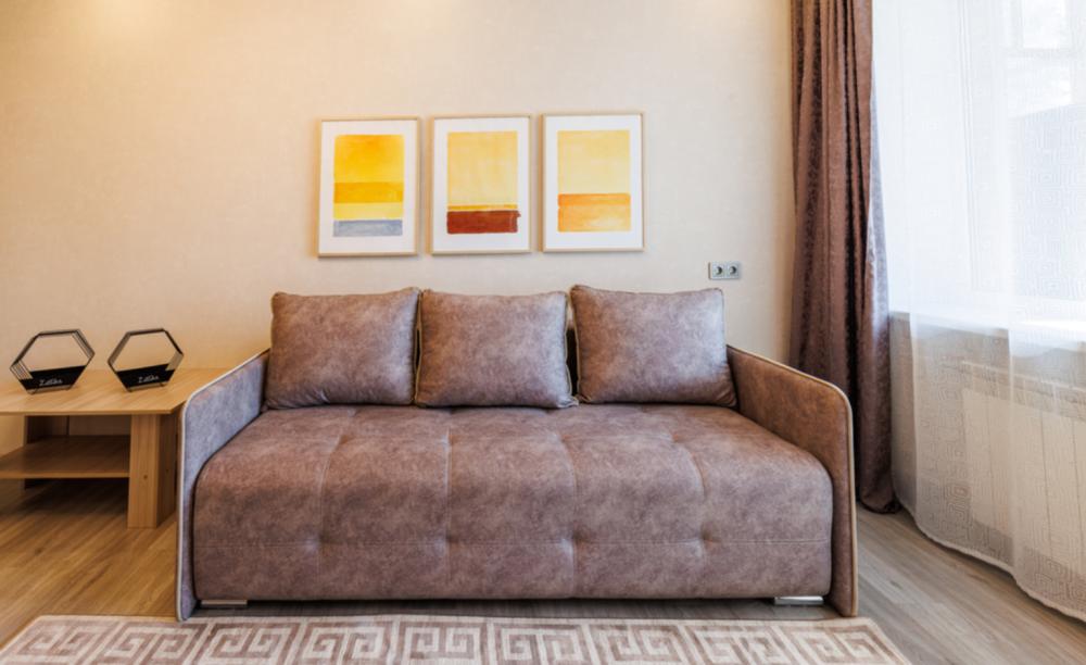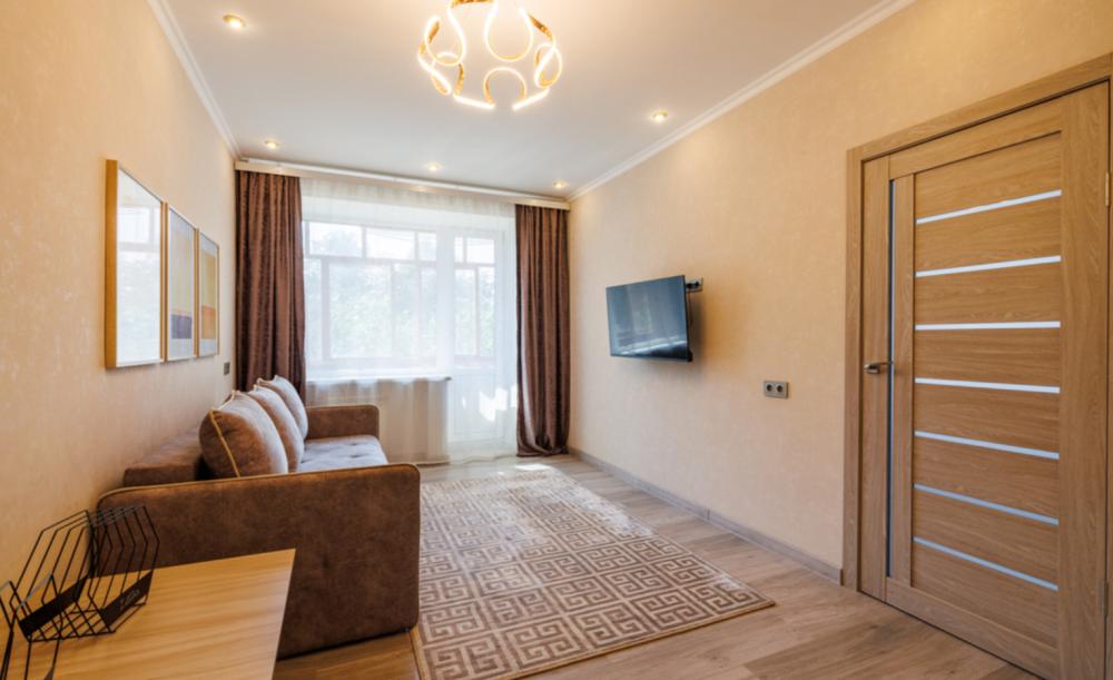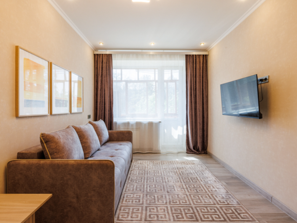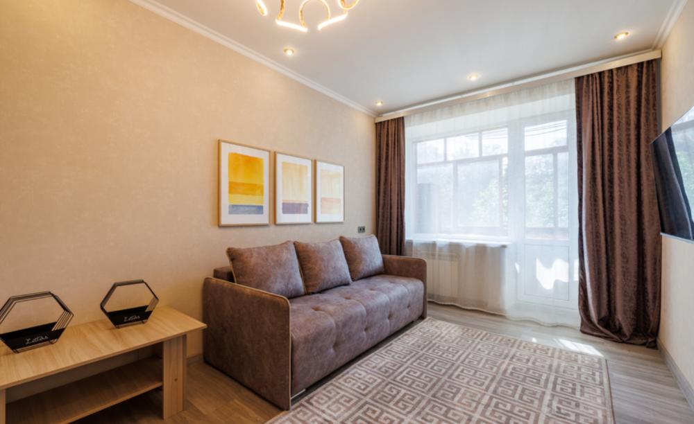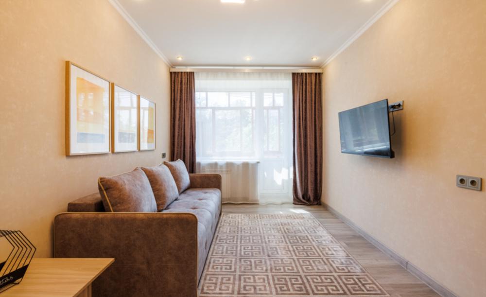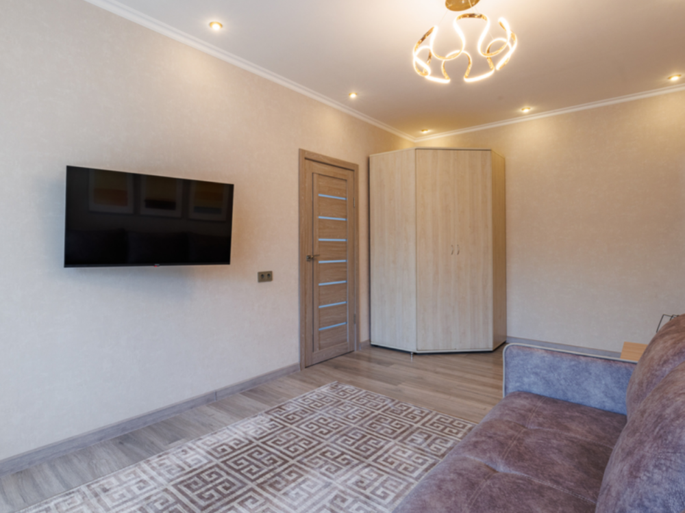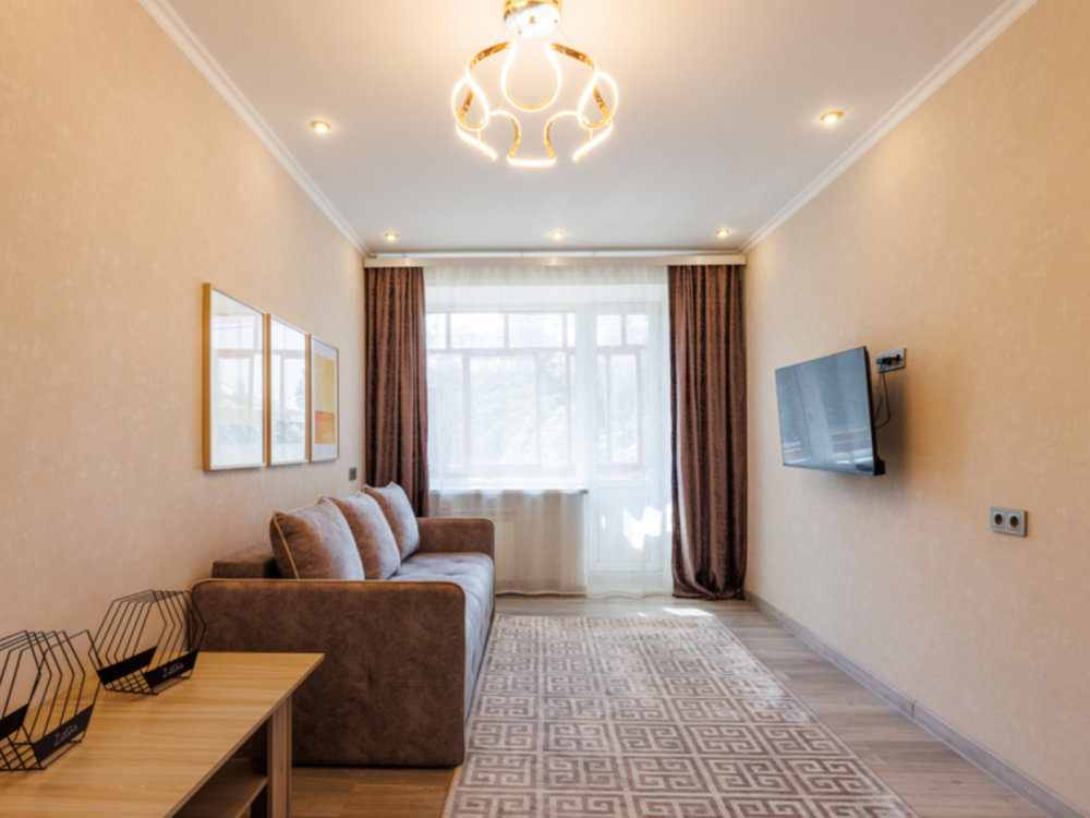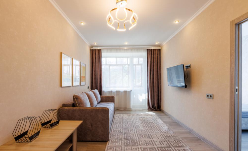 Для комфортного проживания гостей апартаменты оборудованы всем необходимым включая: фен, утюг, стиральная машина, чайник, микроволновка, плита, холодильник, телевизор, WI-FI, столовые приборы и базовая посуда, чай и кофе. Гостям предоставляются полотенца, гель для душа, свежее постельное белье и тапочки. Кровати: 1 диван-кровать, 1 двуспальная. Общая площадь: 45 м², этаж: 4 из 5.