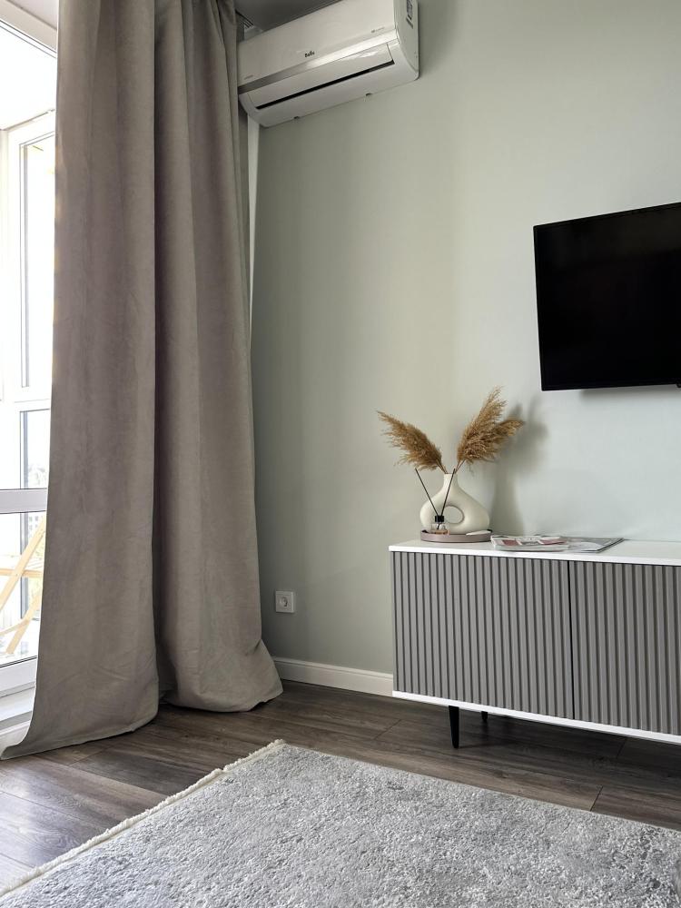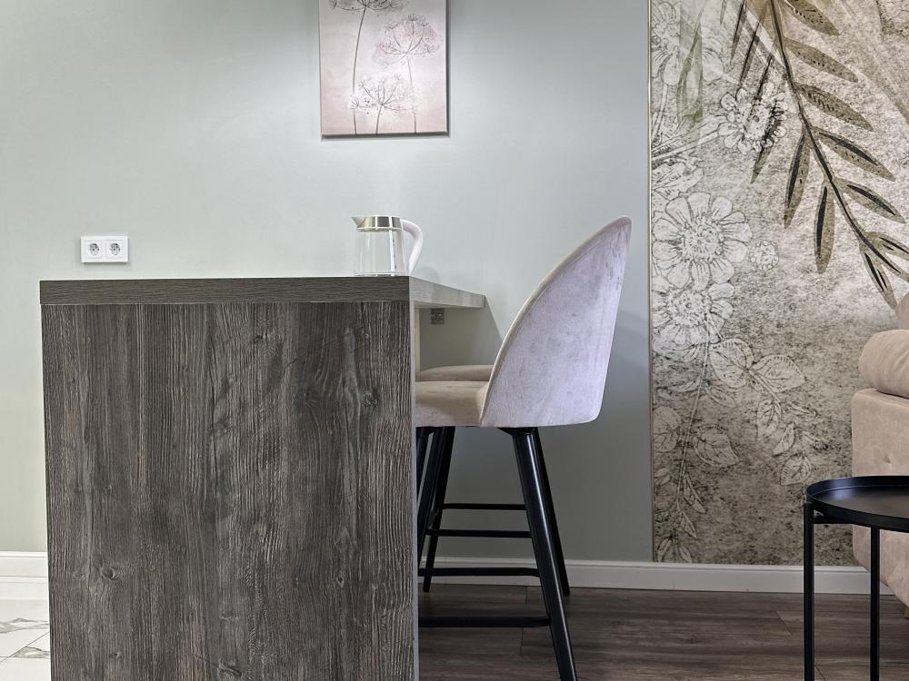 В апартаментах возможно размещение 4 гостей. Спальные места: двуспальная кровать, раскладной диван. Кухня оборудована необходимой посудой и техникой: индукционная варочная панель, микроволновка, чайник, холодильник, посудомоечная машина. К услугам гостей также wi-fi, телевизор, кондиционер, стиральная машина, фен, утюг, гладильная доска, сушилка, постельное белье, полотенца.