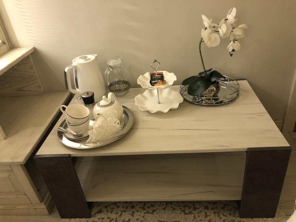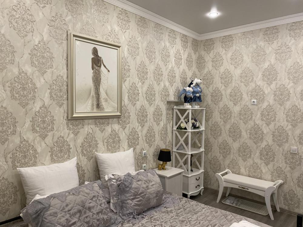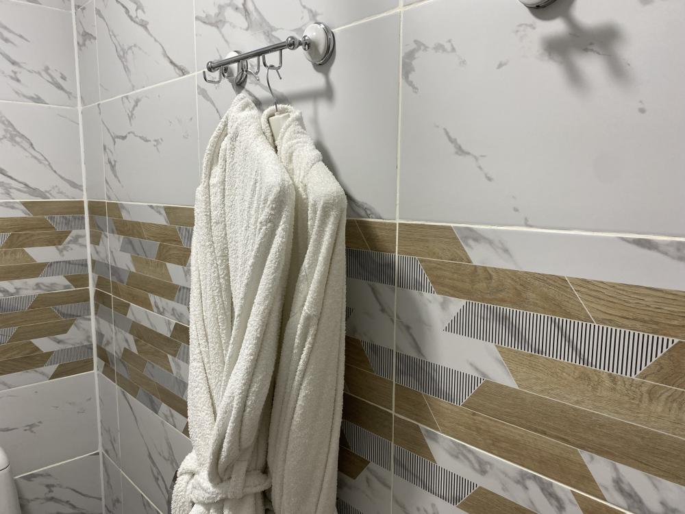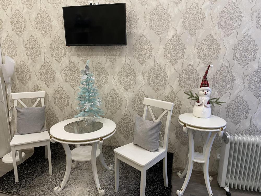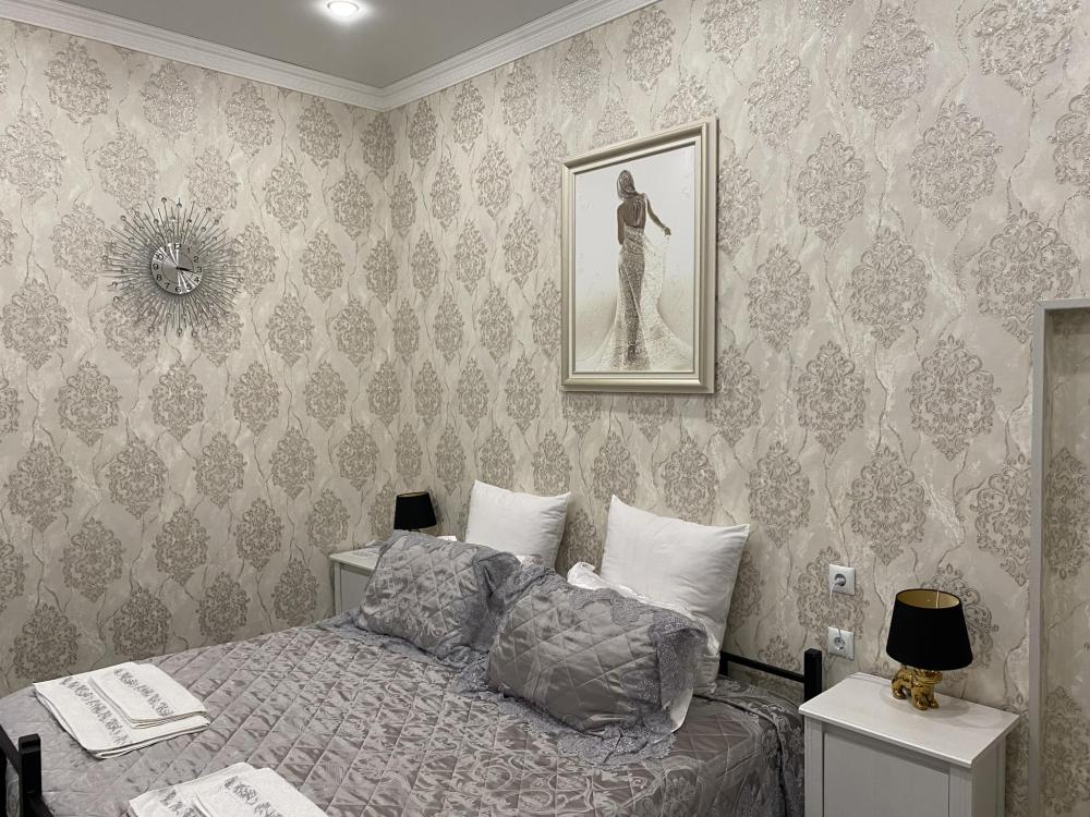 Номер Люкс выполнен в классическом стиле. Большая комната в нежно сером цвете. Дизайнерская люстра и подсветка с пультом управления во всем номере придаст романтического настроения нашим гостям. Большая двухспальная кровать с удобным матрасом. Телевизор со множеством развлекательных каналов. Белоснежные халаты и тапочки. В ванной комнате имеется всё необходимое для гигиены. Всегда в стоимость входят: гели, шампуни, зубные и бритвенные наборы, мыло, шапочка для душа. Так же имеются крема. Фен.