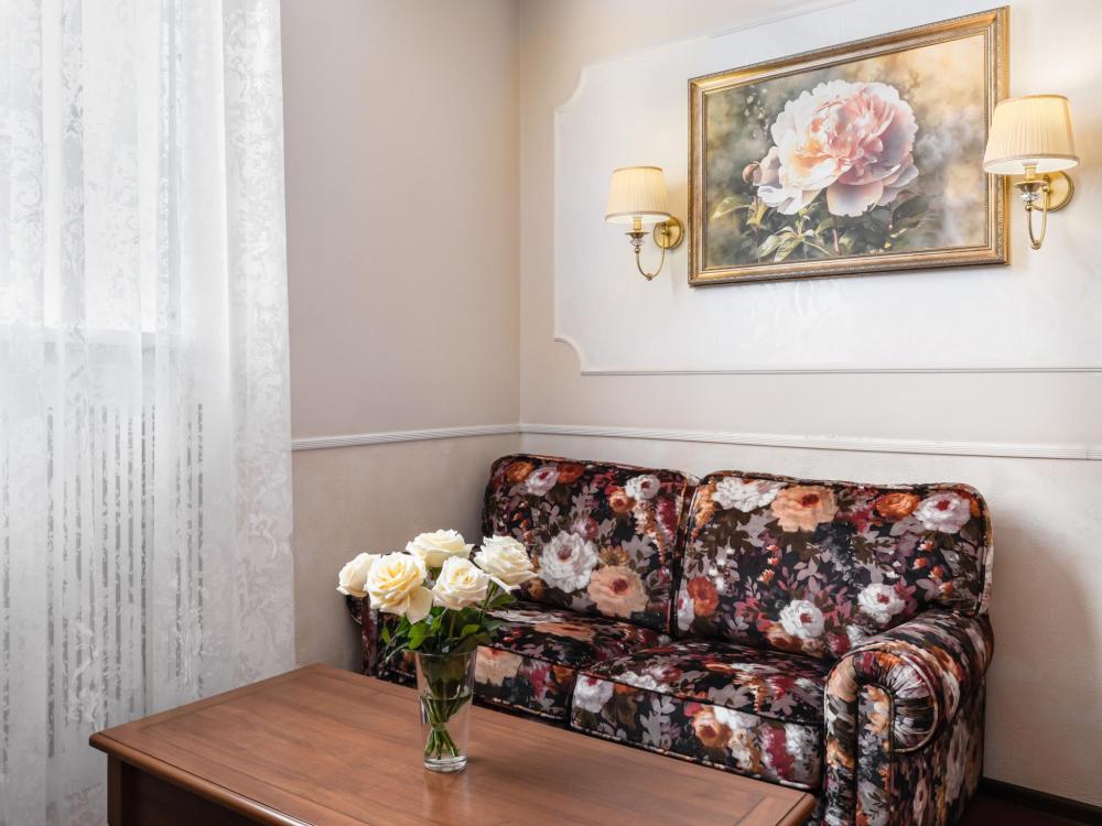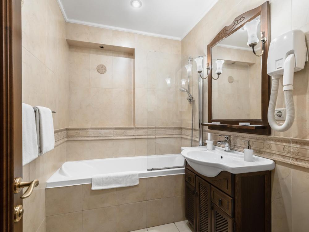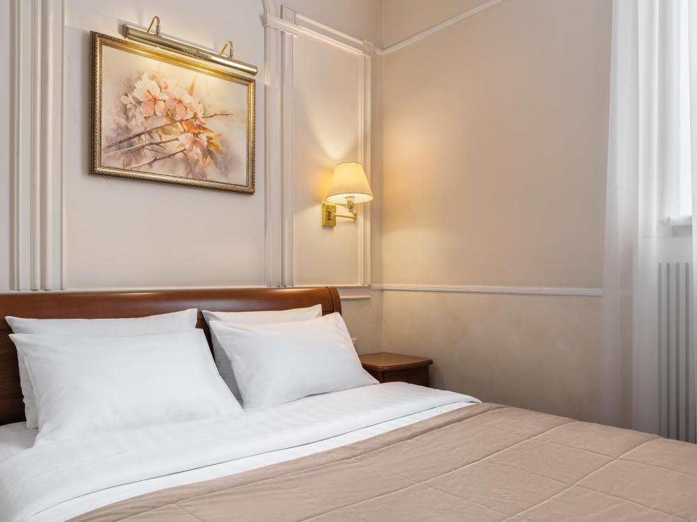 Двухкомнатный номер с одной двуспальной кроватью, ширина которой 160 см. В номере есть Wi-Fi, телевидение, кондиционер, мини-холодильник, фен, косметические принадлежности, тапочки.