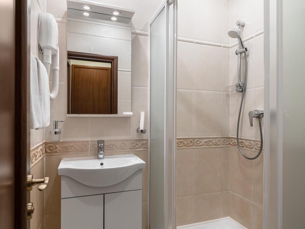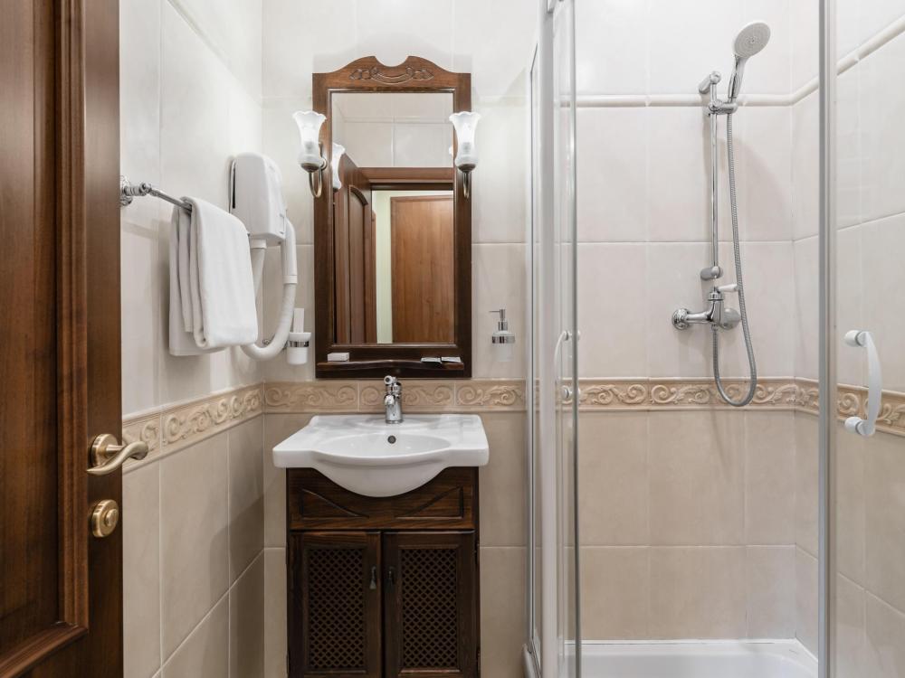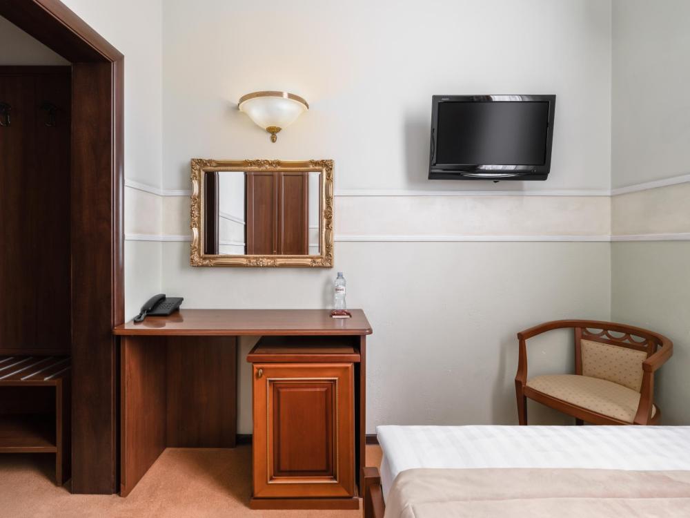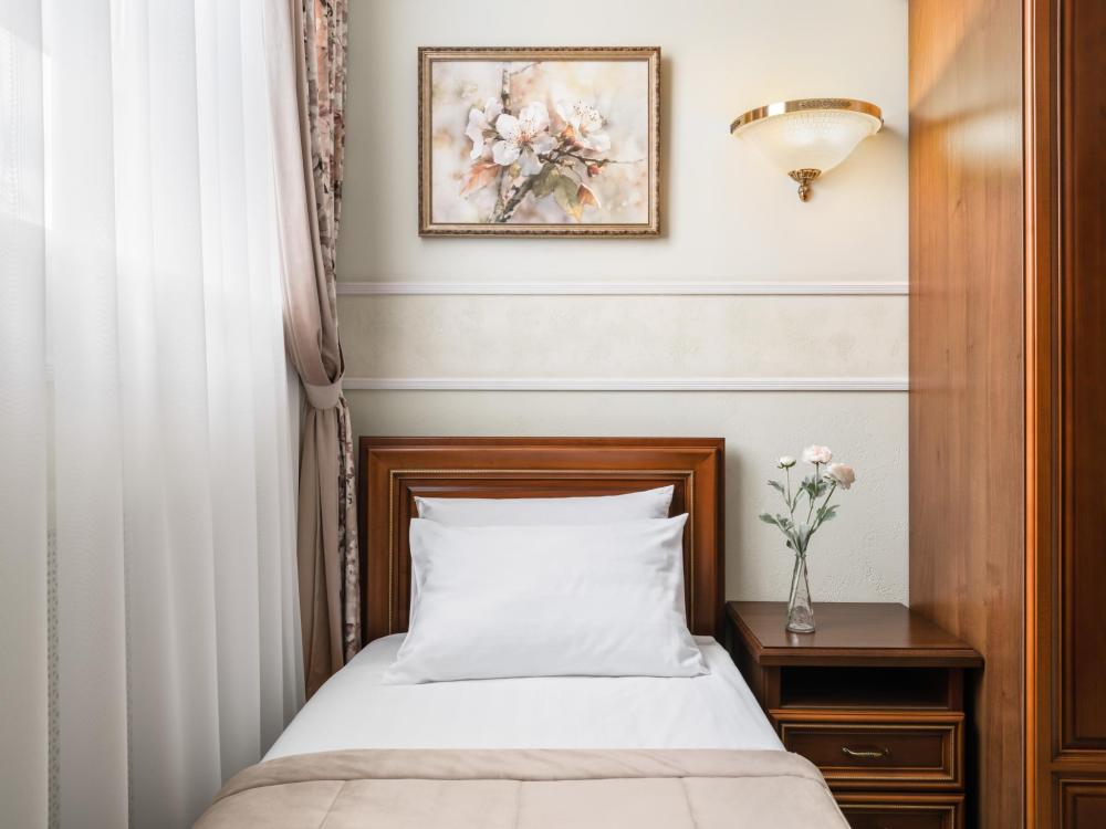 Однокомнатный номер с одной односпальной кроватью, ширина которой 90 см. В номере есть Wi-Fi, телевидение, кондиционер, мини-холодильник, фен, косметические принадлежности, тапочки.