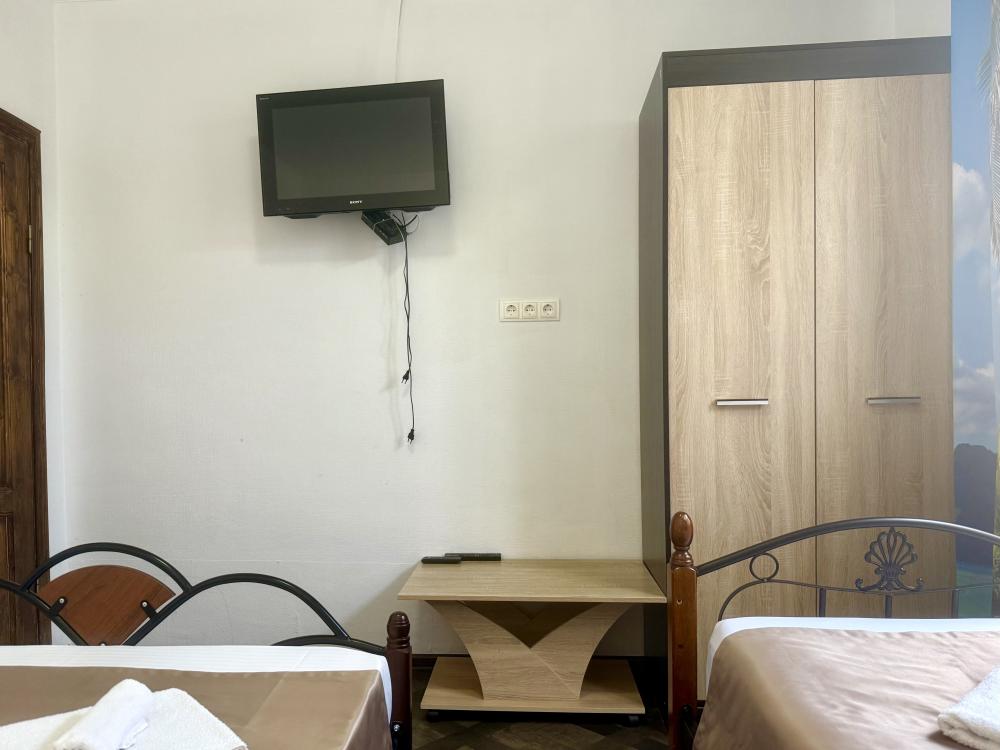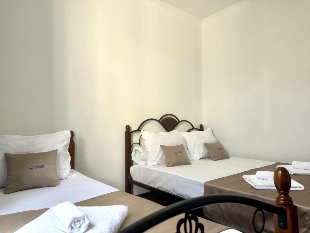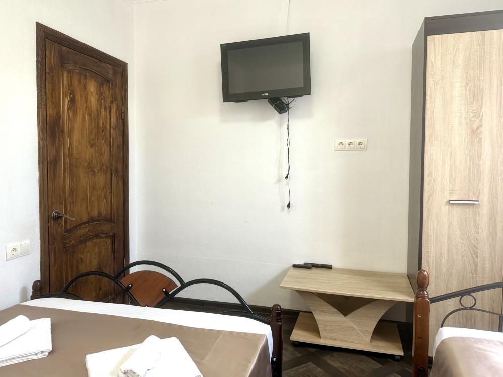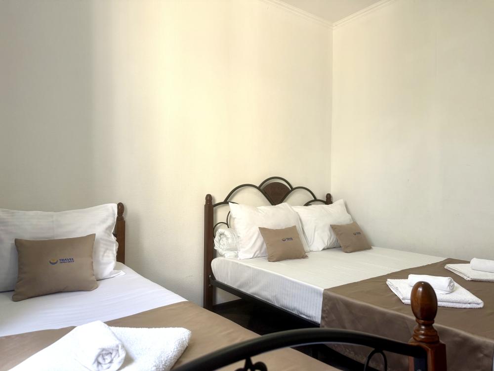 Уютная двухместная комната с двумя односпальными кроватями. В комнате есть индивидуальная ванная комната с косметическими принадлежностями, телевизор и шкаф. В доме предусмотрена общая гостиная с кухонной зоной, где имеется вся необходимая мебель, столовые приборы и бытовая техника.
