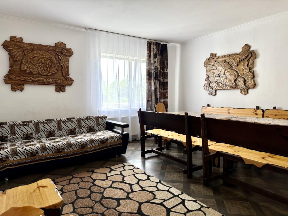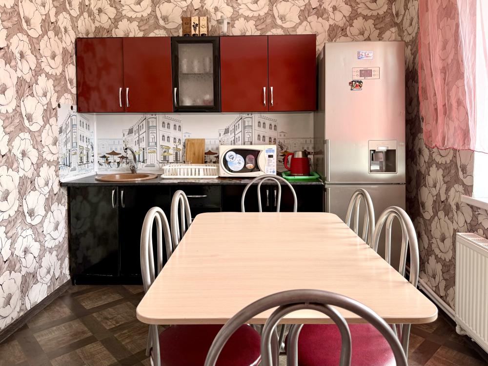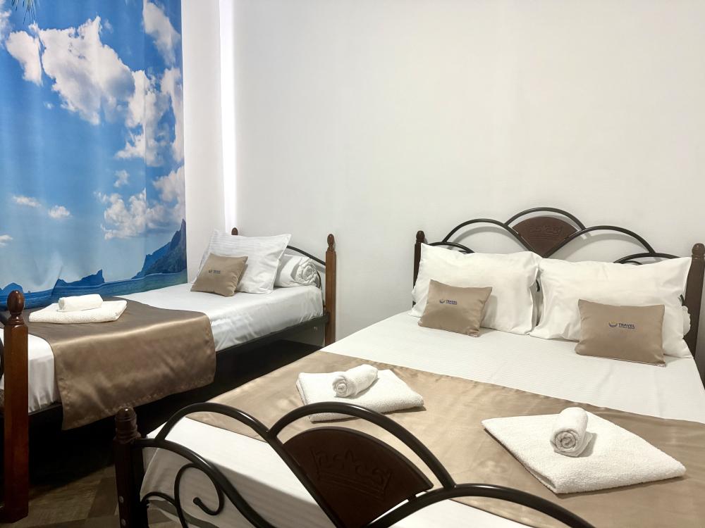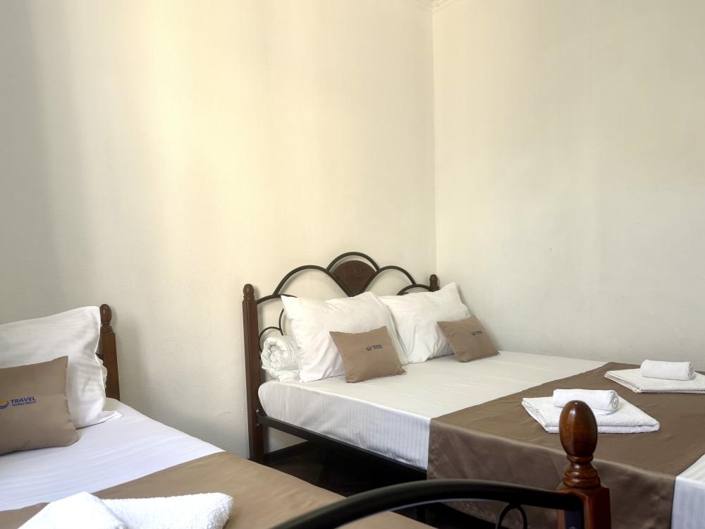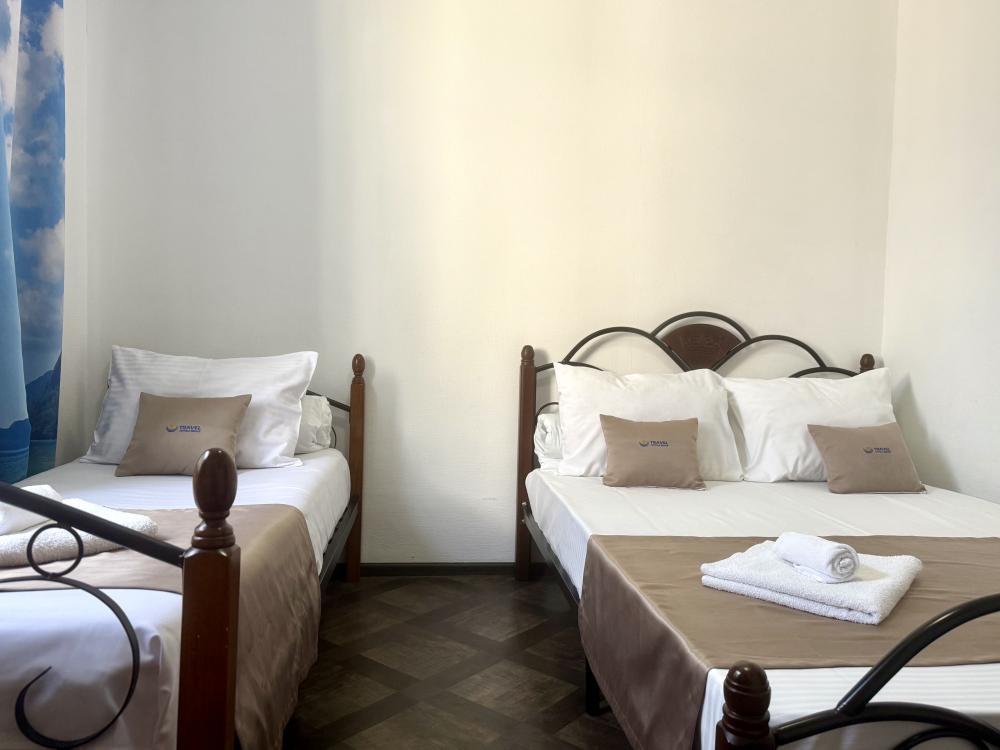 Уютная двухместная комната с двумя односпальными кроватями. В комнате есть индивидуальная ванная комната с косметическими принадлежностями, телевизор и шкаф. В доме предусмотрена общая гостиная с кухонной зоной, где имеется вся необходимая мебель, столовые приборы и бытовая техника.