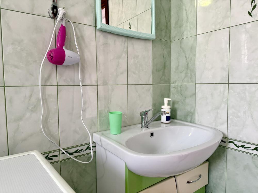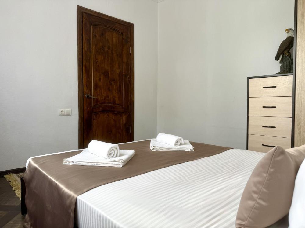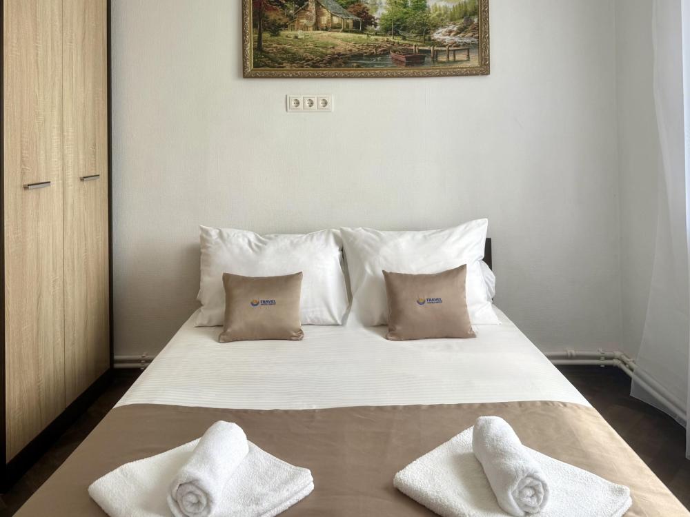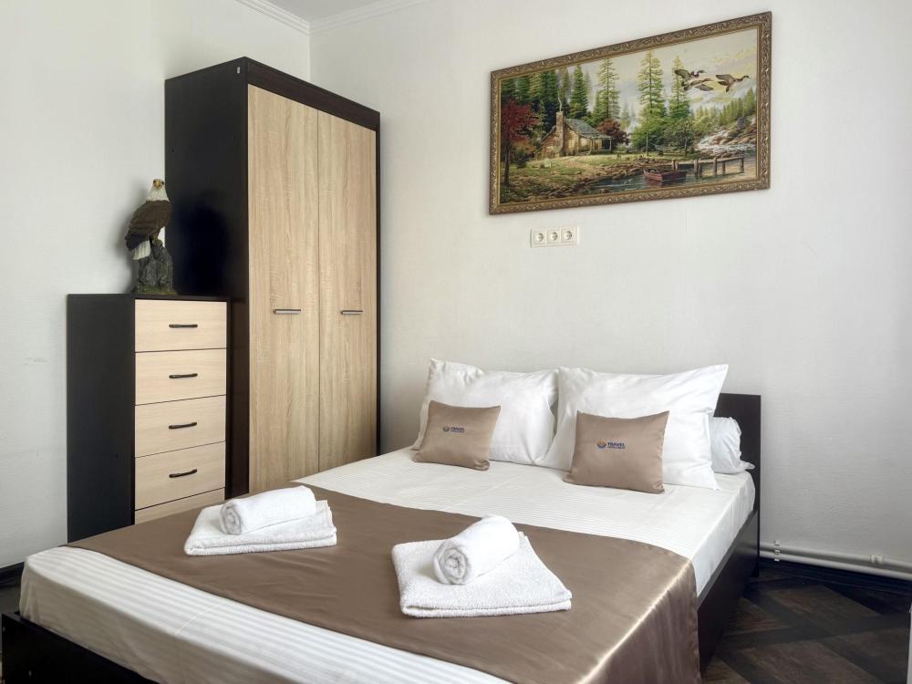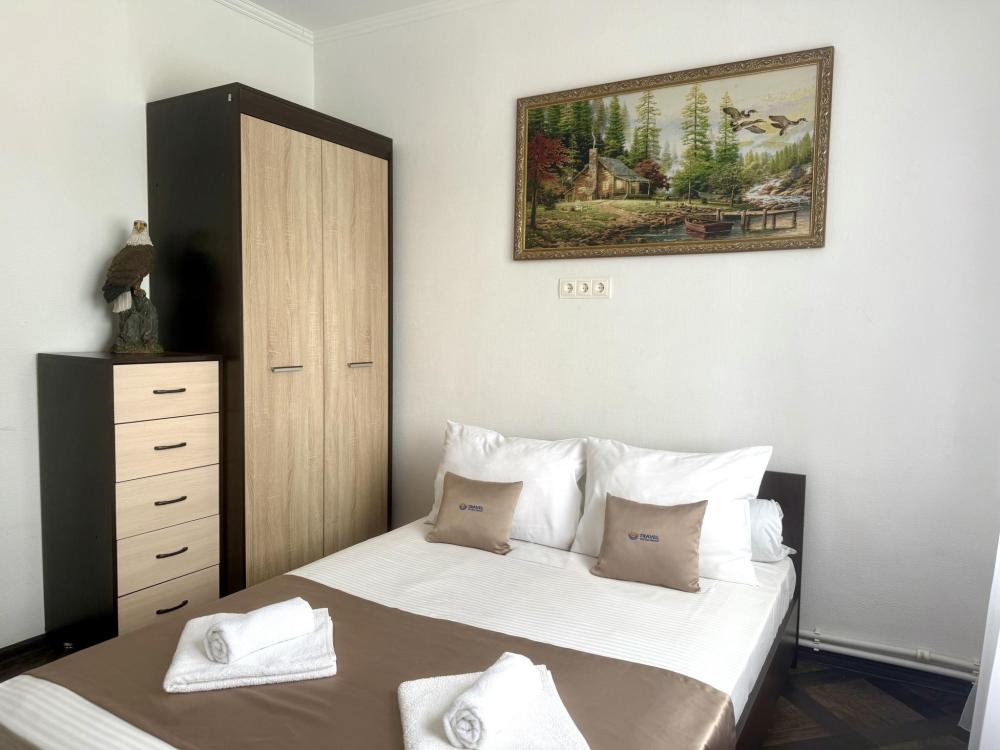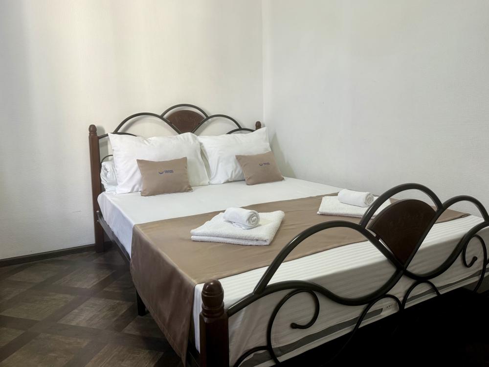 Уютная двухместная комната с большой двуспальной кроватью. В комнате есть индивидуальная ванная комната с косметическими принадлежностями, телевизор и шкаф. В доме предусмотрена общая гостиная с кухонной зоной, где имеется вся необходимая мебель, столовые приборы и бытовая техника.