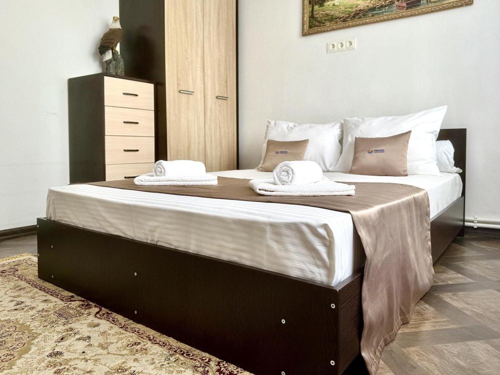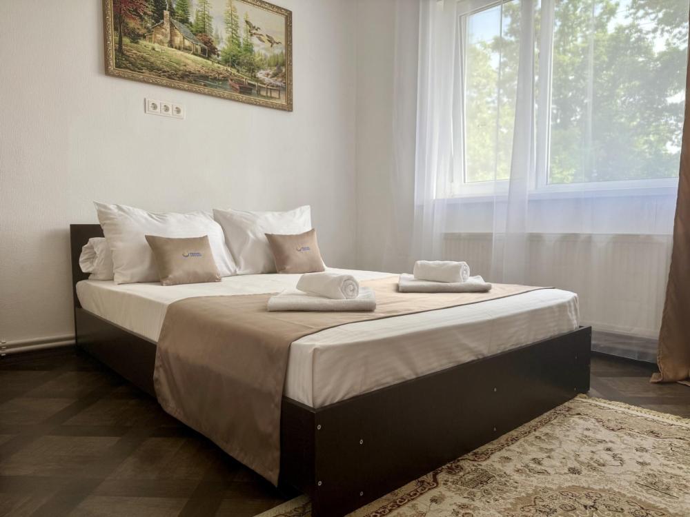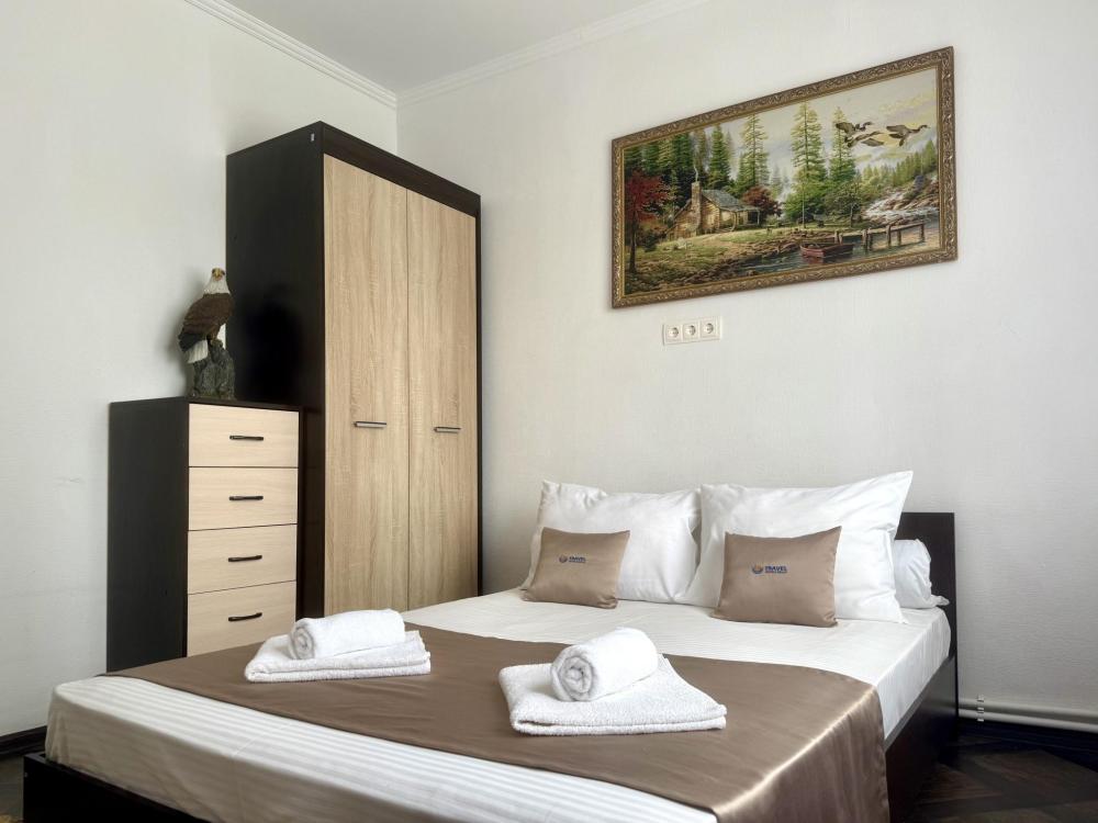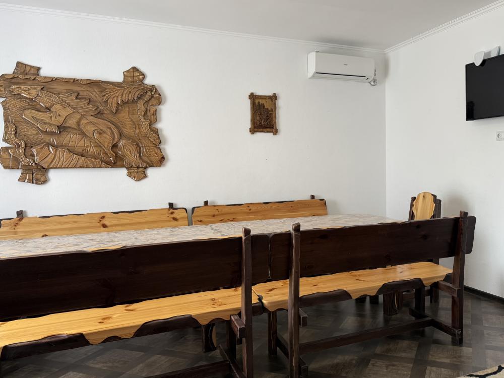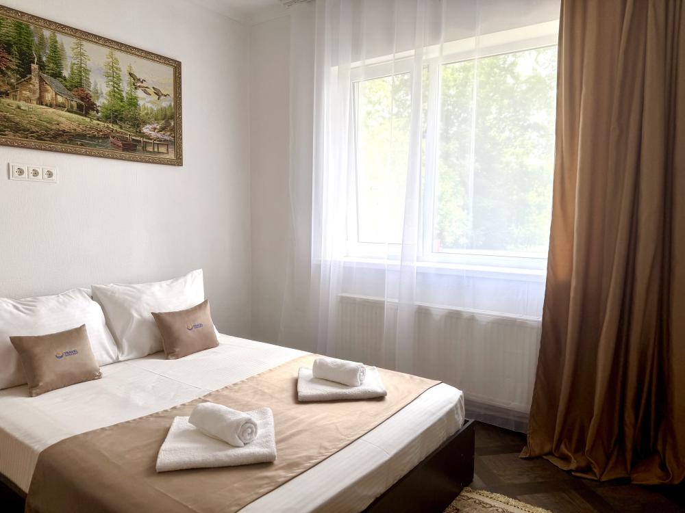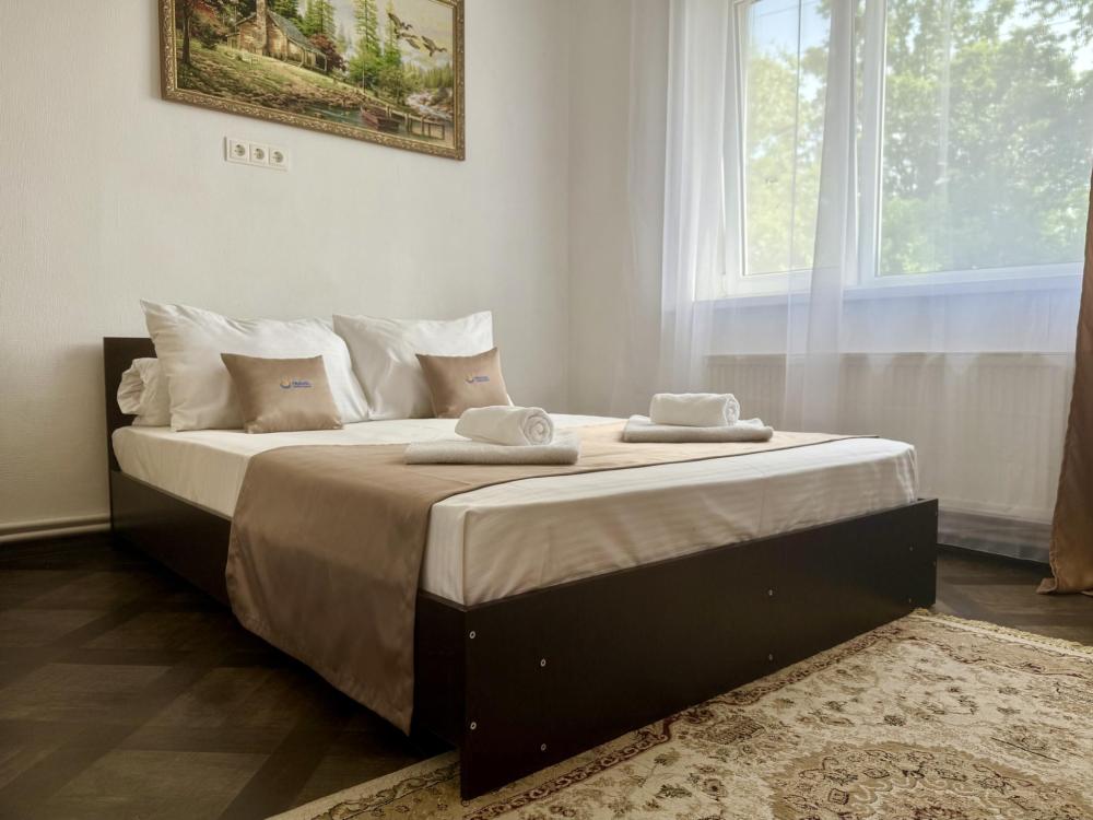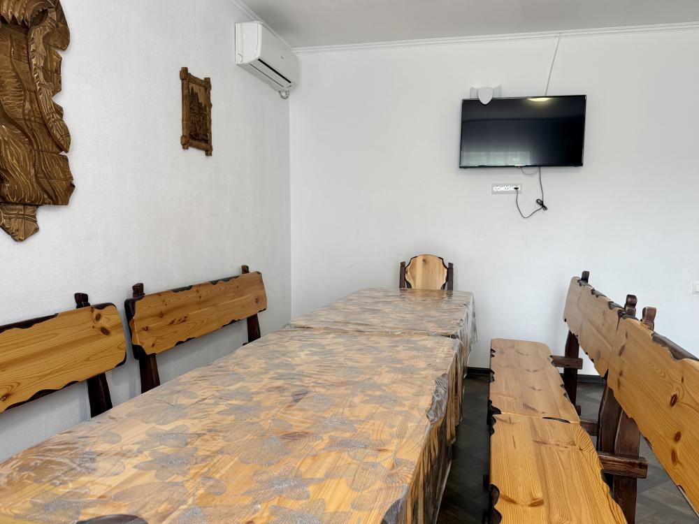 Уютная двухместная комната с большой двуспальной кроватью. В комнате есть индивидуальная ванная комната с косметическими принадлежностями, телевизор и шкаф. В доме предусмотрена общая гостиная с кухонной зоной, где имеется вся необходимая мебель, столовые приборы и бытовая техника.
