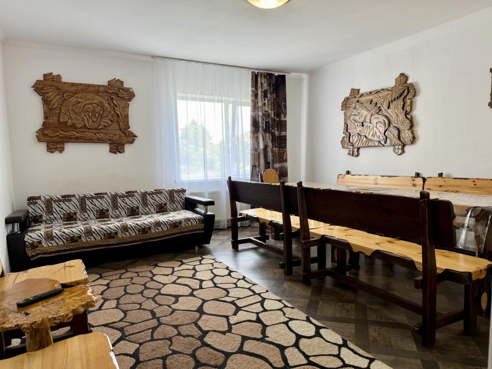 В доме: две двуспальные кровати, одна односпальная кровать, телевизор, шкаф, кухонная зона с электрическим чайником и микроволновой печью.