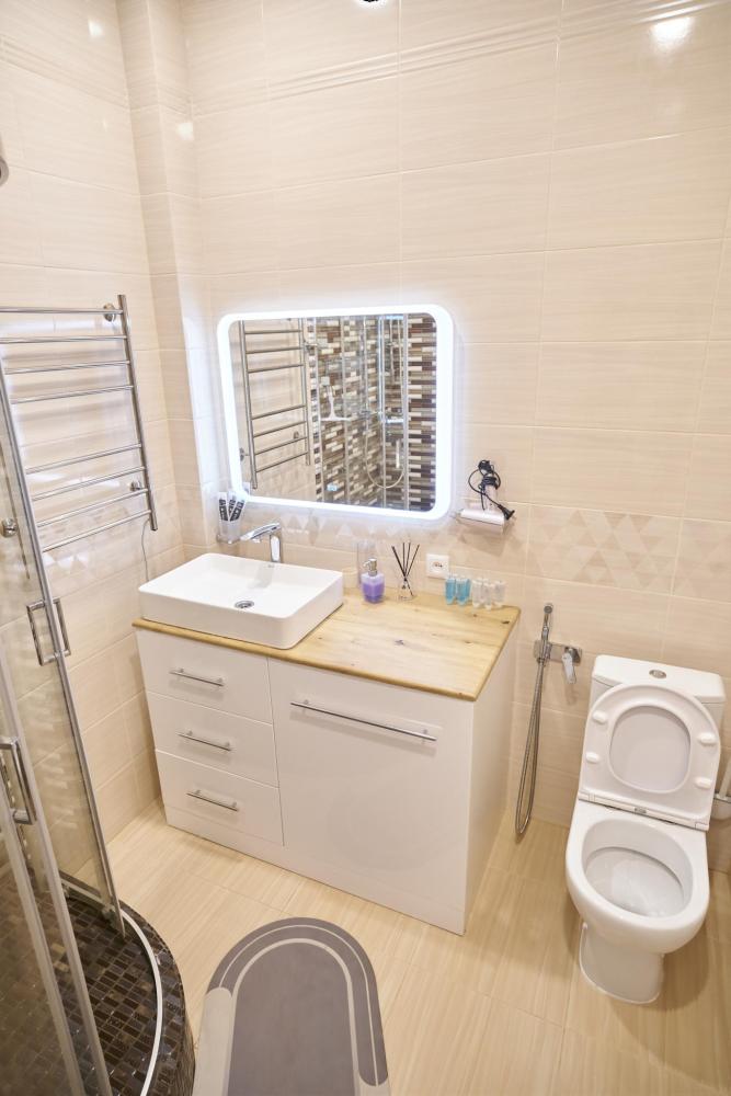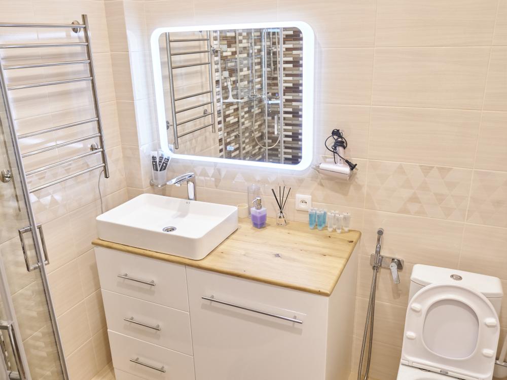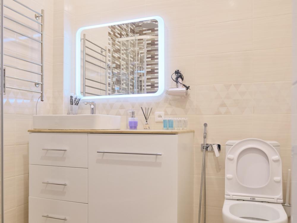 В ванной комнате чисто и уютно: горячая вода, душ, свежие полотенца, средства гигиены, стиральная машина и фен. Квартира регулярно убирается, а постельное бельё меняется, что обеспечивает высокий уровень чистоты и комфорта для гостей.