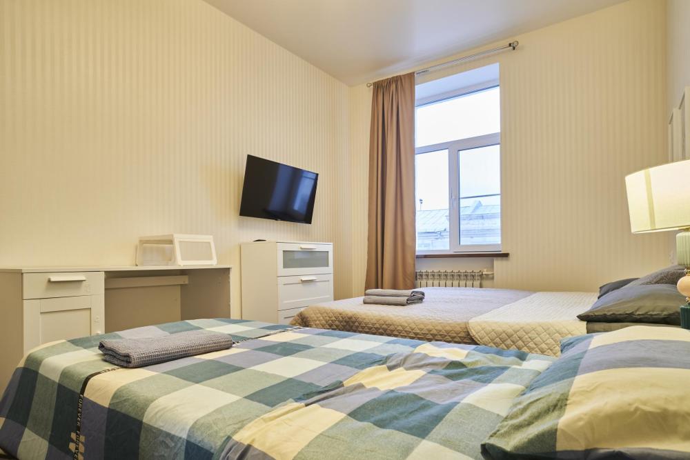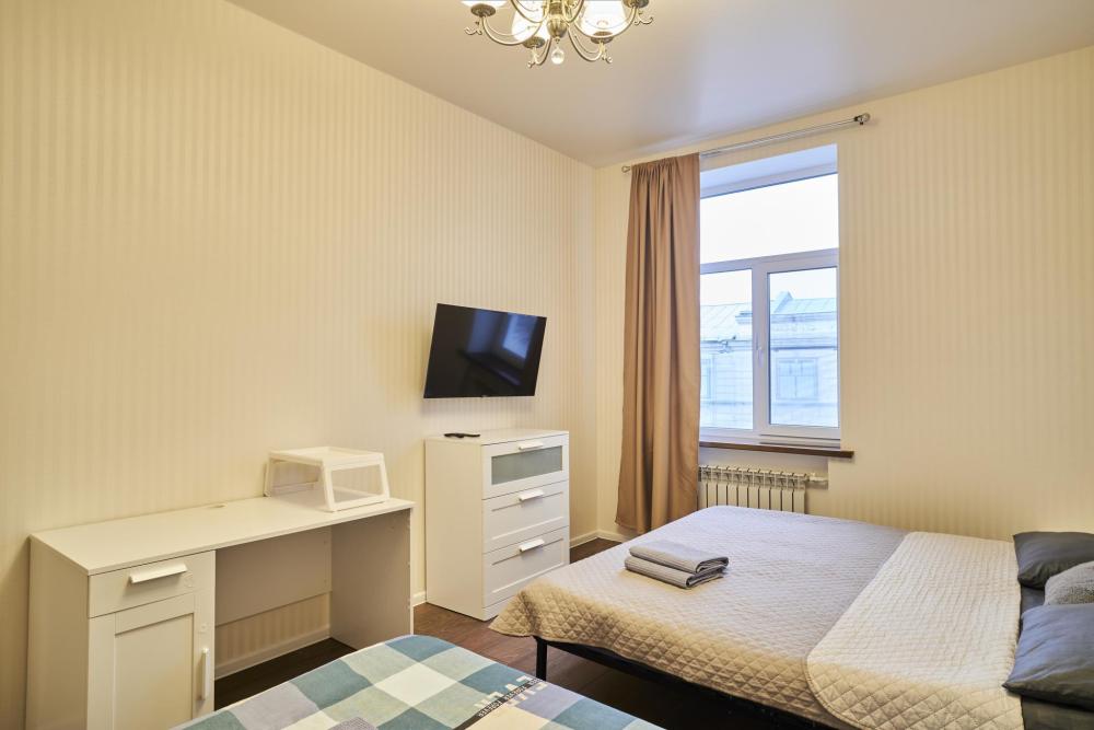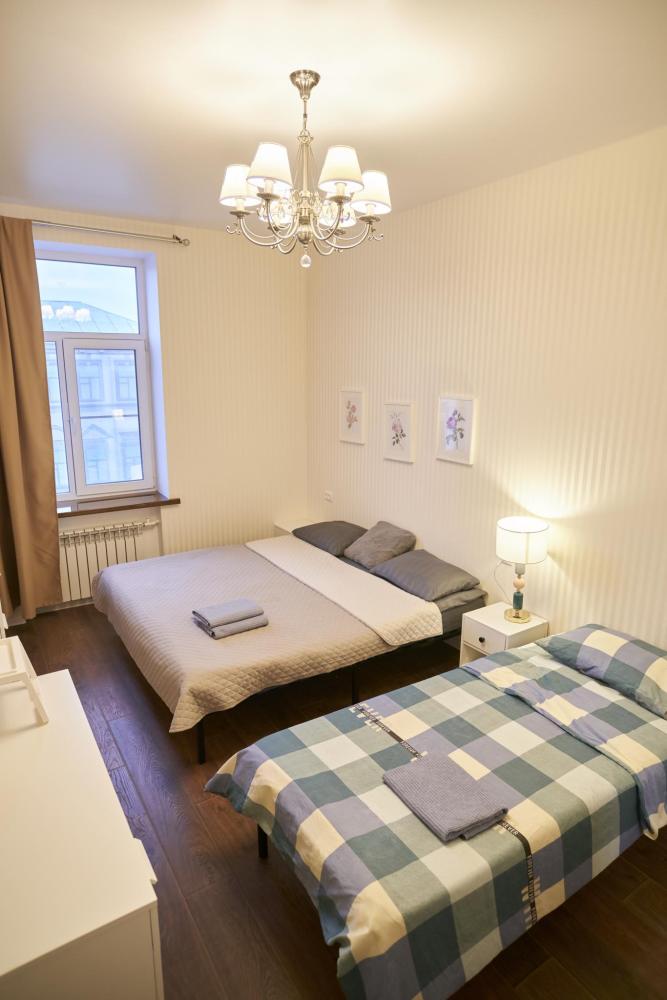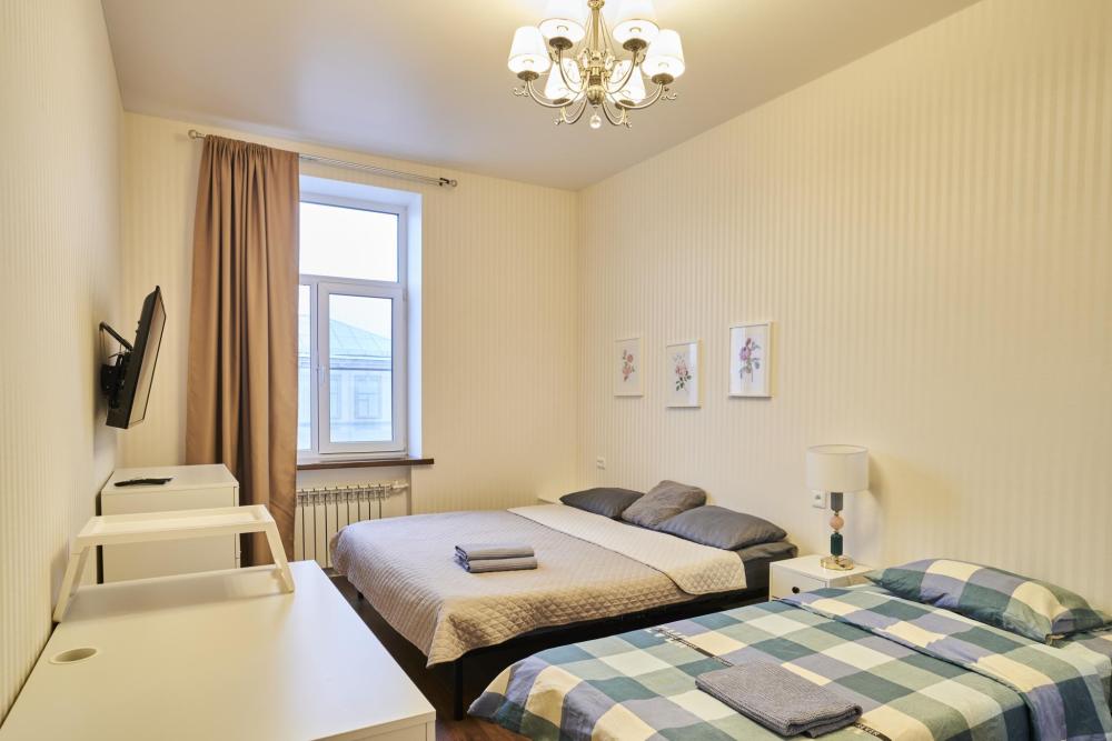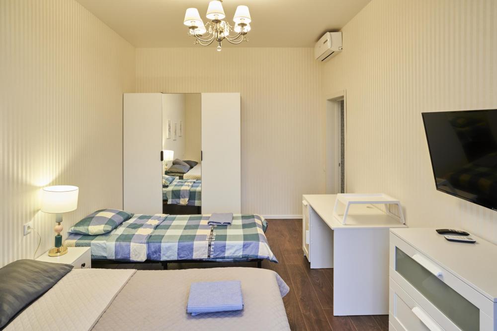 Спальные места рассчитаны на удобное проживание до 7 человек. В одной комнате расположена двуспальная кровать, идеально подходящая для пары, а также раскладной диван, на котором может разместиться еще один взрослый или два ребёнка. В остальных комнатах находятся три односпальные кровати, что делает квартиру удобной для семьи с детьми или небольшой группы друзей. Все кровати оснащены качественными матрасами, чистым постельным бельём, мягкими подушками и пледами.