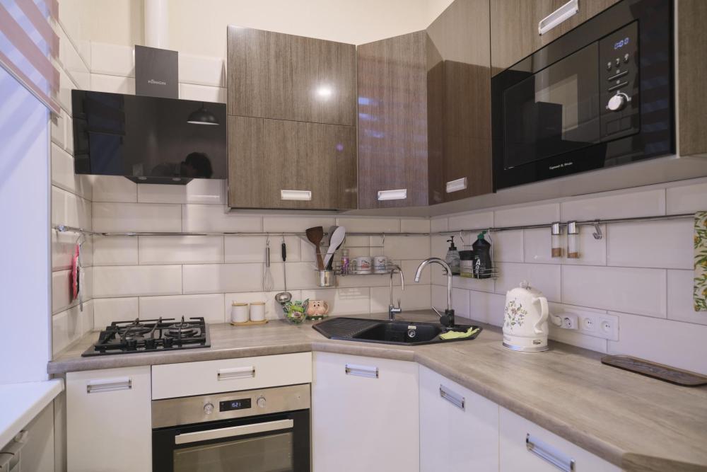 Кухня полностью оборудована всем необходимым: плита, микроволновая печь, холодильник, чайник, полный набор посуды, столовые приборы, кастрюли и сковородки. Здесь удобно готовить завтраки, обеды и ужины, а чай, кофе и сахар уже предоставляются для гостей.