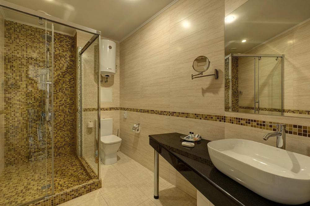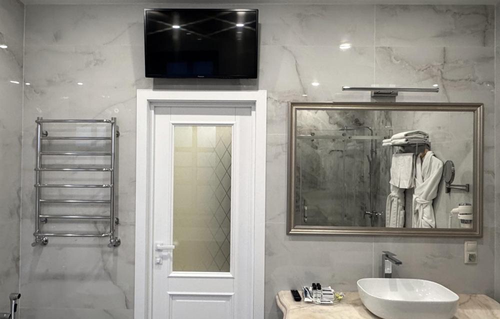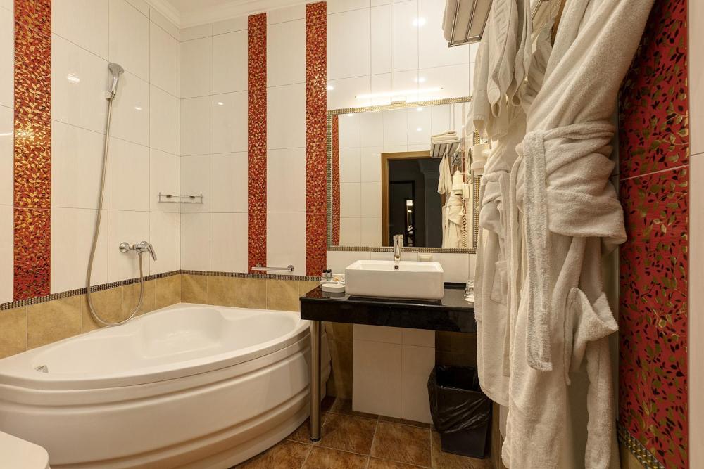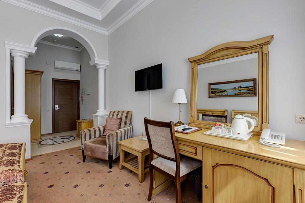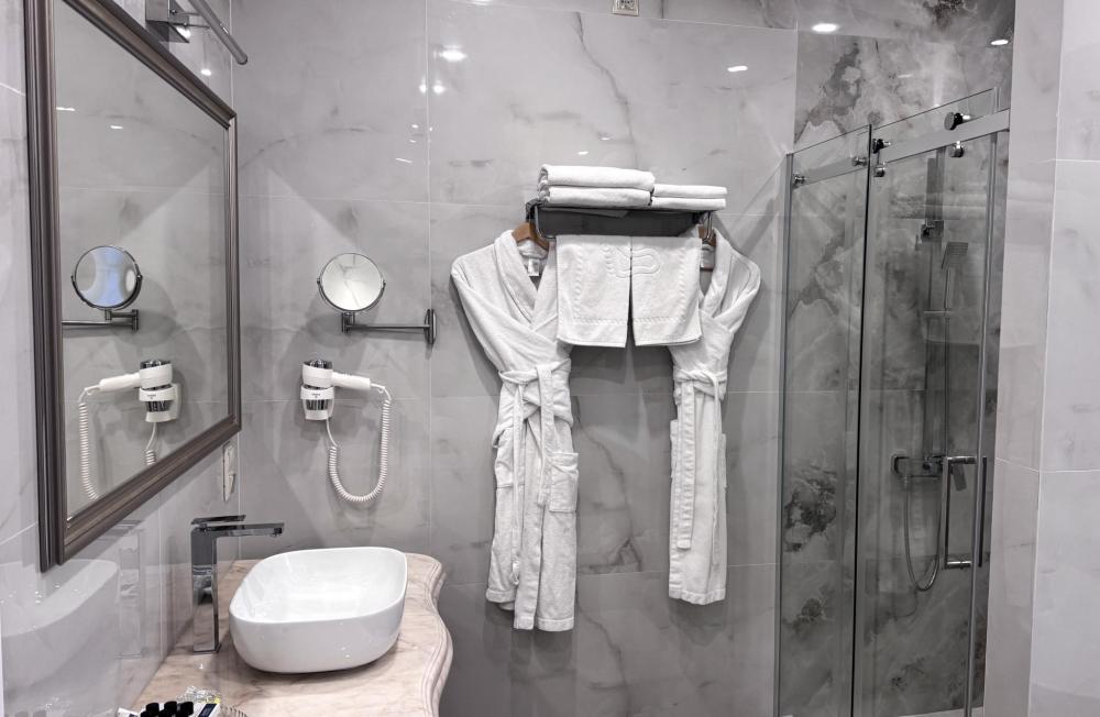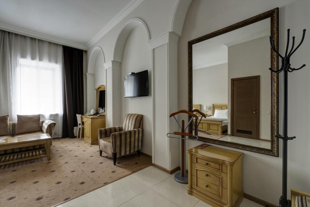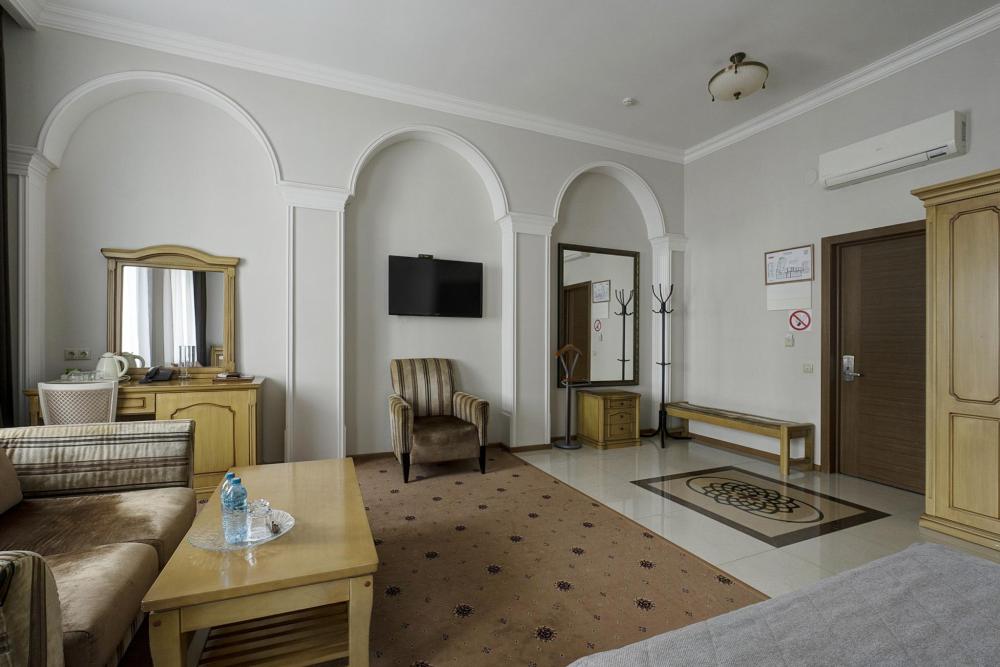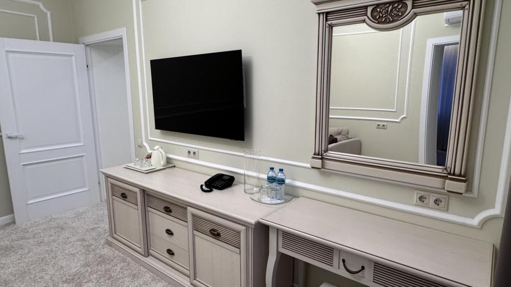 Двухкомнатный номер. В спальной комнате кровать 1,8*2м, прикроватные тумбы, плечики для одежды. В гостиной комнате диван, кресло, мебельный гарнитур, комплекс посуды, журнальный стол, торшер, телевизор, телефон, кондиционер, мини-бар. В санузле: душевая кабина с ванной, раковина, унитаз, набор туалетных принадлежностей, халаты, полотенца. В номере есть одноразовые тапочки.